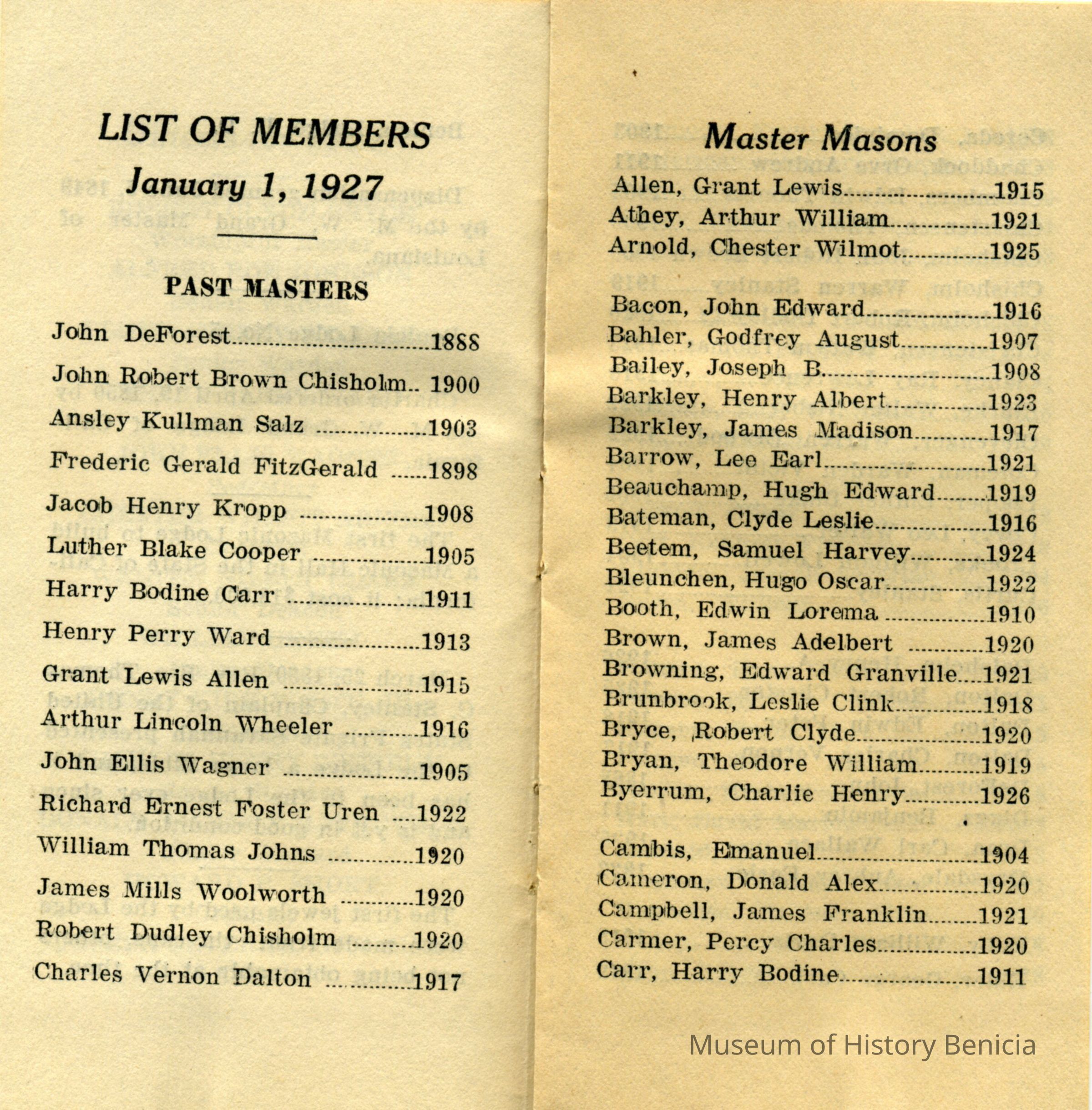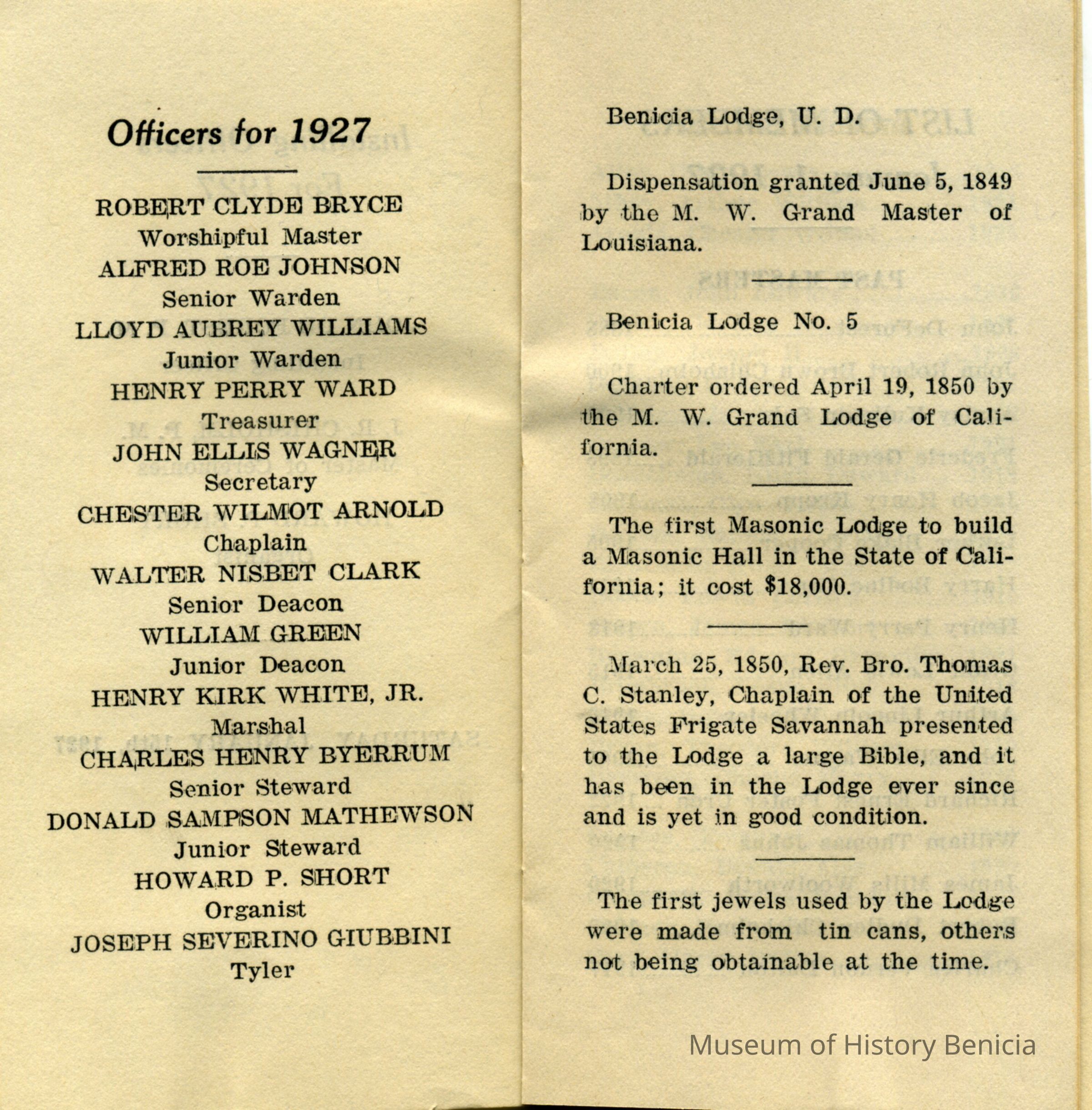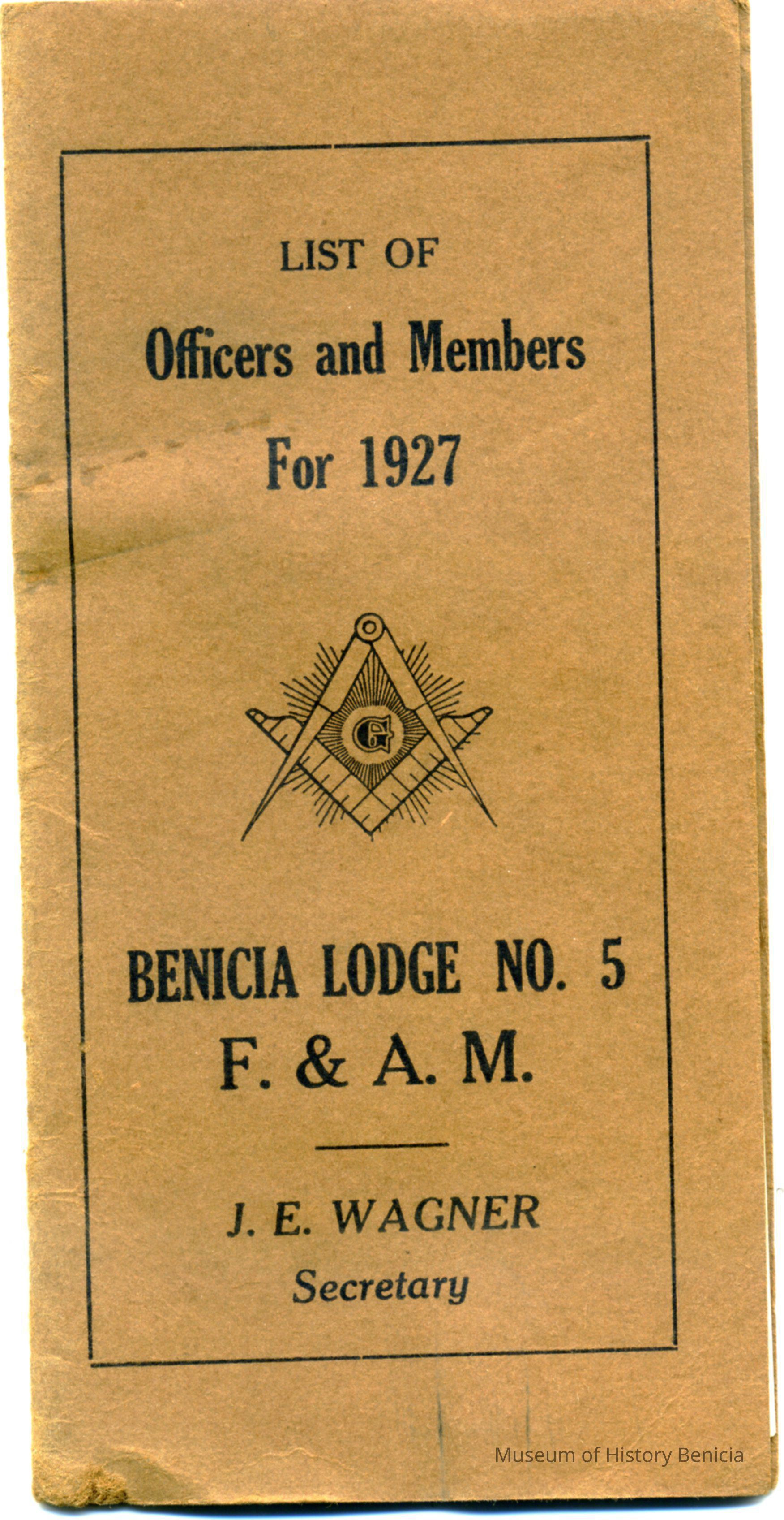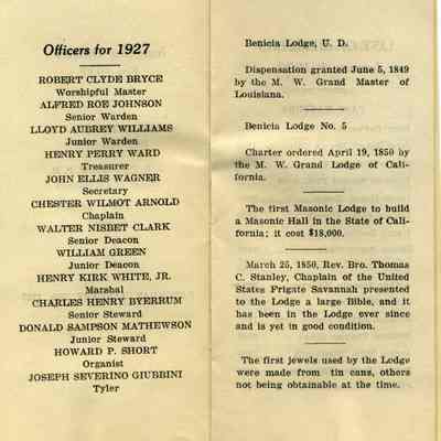 This is a booklet of the members and officers of the F. & M. A. (Masons) Benicia Lodge No. 5 for 1927. It lists Past Masters going back to 1888 and a little history of the Masons in Benicia.Collection