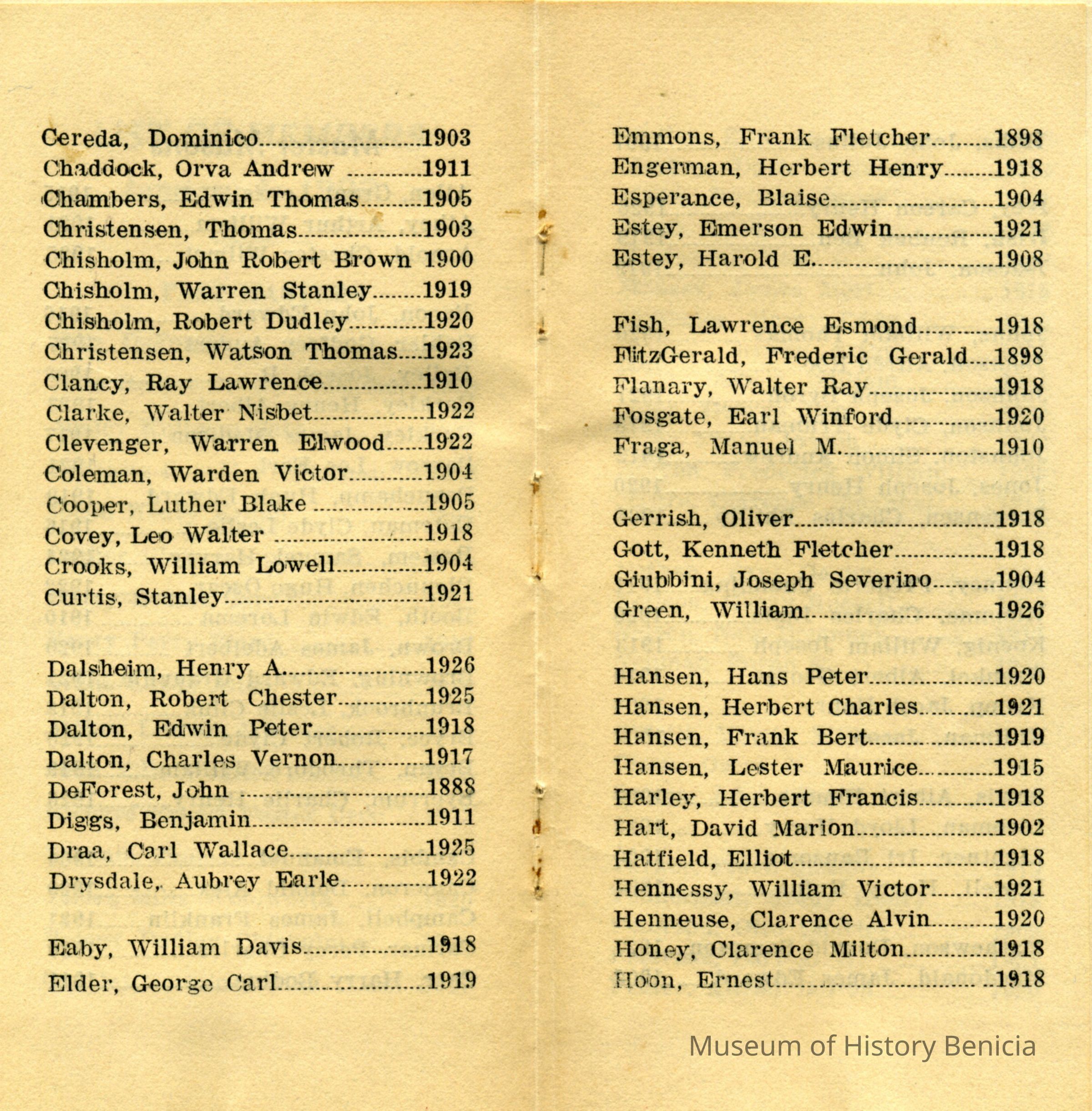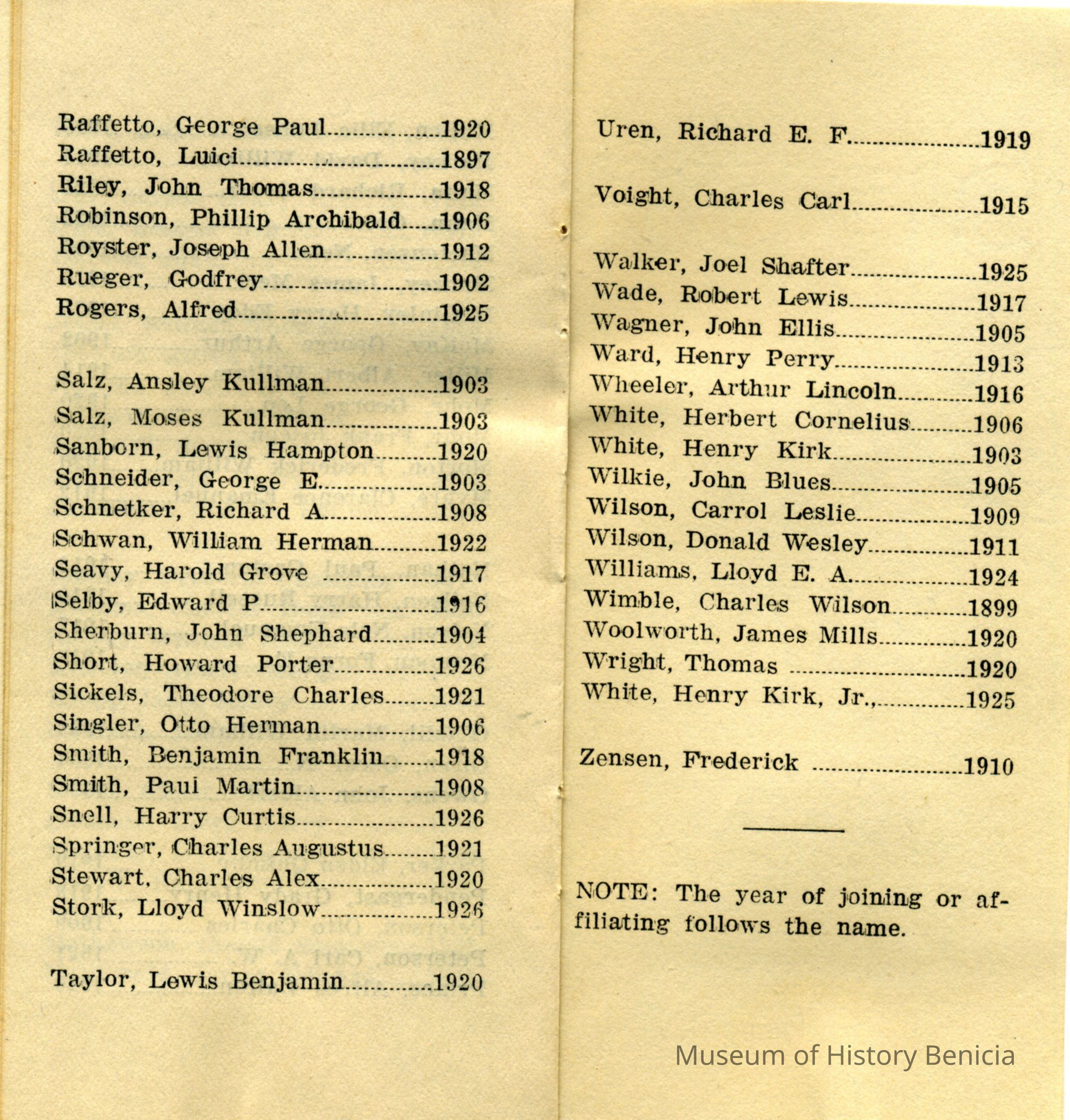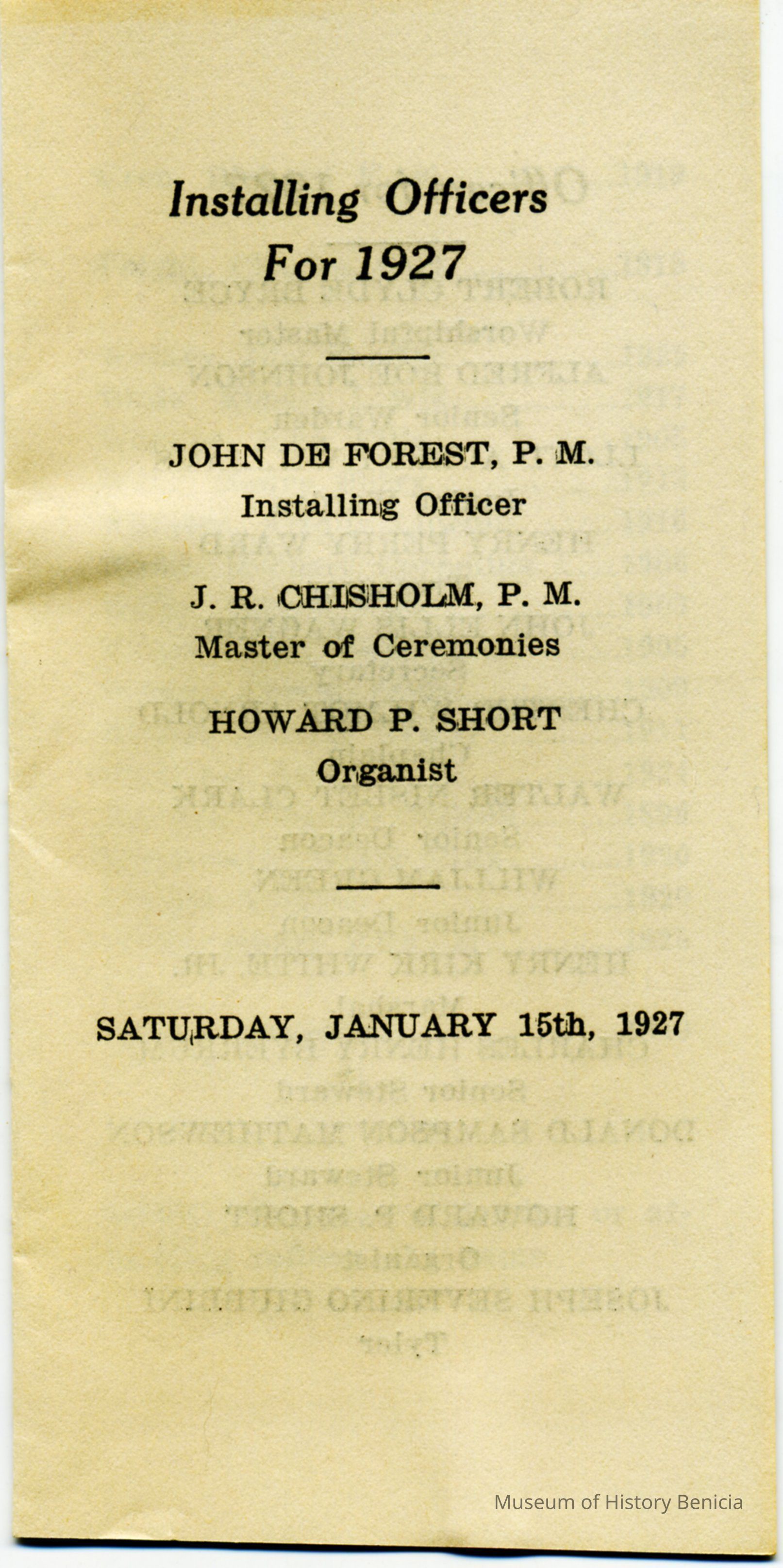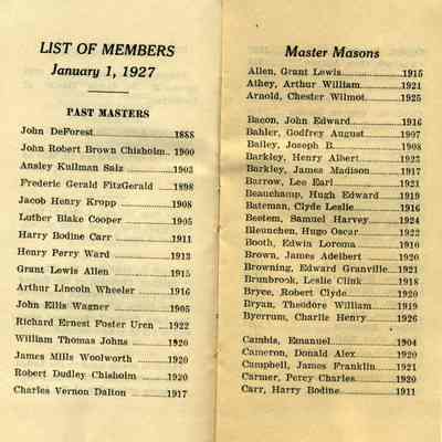 This is a booklet of the members and officers of the F. & M. A. (Masons) Benicia Lodge No. 5 for 1927. It lists Past Masters going back to 1888 and a little history of the Masons in Benicia.Collection