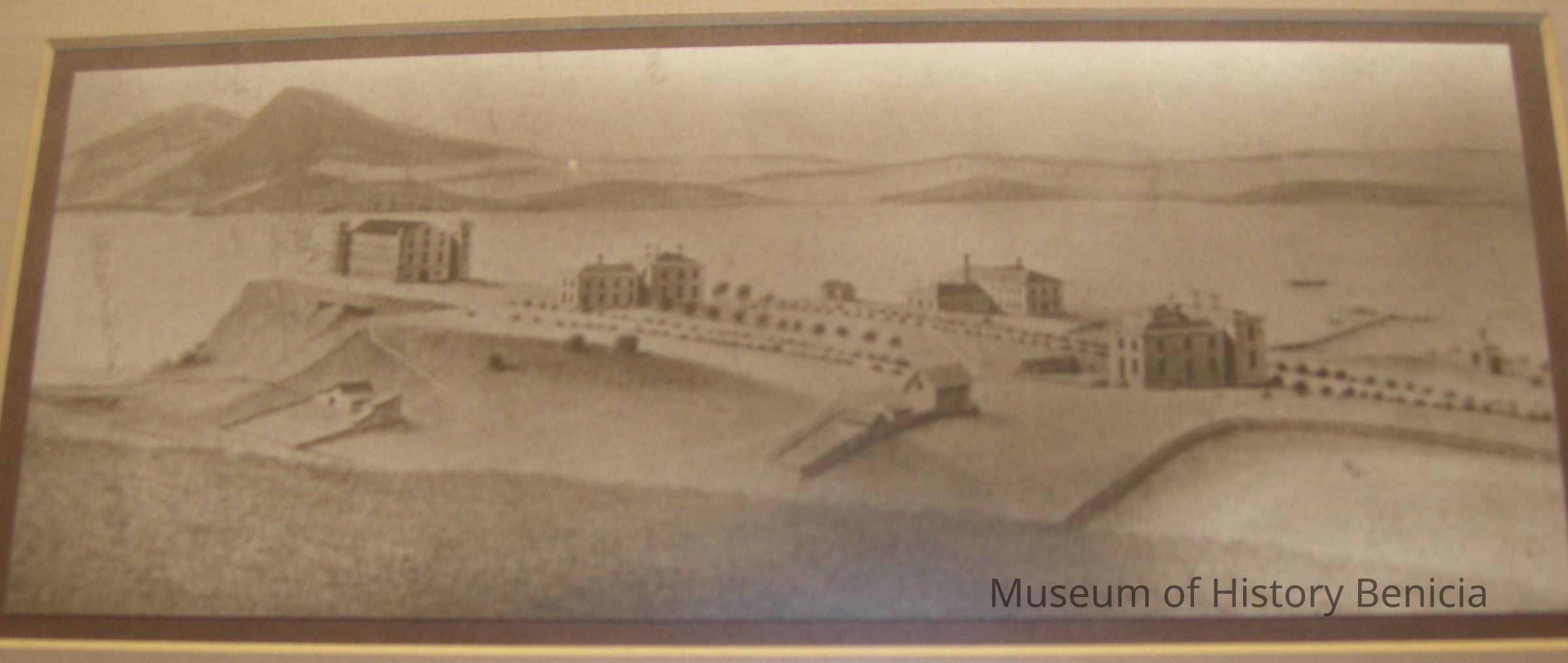 framed sepia-toned lithograph of early Benicia Barracks looking east; clock tower is prominent, straits and Mt. Diablo are in background