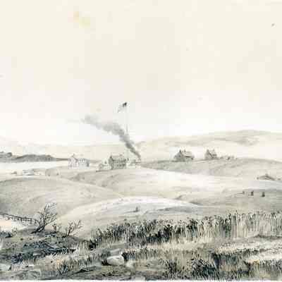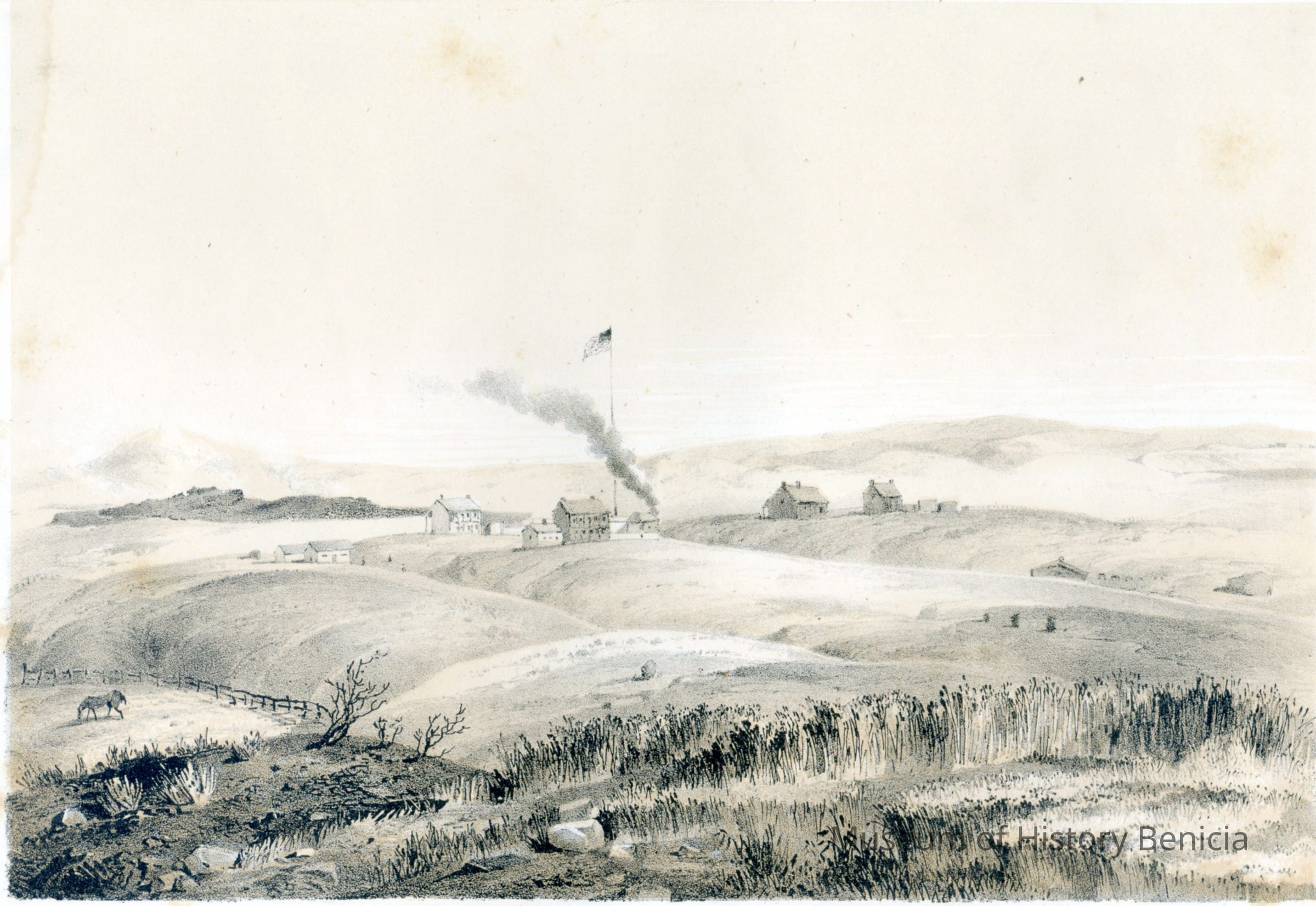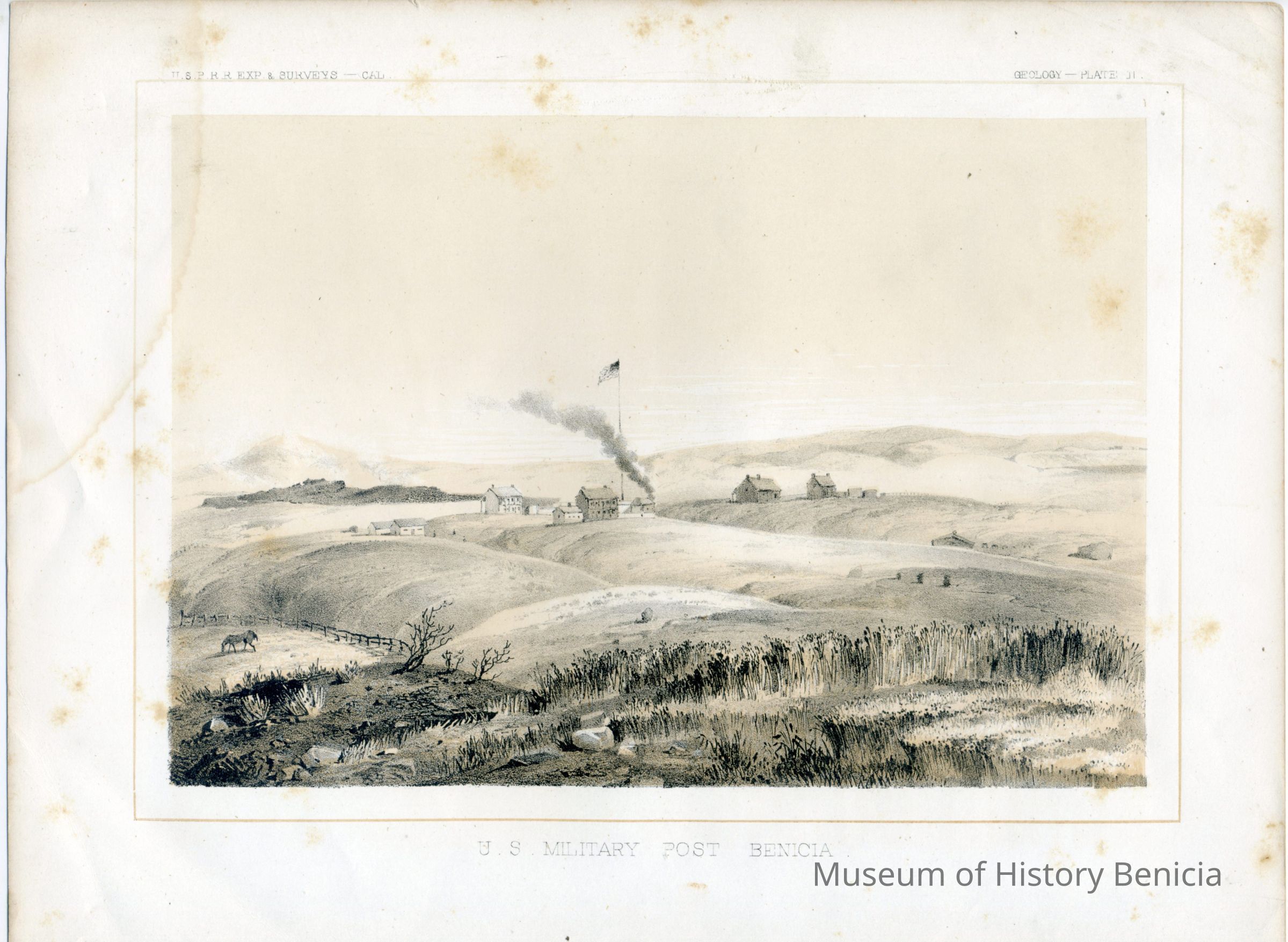 Lithograph - sepia toned "U.S. Military Post Benicia" U.S.P.R.R. Exp. & Surveys. CAL Geology Plate II