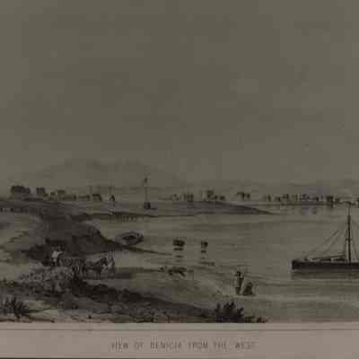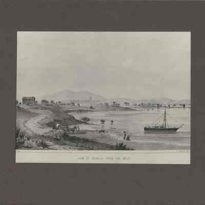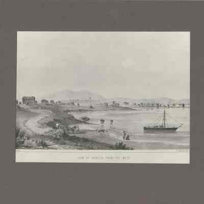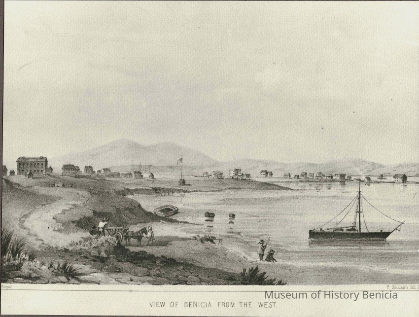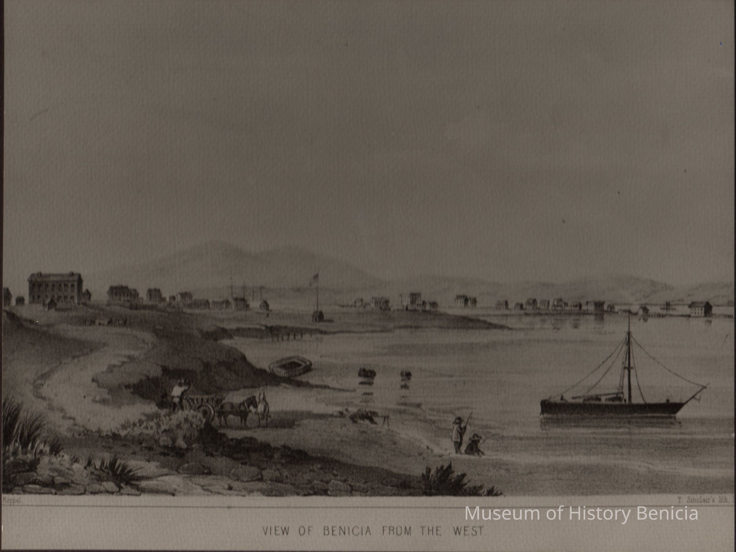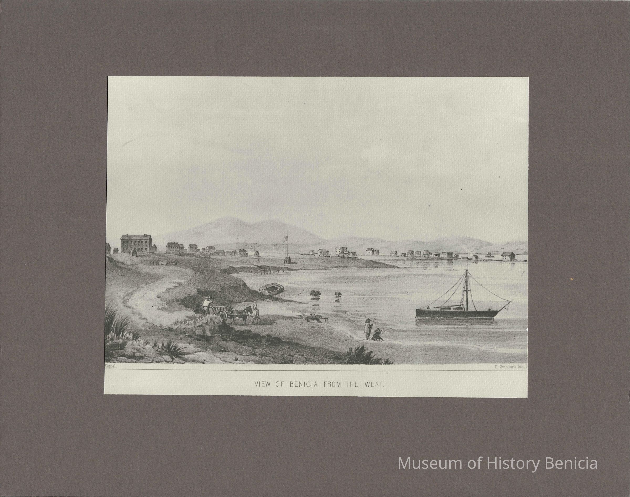 lithograph print of "View of Benicia from the West" - a very good print printed in shades of gray and black on heavy gray drawing paper