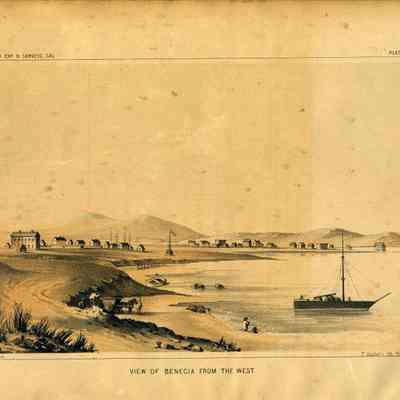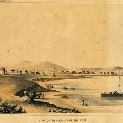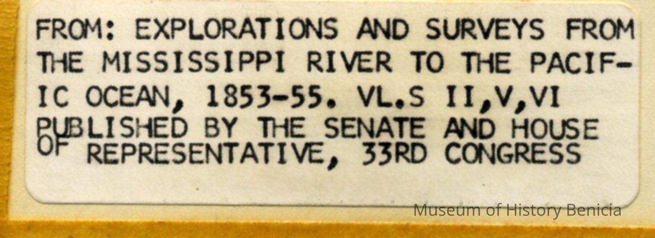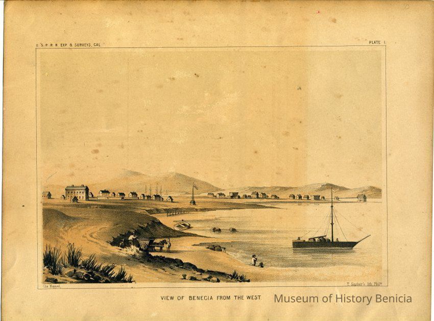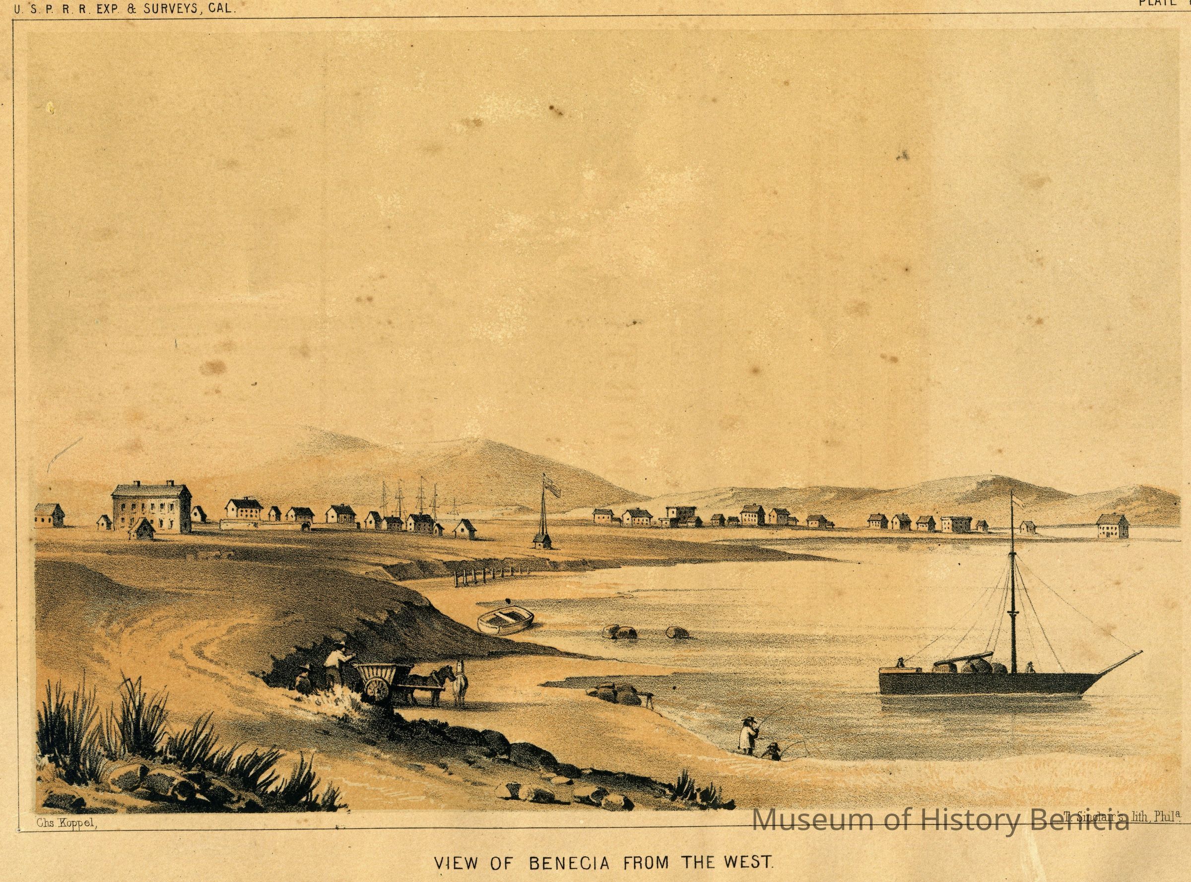 Lithograph of Benicia's Watefront, right upper corner: "Plate 1" Lower right corner "T. Sinclairs lith, PHila" Lower left corner "Chs Koppel, " Left upper corner "USPR Exp & Surveys, Cal. " Under lith "View of Benicia from the west" On back of lithograph: lower left hand corner, sticker that reads "From: Explorations and surveys from the Mississippi River to the Pacific Ocean, 1853-55. Vl.S II, V, VI Published by the Senate and house of Representatives, 33rd Congress.Collection