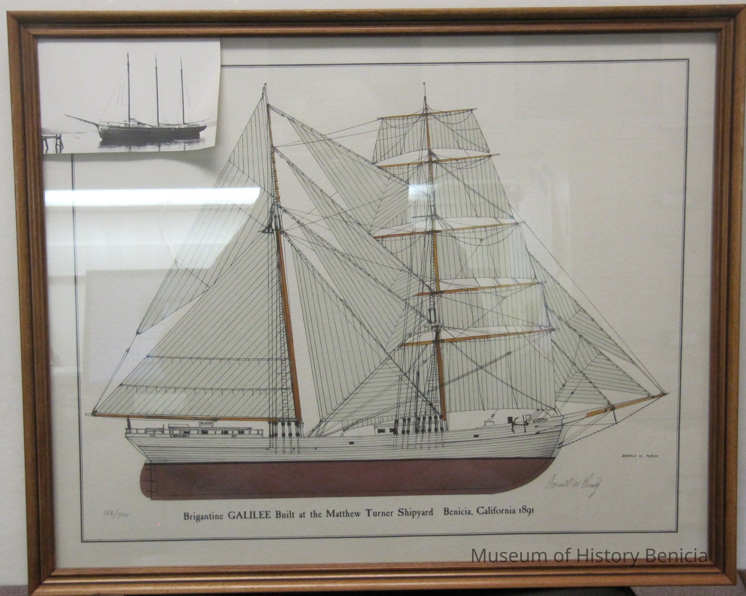 A framed drawing of the ship "Galilee" built by the Matthew Turner Shipyard in Benicia,CA 1891. The print is number 338 of 400 and is signed by Donald Purdy.