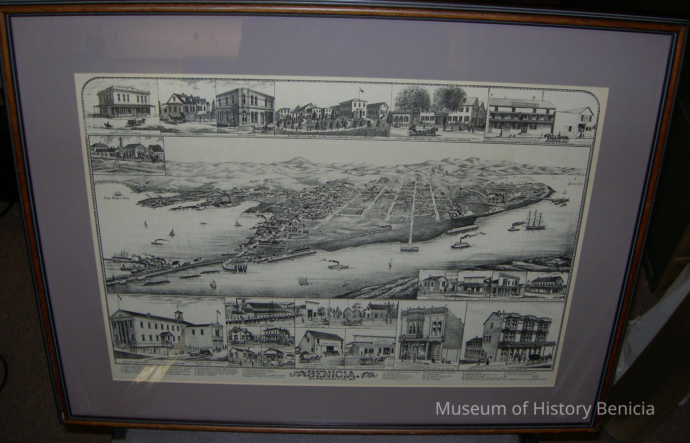 Framed under glass lithograph "Benicia, Solano County Cal., 1885": map of city streets, drawings of important businesses and residences of the time.