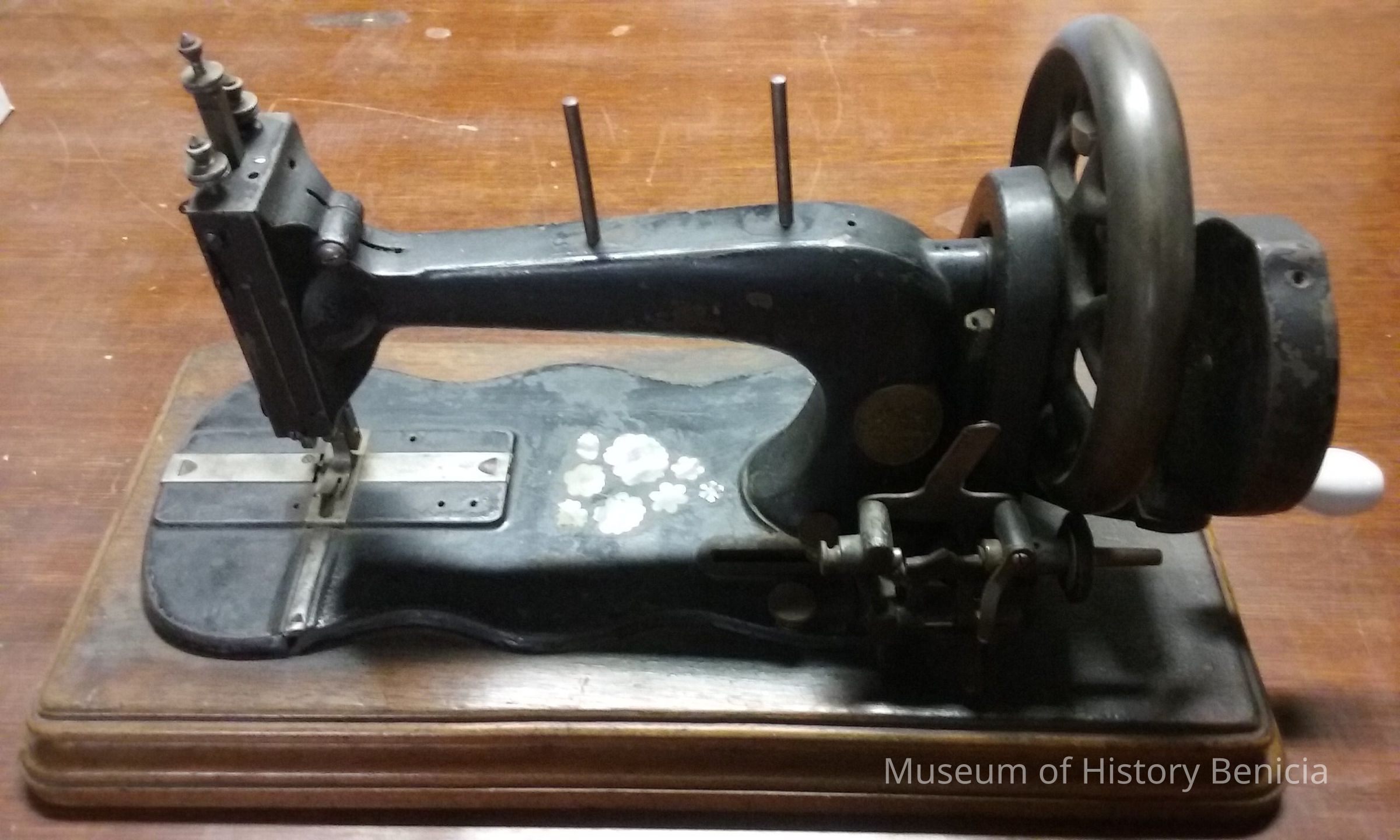 Black cast iron on wood base - porcelaine Handle - Mother of Pearl design on metal base of machine - bobbin threader attached right side of machine; oval brass plate attached on right side of machine w/engraved letter "S" and other designsCollection