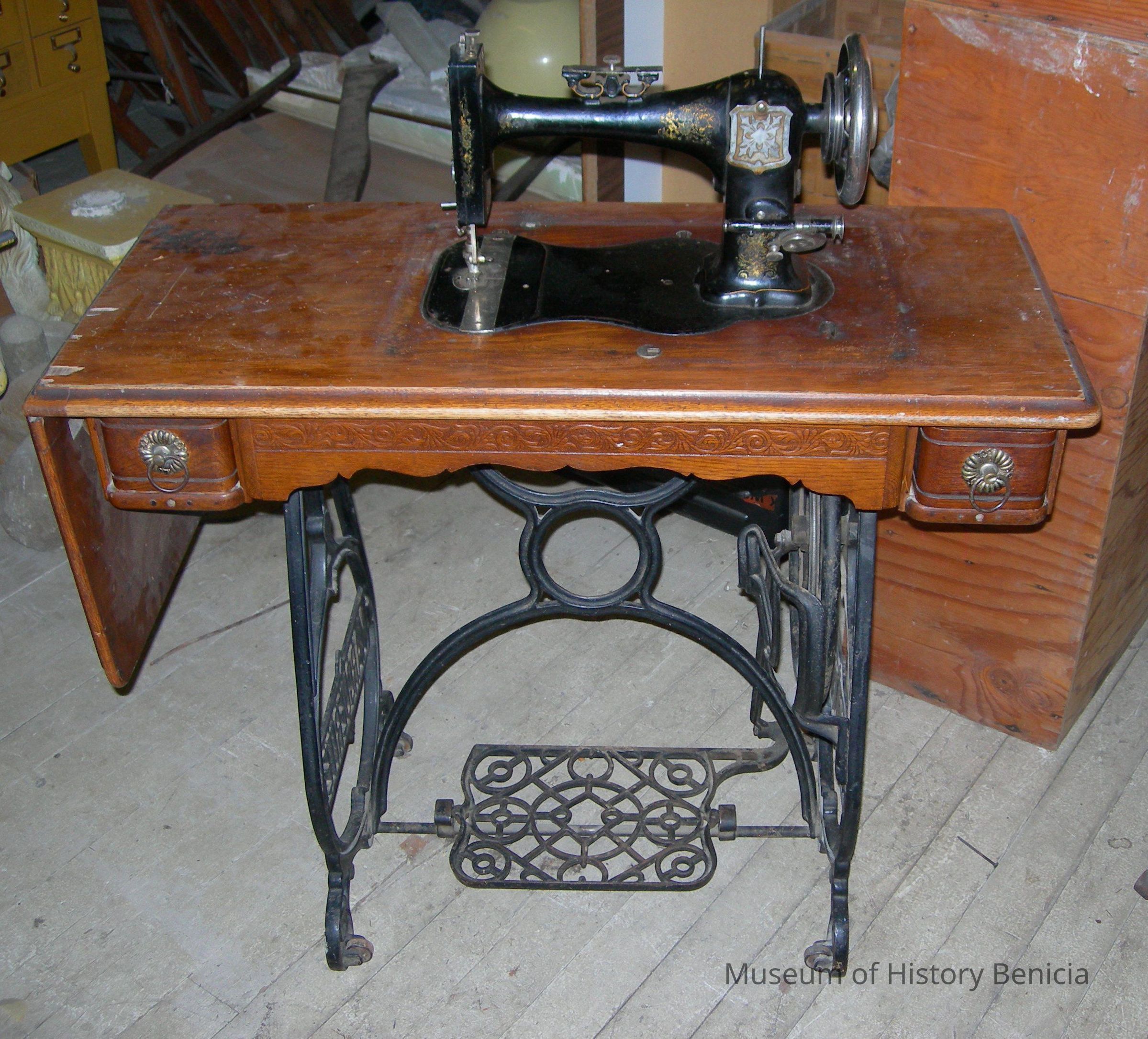 Late 1800's sewing machine - treadle type, with oak cabinet and three drawers. Style/model: Marguerite. The Marguerite sewing machine was manufactured by the Household Sewing Machine Company during the years 1890-1906, in Providence, Rhode Island. The machine belonged to his wife JoAnn Mortensen.Collection