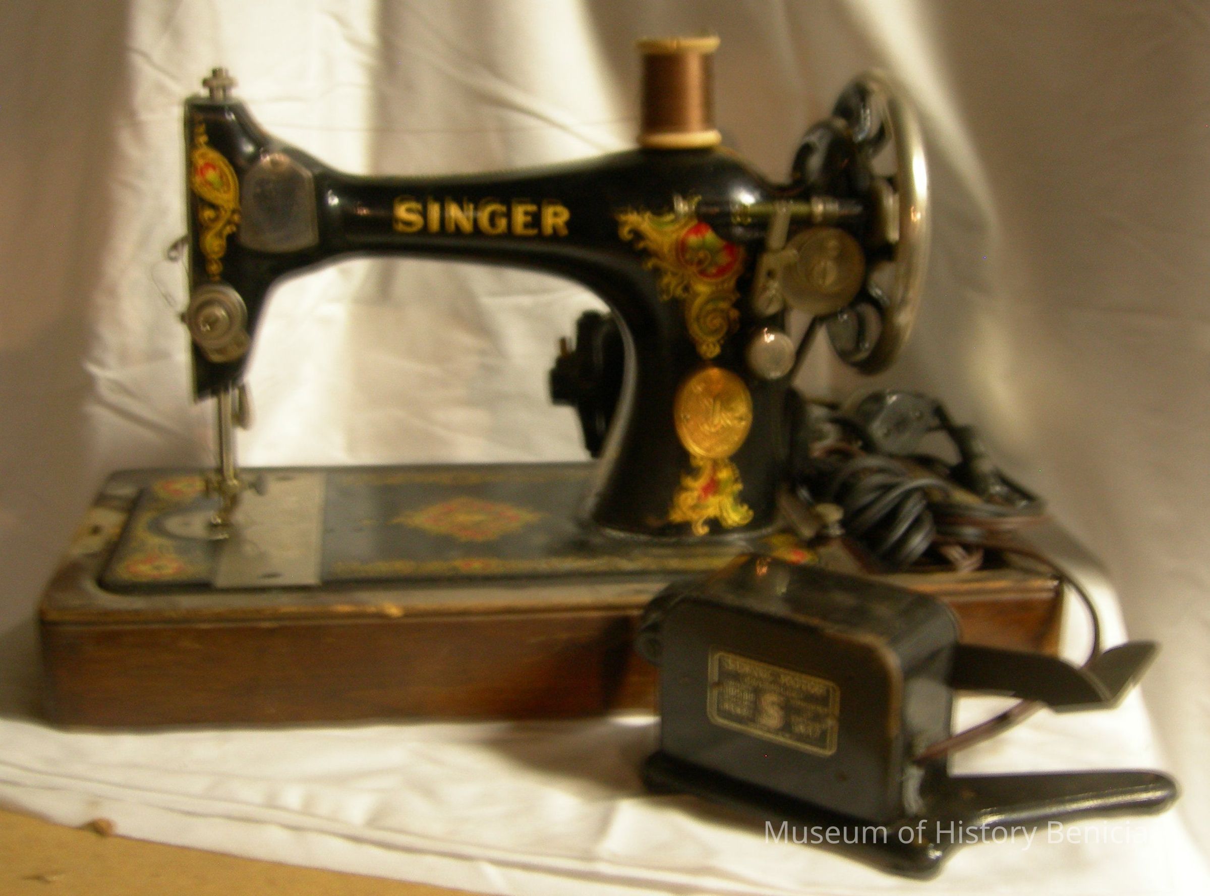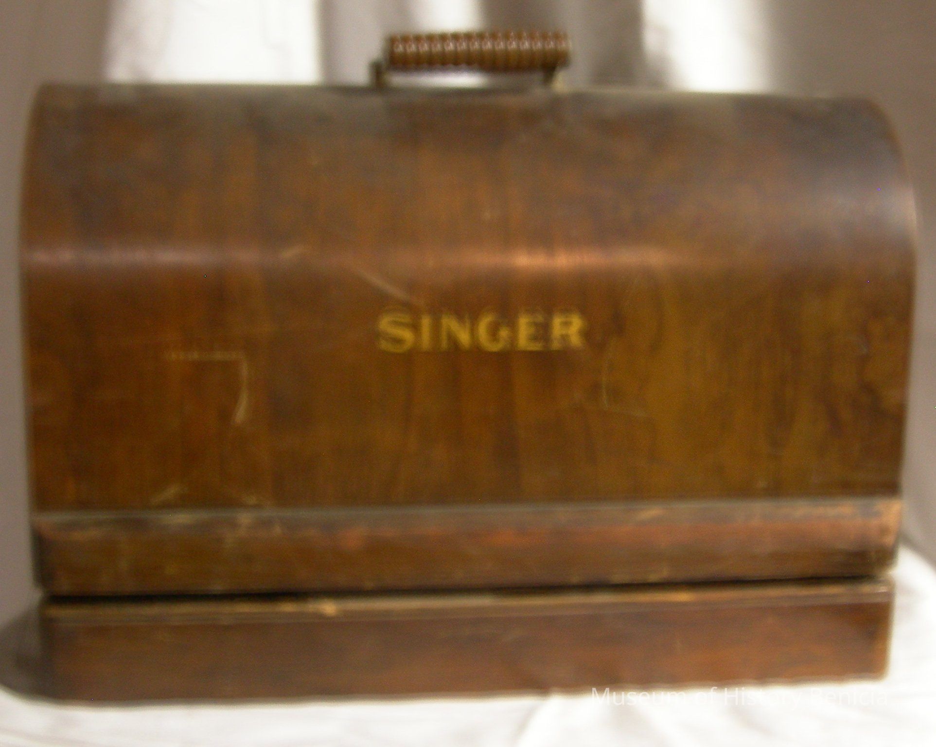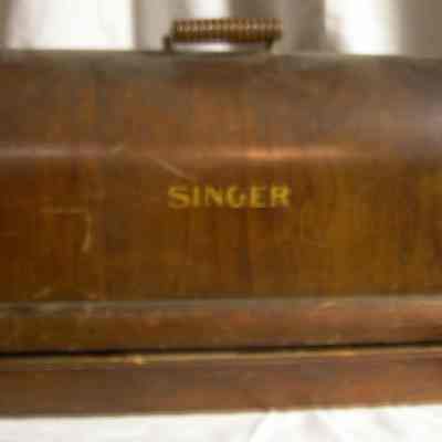 Singer portable sewing machine with cover. Ser. # 40749764. Motor Ser. # 2190580. Wood, metal with plywood case. 1924