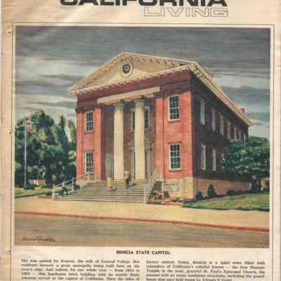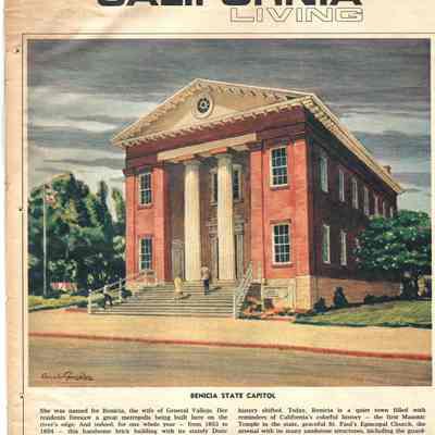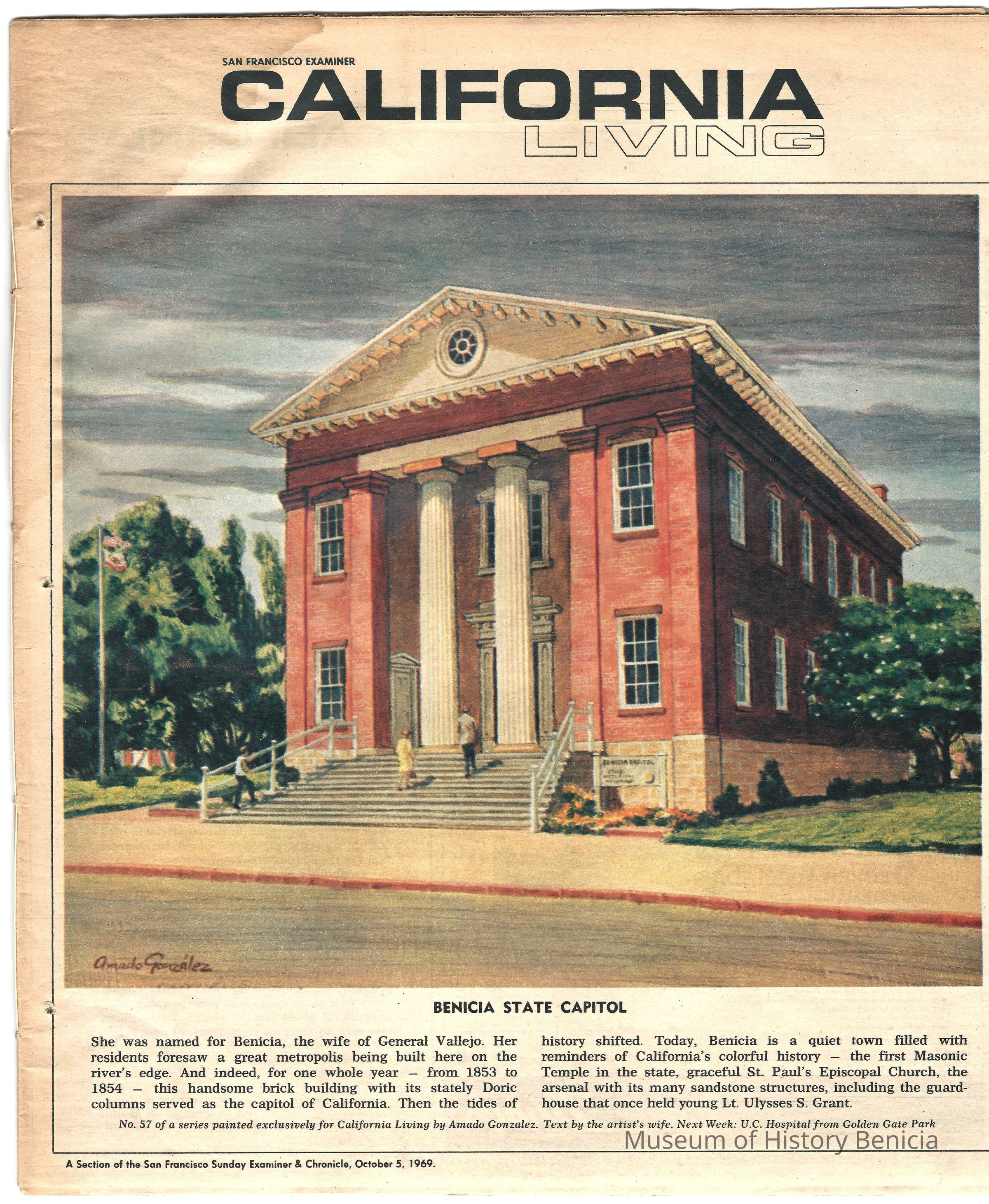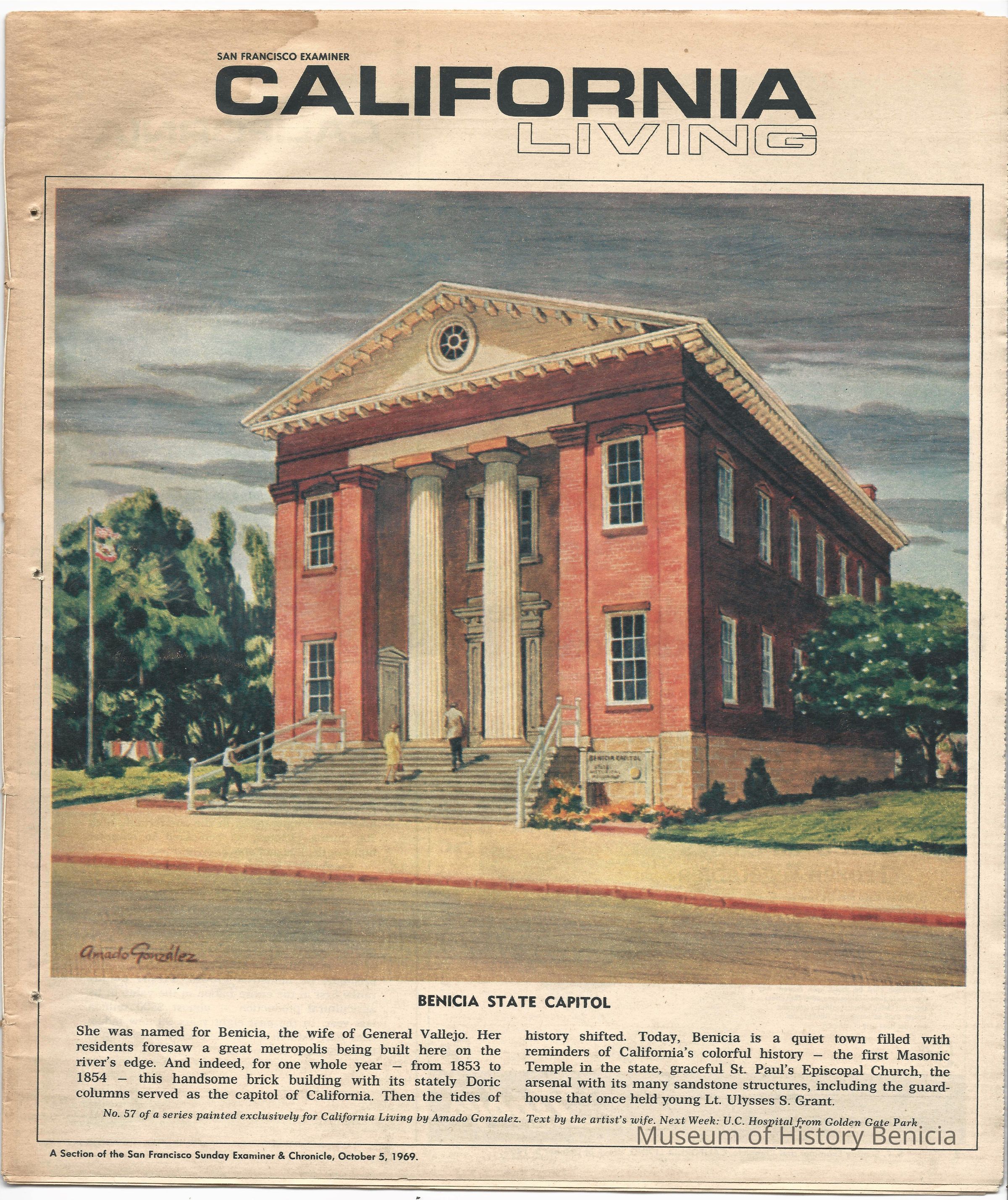 A magazine called "California Living" from 1/05/1969. The cover shows a drawing of the Benicia Capitol building by artist Amado Gonzalez. The text below it is by his wife. This was a series of covers painted by Gonzalez for California Living showing places in California. This is No. 57.