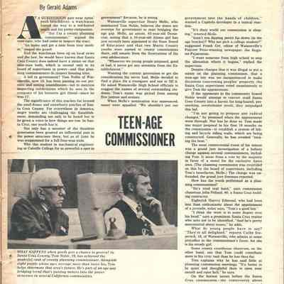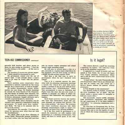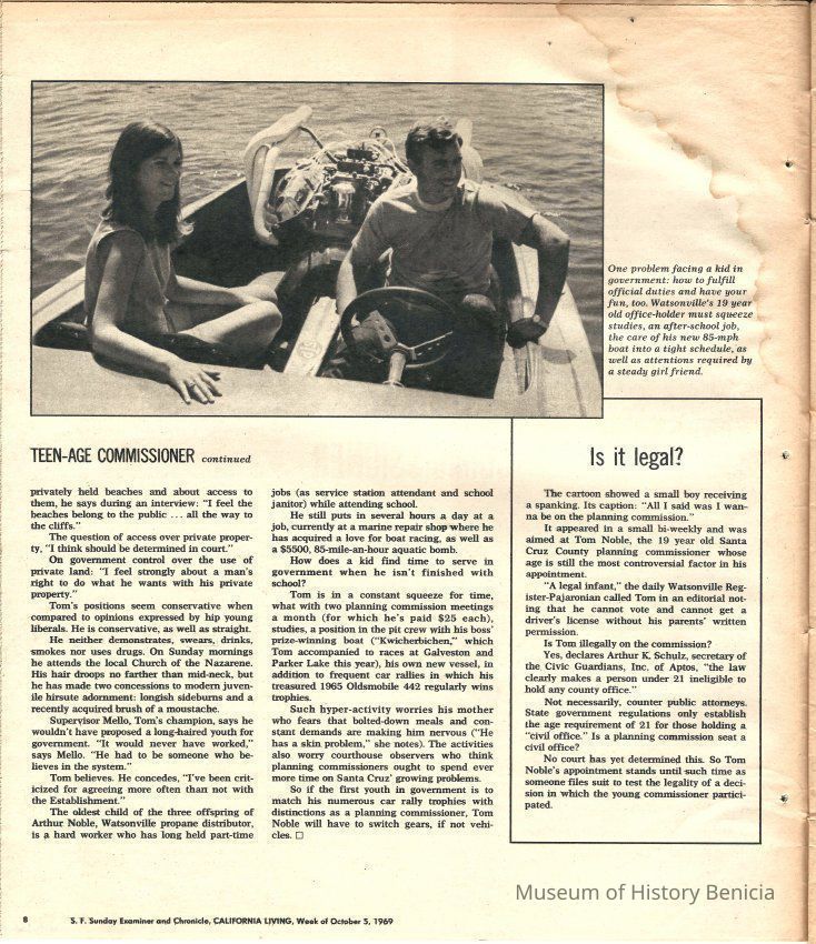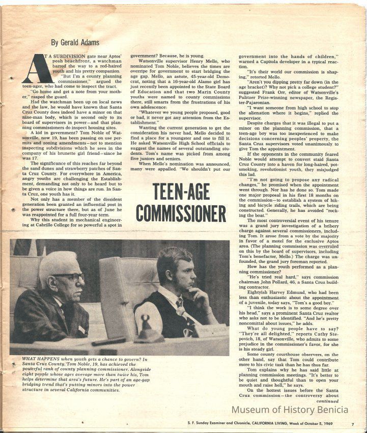 The main article is about a teenage Planning Commissioner in Santa Cruz named Tom Noble. There are also several interesting ads in the magazine.