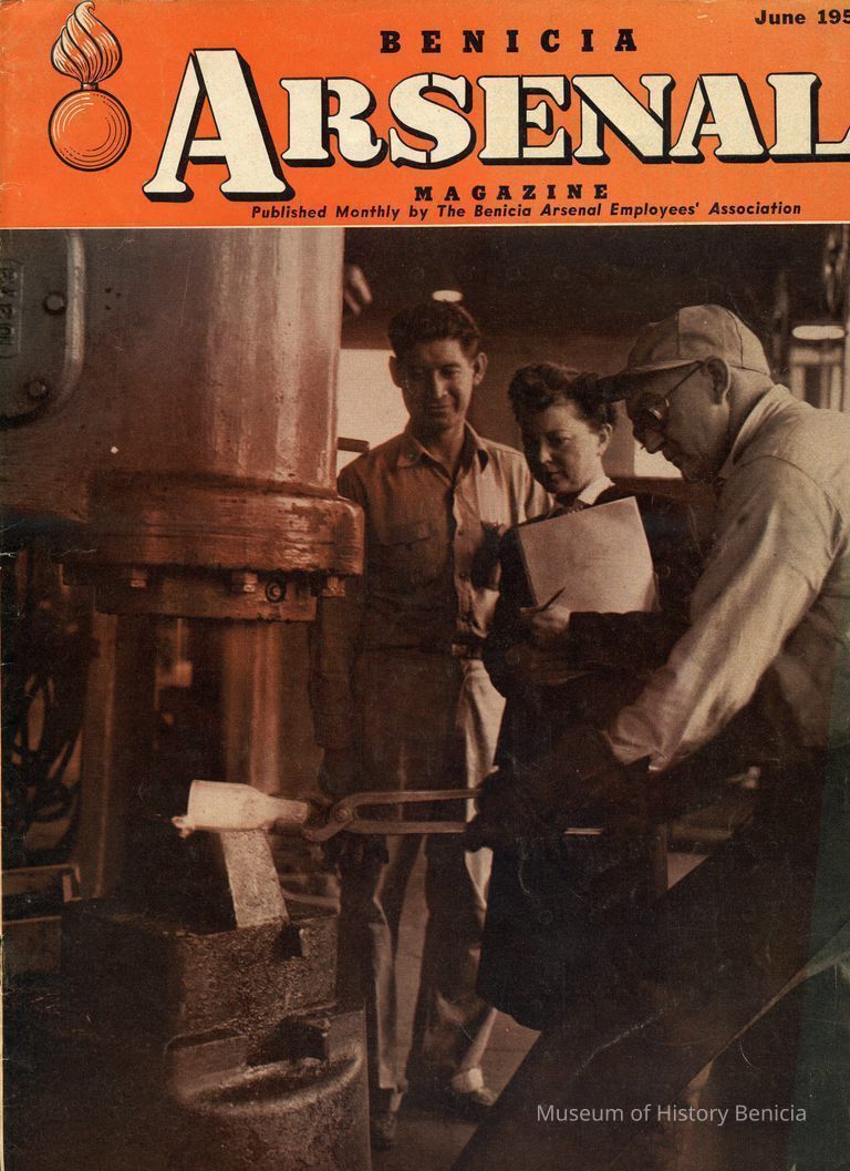 "Benicia Arsenal Magazine" Cover colors are orange, white and black with photo of man welding or making glass on corner. a man and a woman watch him. June 1951Collection