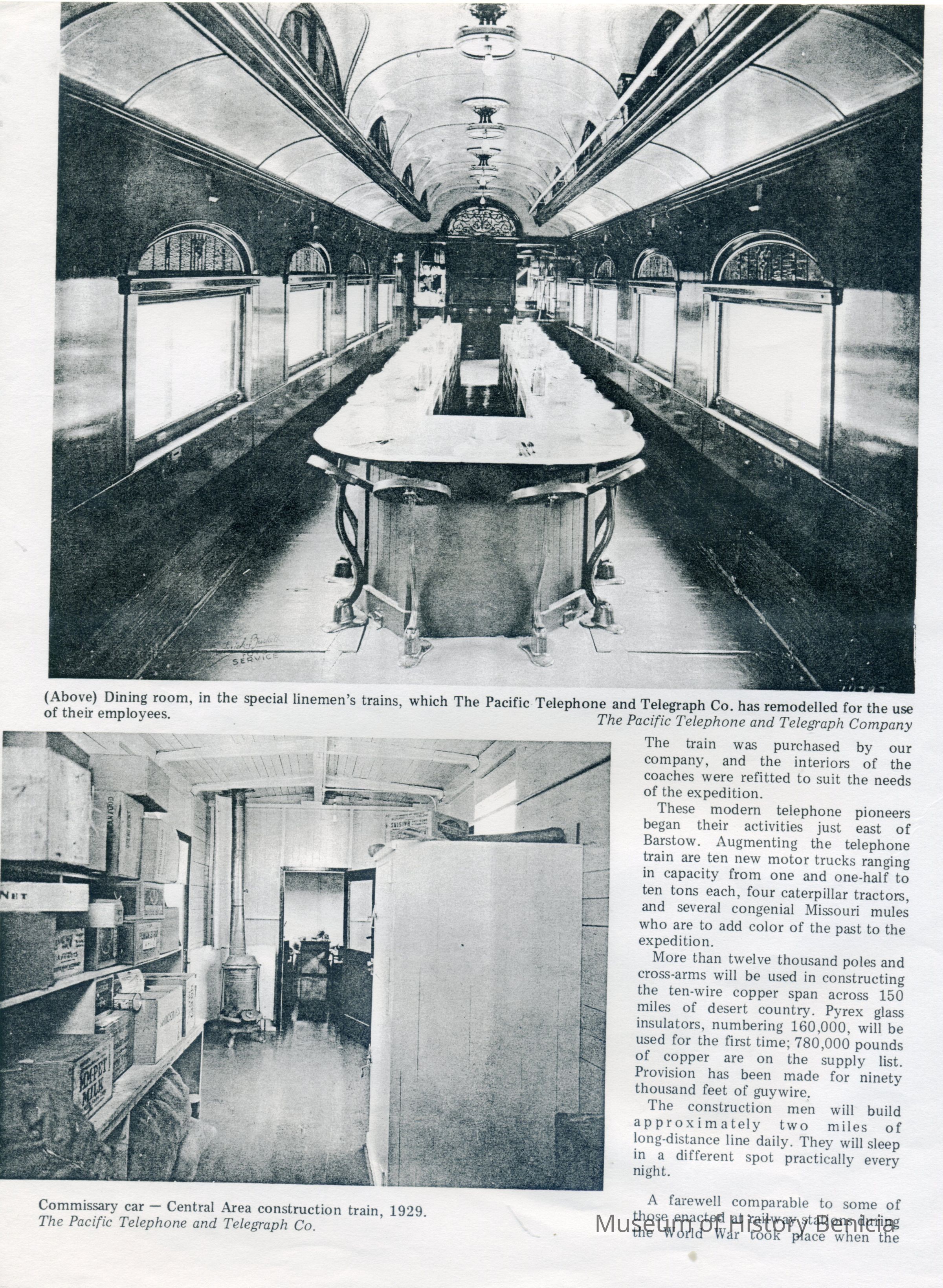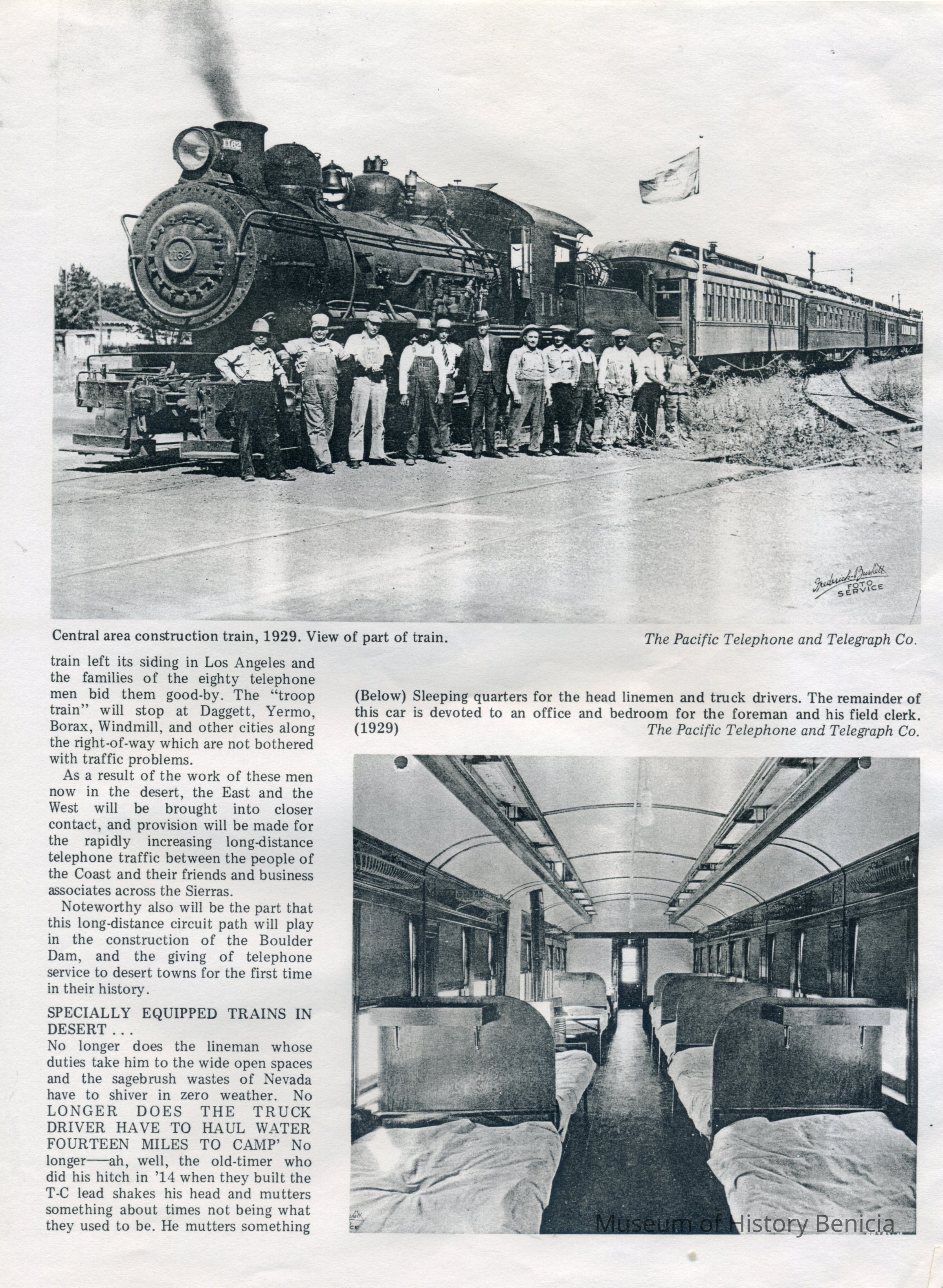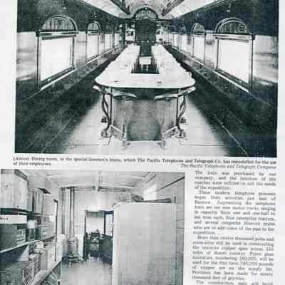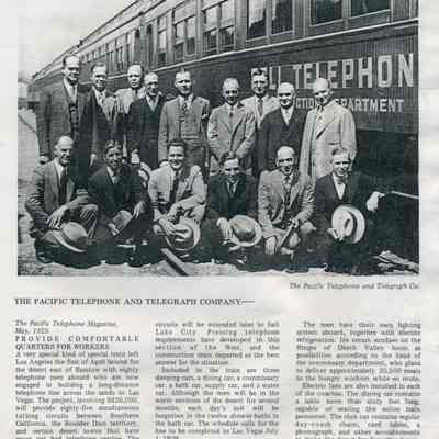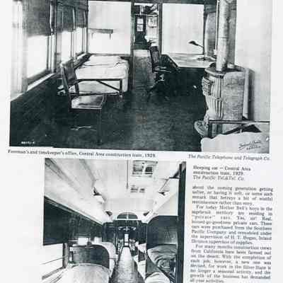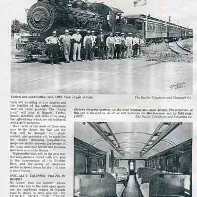 This is an article from the May, 1929 copy of the Pacific Telephone Magazine. The article discusses a special train outfitted for 80 employees of Pacific Telephone to live in while the construction of a long-distance telephone line stretching from Barstow to Las Vegas. There are also two pages from Southern Pacific Bulletins talking about maintaining the rail lines.Collection