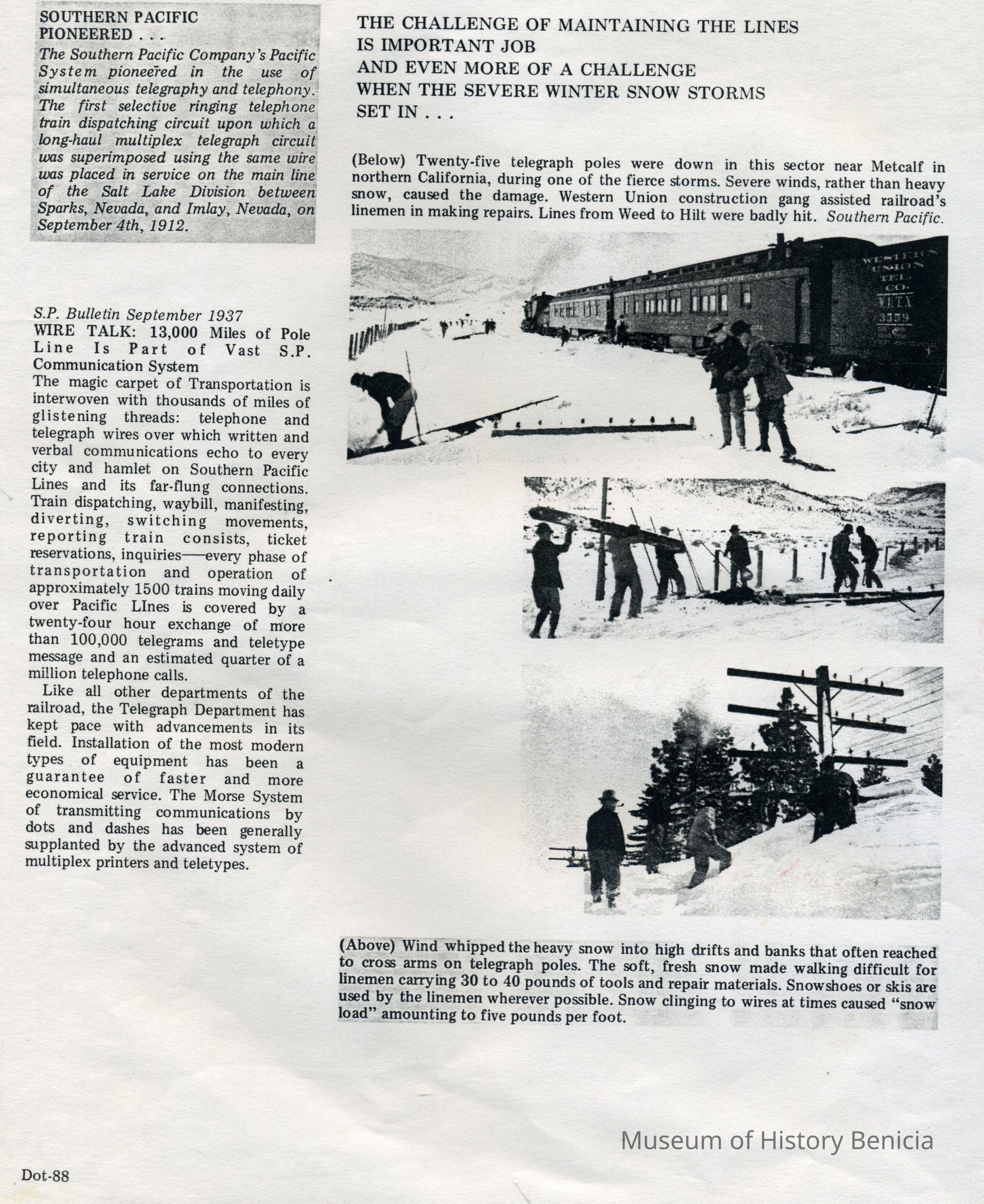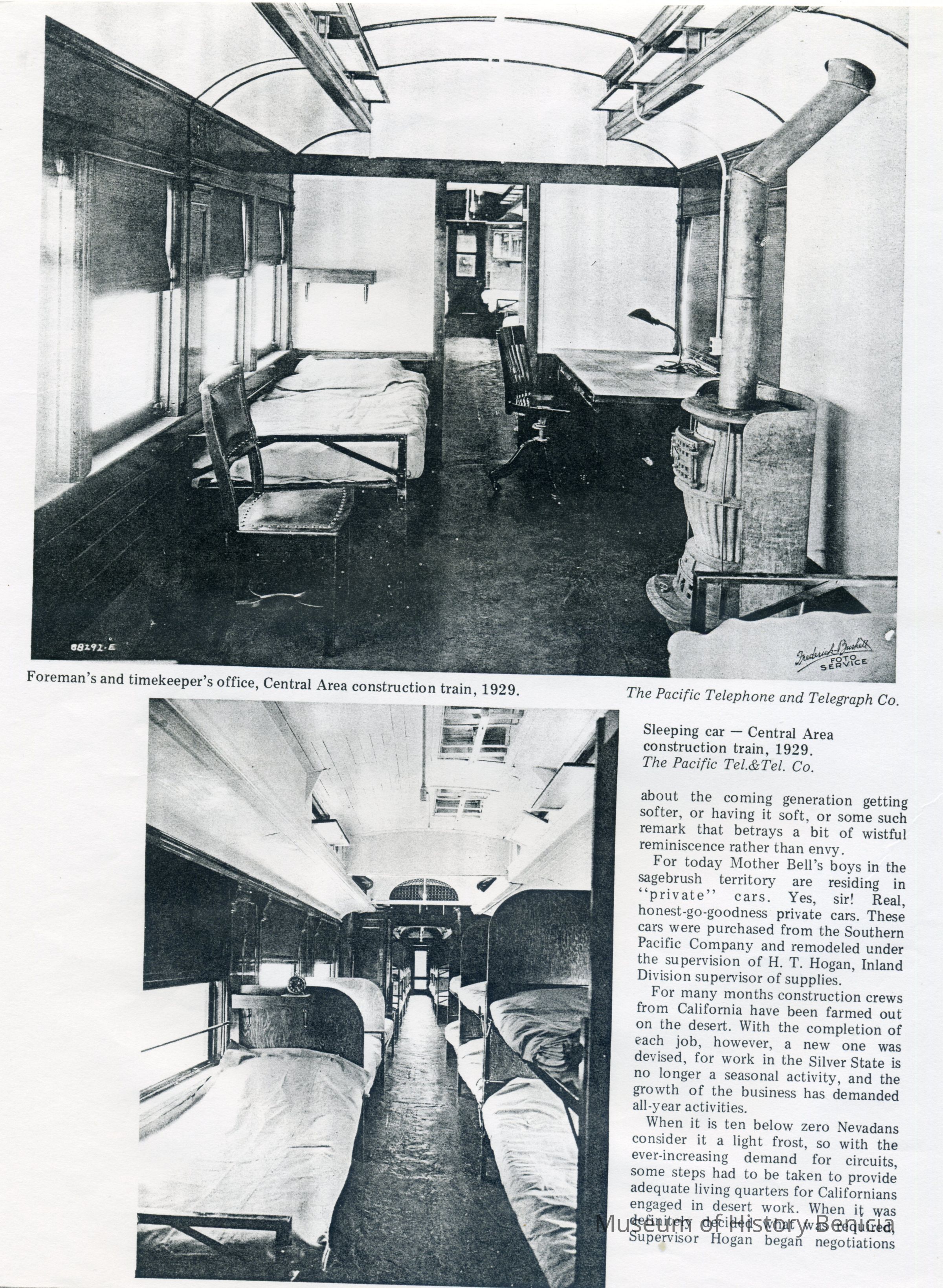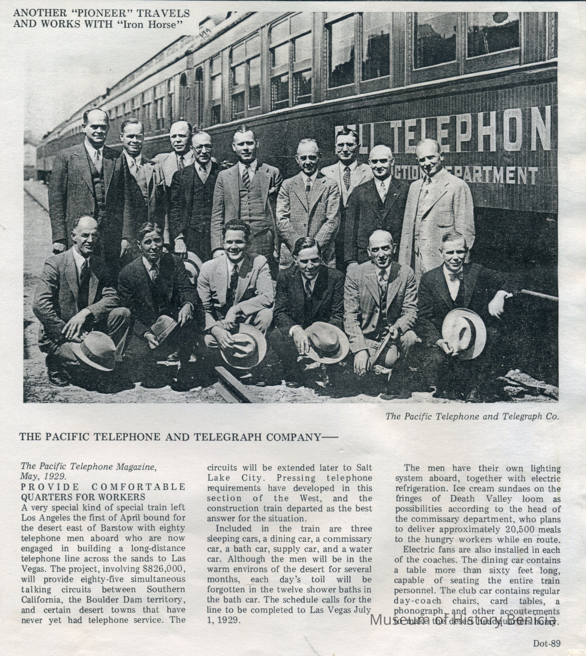 This is an article from the May, 1929 copy of the Pacific Telephone Magazine. The article discusses a special train outfitted for 80 employees of Pacific Telephone to live in while the construction of a long-distance telephone line stretching from Barstow to Las Vegas. There are also two pages from Southern Pacific Bulletins talking about maintaining the rail lines.Collection