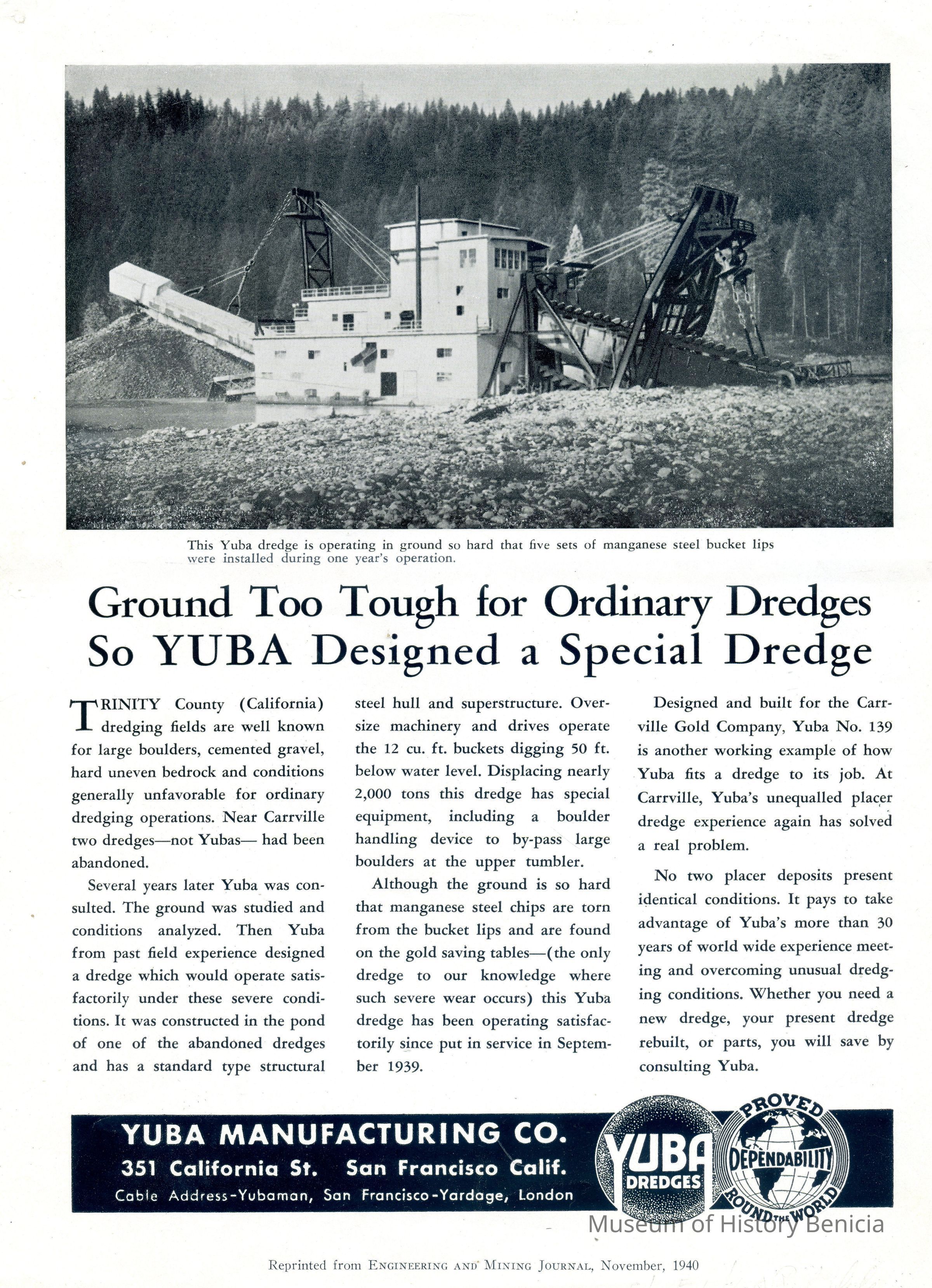 Reprint of article from Engineering and Mining Journal, Nov. 1940 about Yuba dredge No 139 built in 1939 for Carrville Gold Co. for difficult Placer mining in Trinity County, CACollection