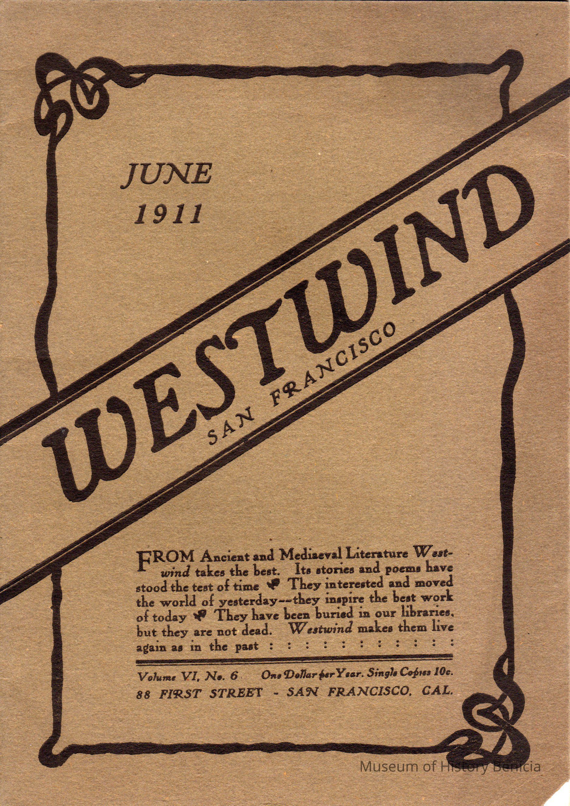 Copy of San Francisco's magazine, "Westwind" dated June 1911. A collection of "Ancient and Mediaeval Literature", this volume has two stories - one of Khaled and Djaida and one of Makbeth - their own spelling. It also contains two poems and multiple advertisements. Some slight wear, front cover has come a little unglued.Collection