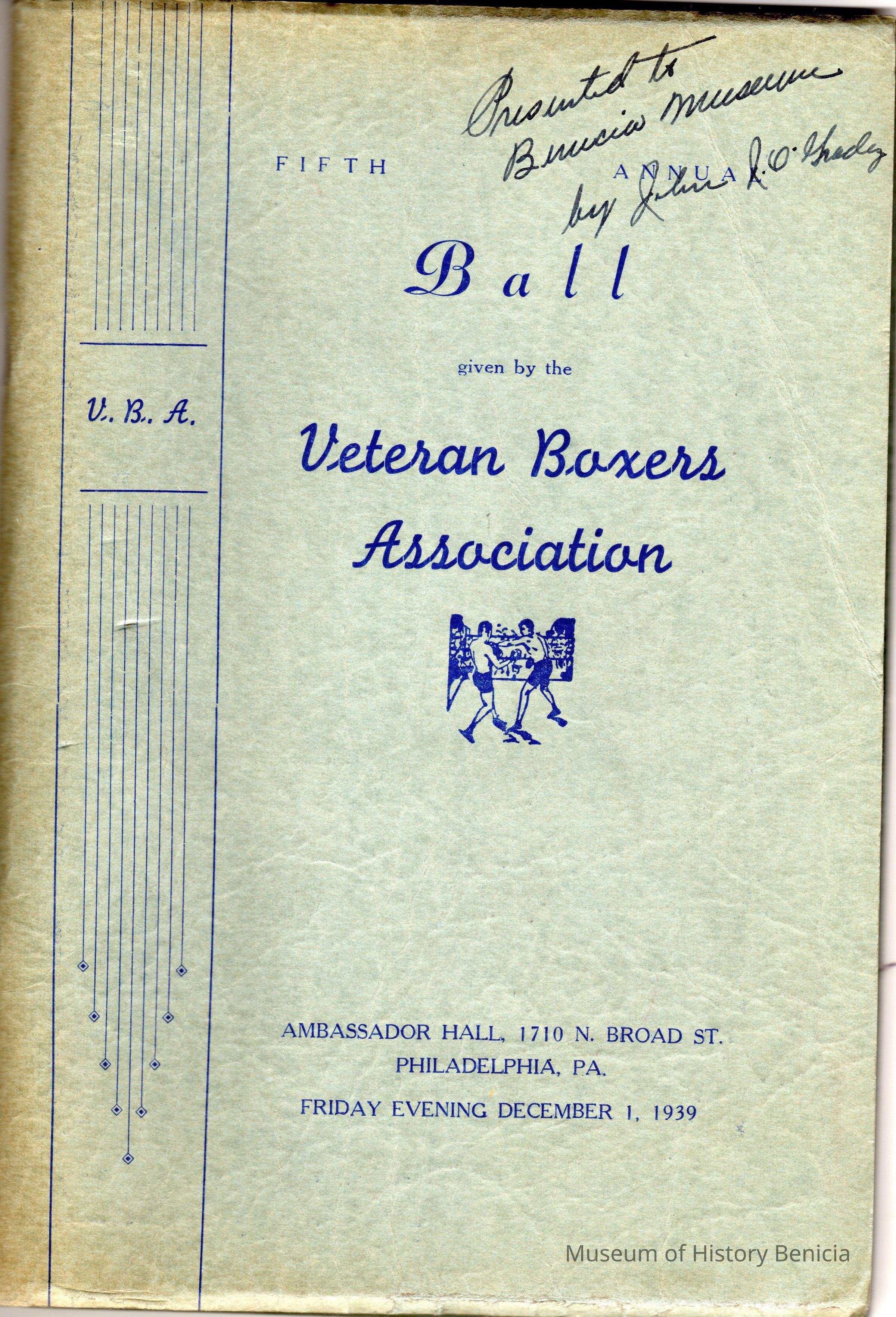 Fifth Ball given by the Veteran Boxers Assosciation in Philadelphia, PA December, 1, 1939. It is signed by John J O'Grady and says "Presented to Benicia Museum".