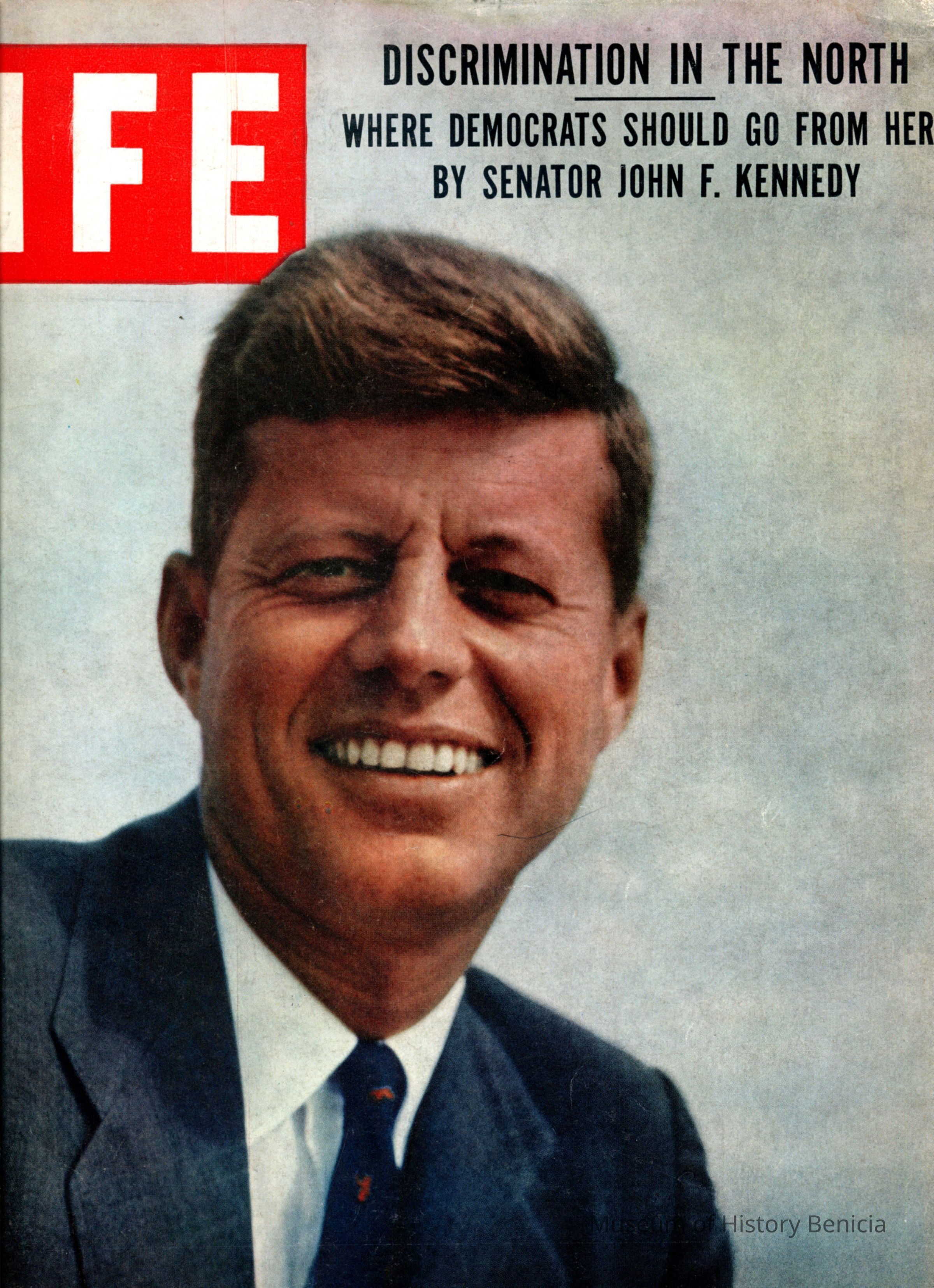 The cover is a photograph of Senator John F. Kennedy described as one of his party's fastest-rising and most articulate young members. At only 39, he had been in Congress for 10 years, the last four in the Senate. In 1956 he came within a few votes of winning the Democratic vice-presidential nomination. In this issue he authors a multiple page article with the headline 'A Democrat Says Party Must Lead-or Get Left'. Kennedy states "under the direction of old-style politicians, Democrats' old-model coalition has been losing voter blocks--minority groups, veterans, farmers, small businessmen--to attractions of Eisenhower-Nixon New Republicanism which blocks (the Democrats) party's road to the White House".