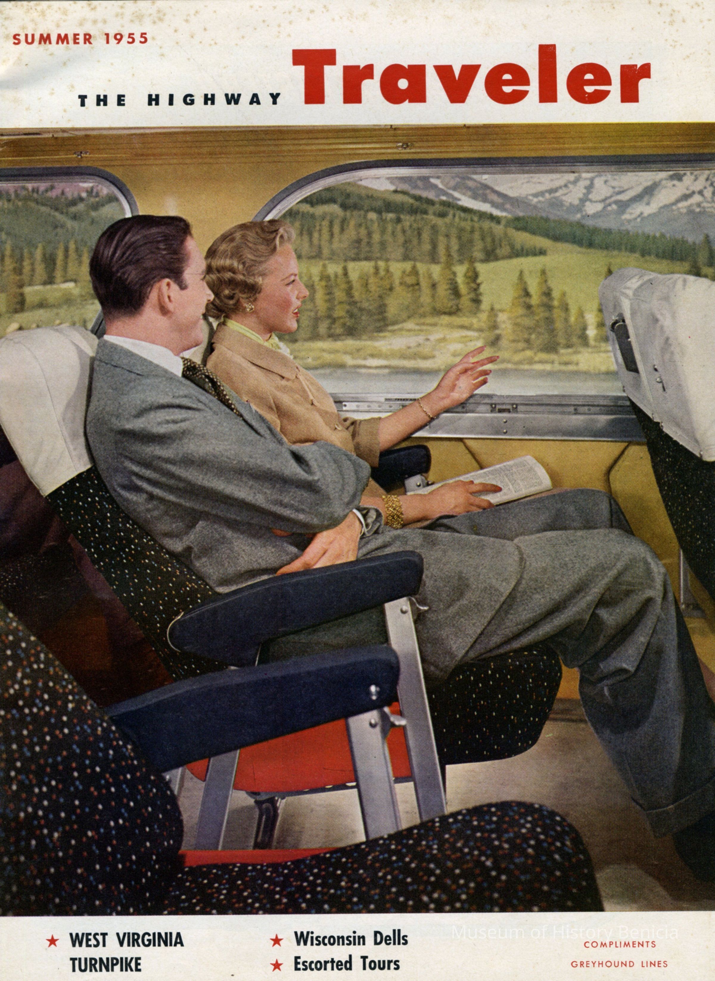 The Highway Traveler published compliments Greyhound Lines for the Summer of 1955. The magazine boasts 'This Issue Read by More Than 1,000,000 Travelers'.