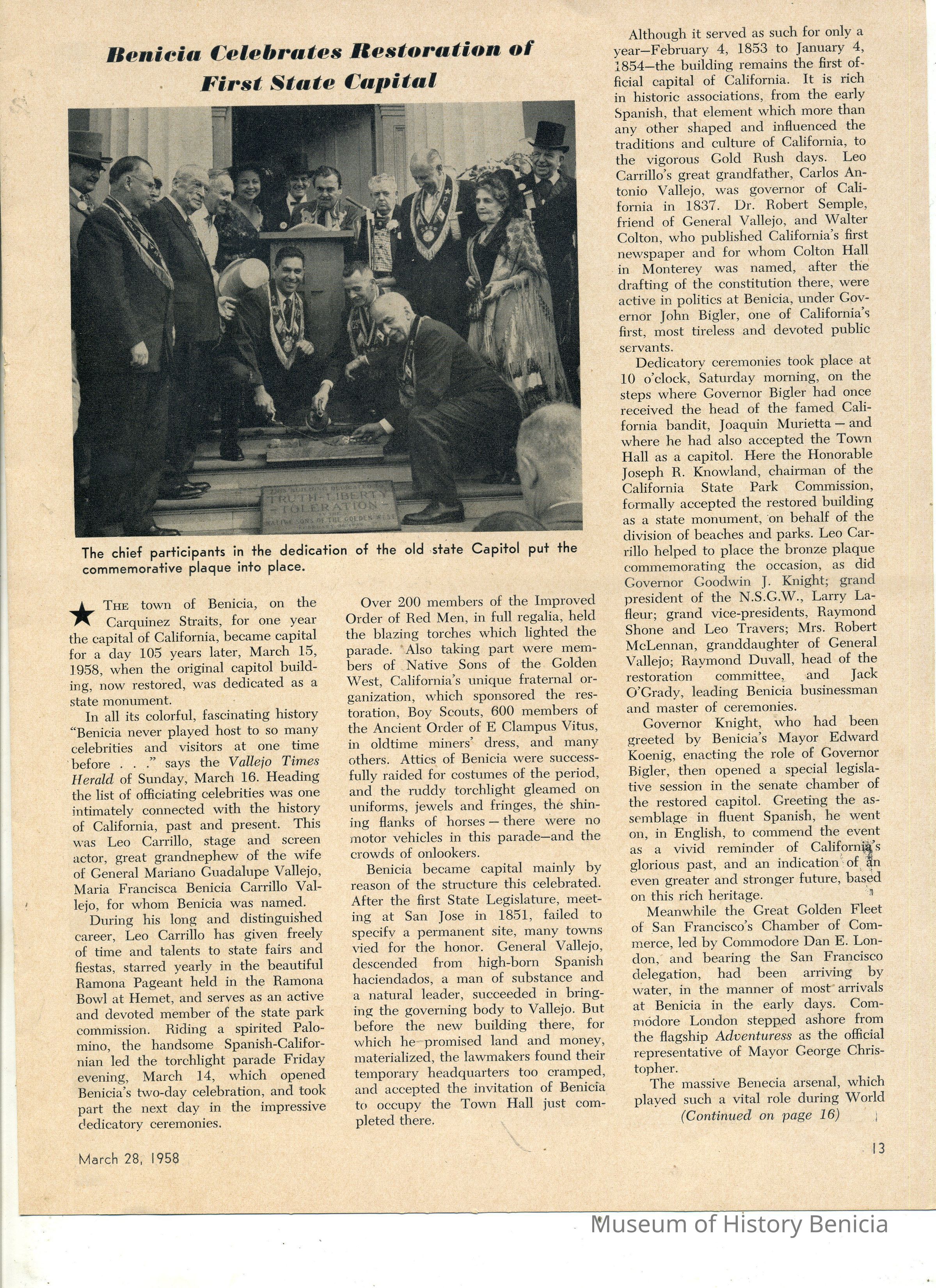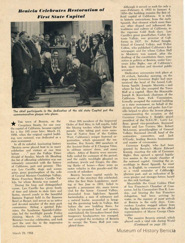 Pages 13 - 16: "Benicia Celebrates Restoration of First State Capital", ten black and white photographsCollection