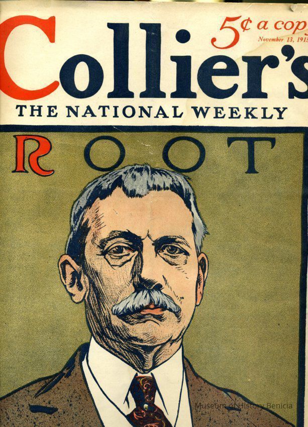 This is a Collier's Magazine (The National Weekly). It has a drawing of "Elihu Root" on the cover. Mr. Root was a liberal Republican in the 1900s. The article portrays him as a potential Presidential candidate.