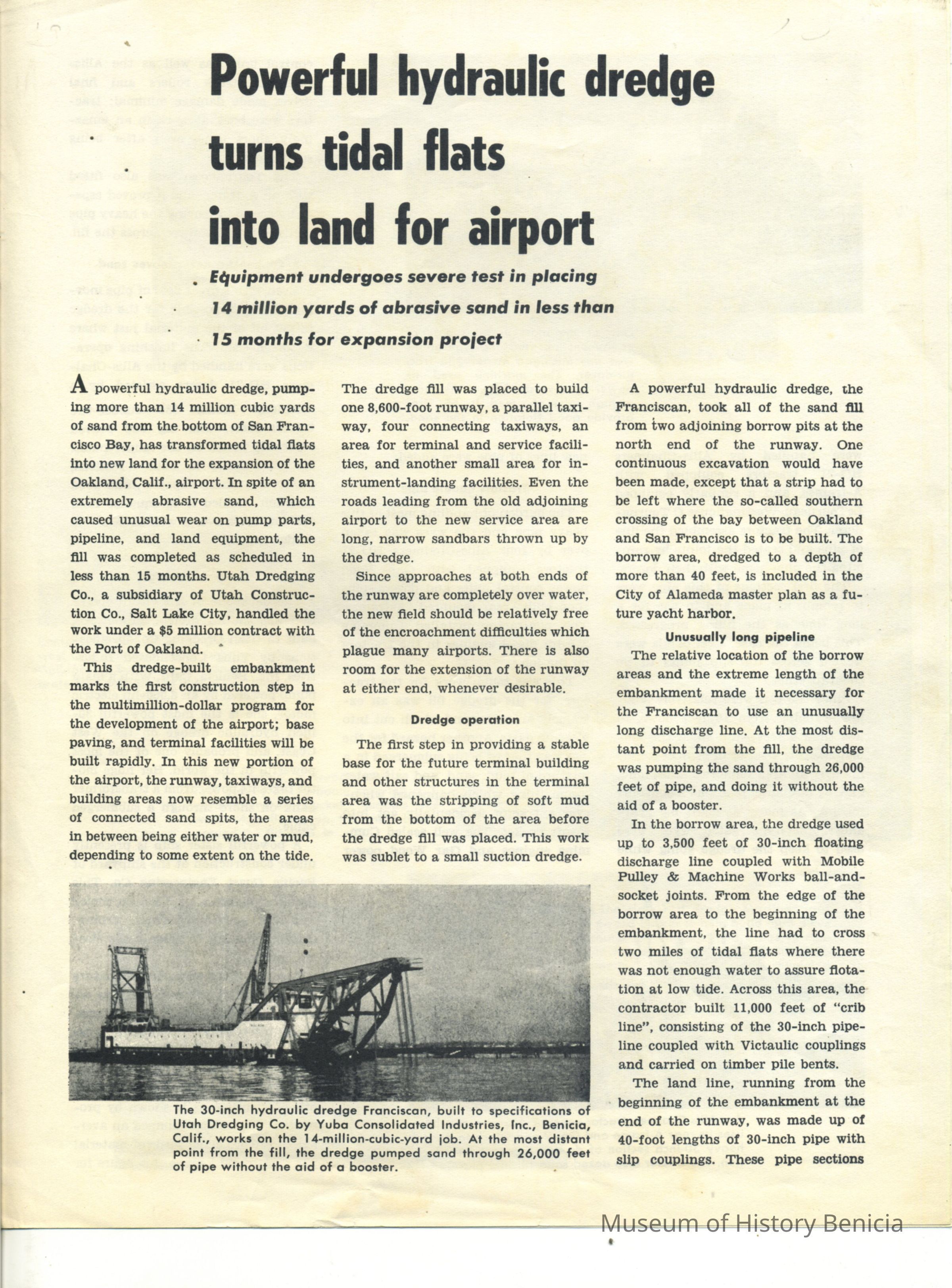 Reprint of article "Re Suction Dredge" in "Contractors and Engineers magazine of modern construction" July 1958 on the 30 inch hydraulic dredge built by Yuba for Utah Dredging Co. used on the Alameda Project.Collection