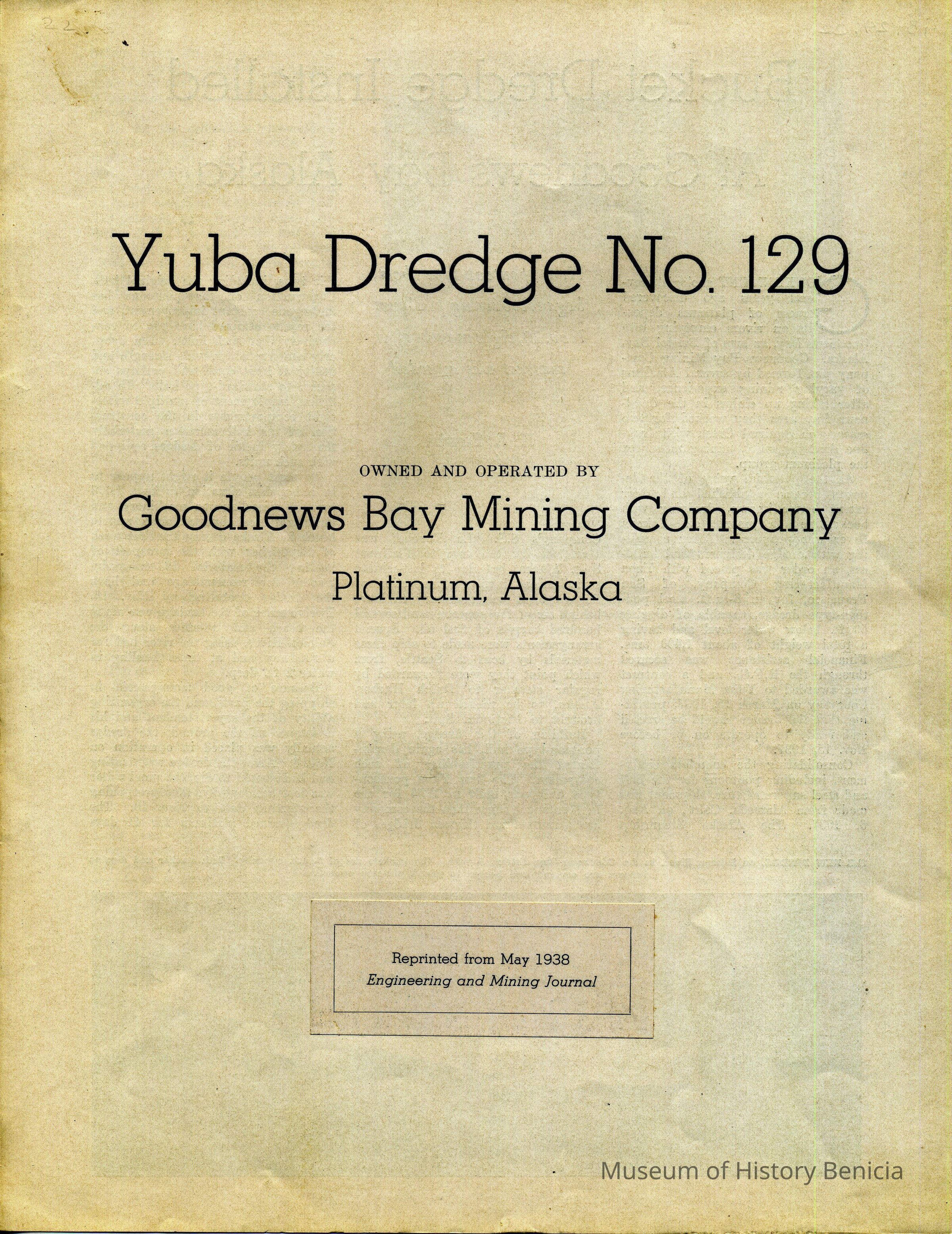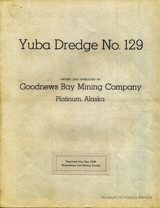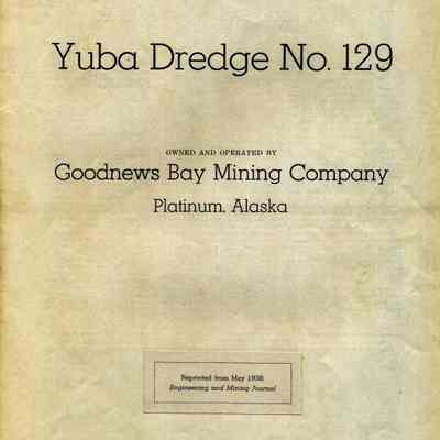 Reprint of article in May 1938 "Engineering and Mining Journal" re Yuba Dredge No 129. 2 hrs 8cu ft dredge used at Platinum Bay Alaska- owned by Goodnews Bay Mining Co.Collection