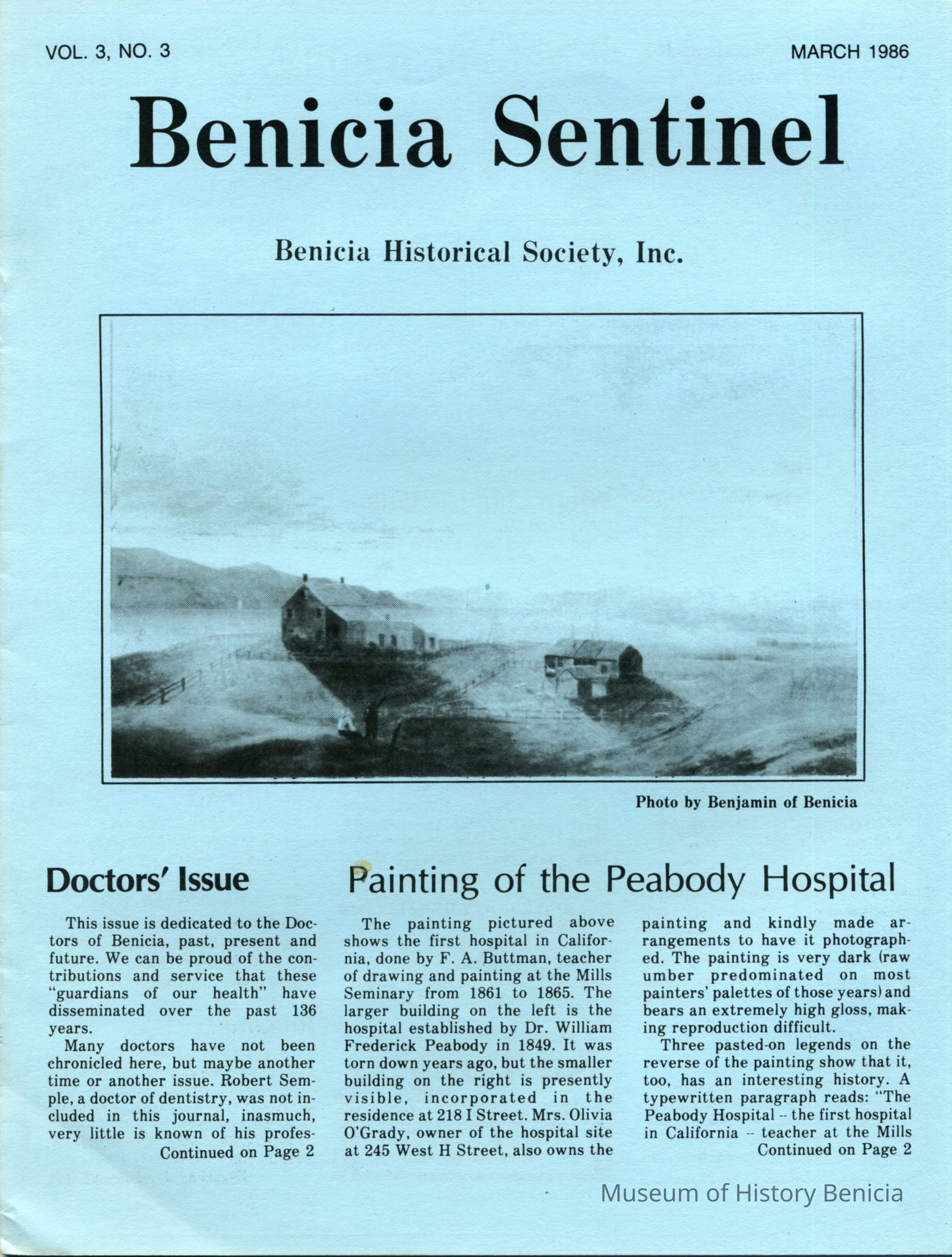 Copy of Benicia Historical Society "Benicia Sentinel" publication. Vol 3 No 3 March 1986. The "Doctors' Issue".