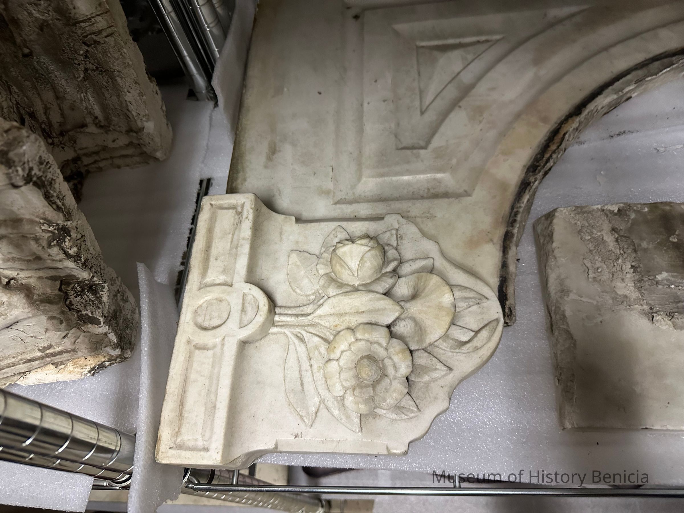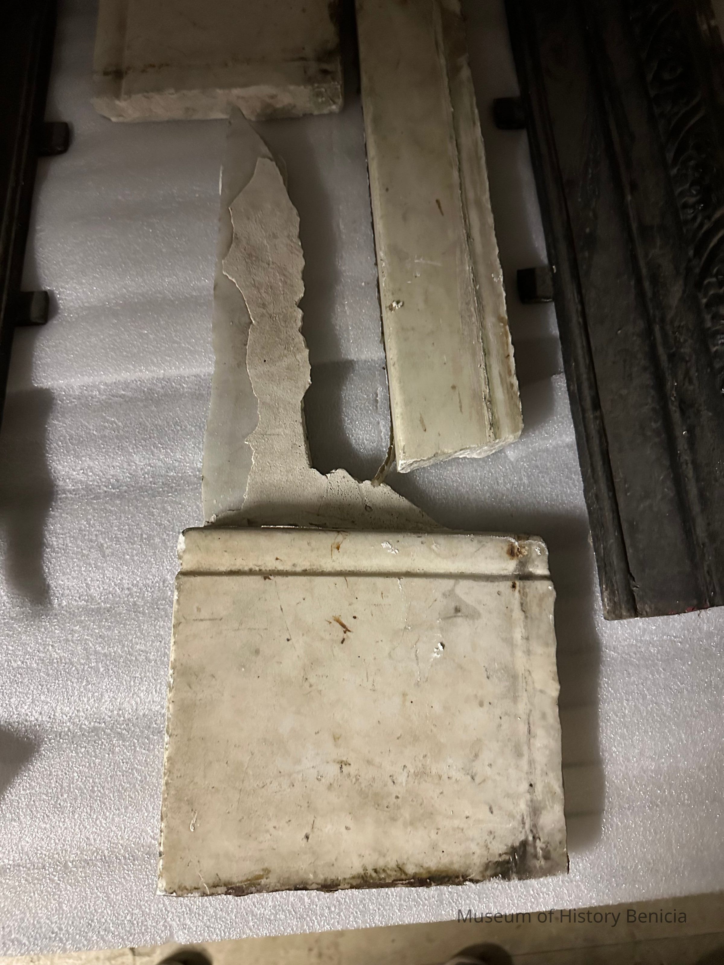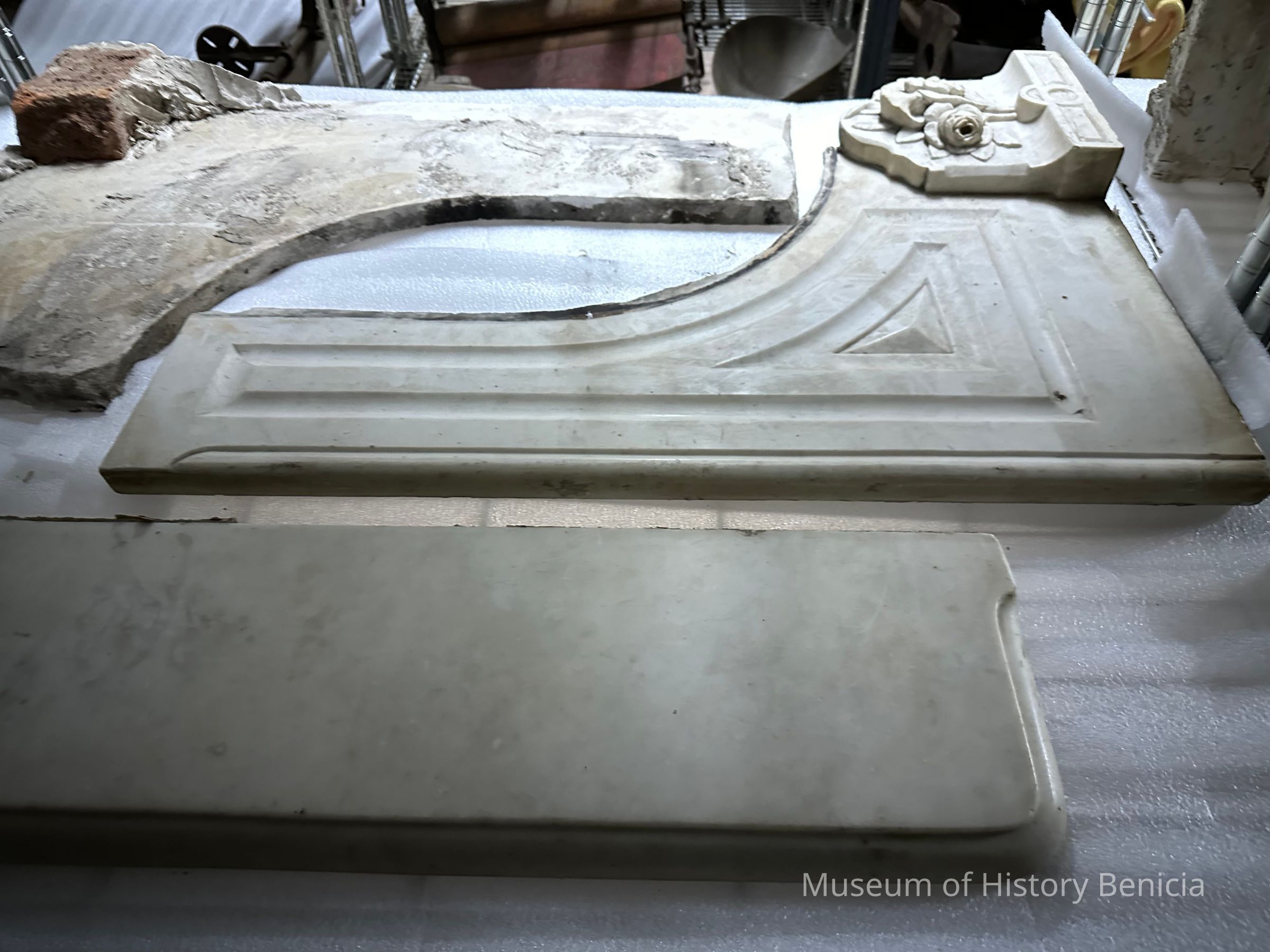 Marble fireplace mantle from 456 East K Street, Benicia. There are several pieces as the mantle was broken upon removal. Donated by Phil Brkich.