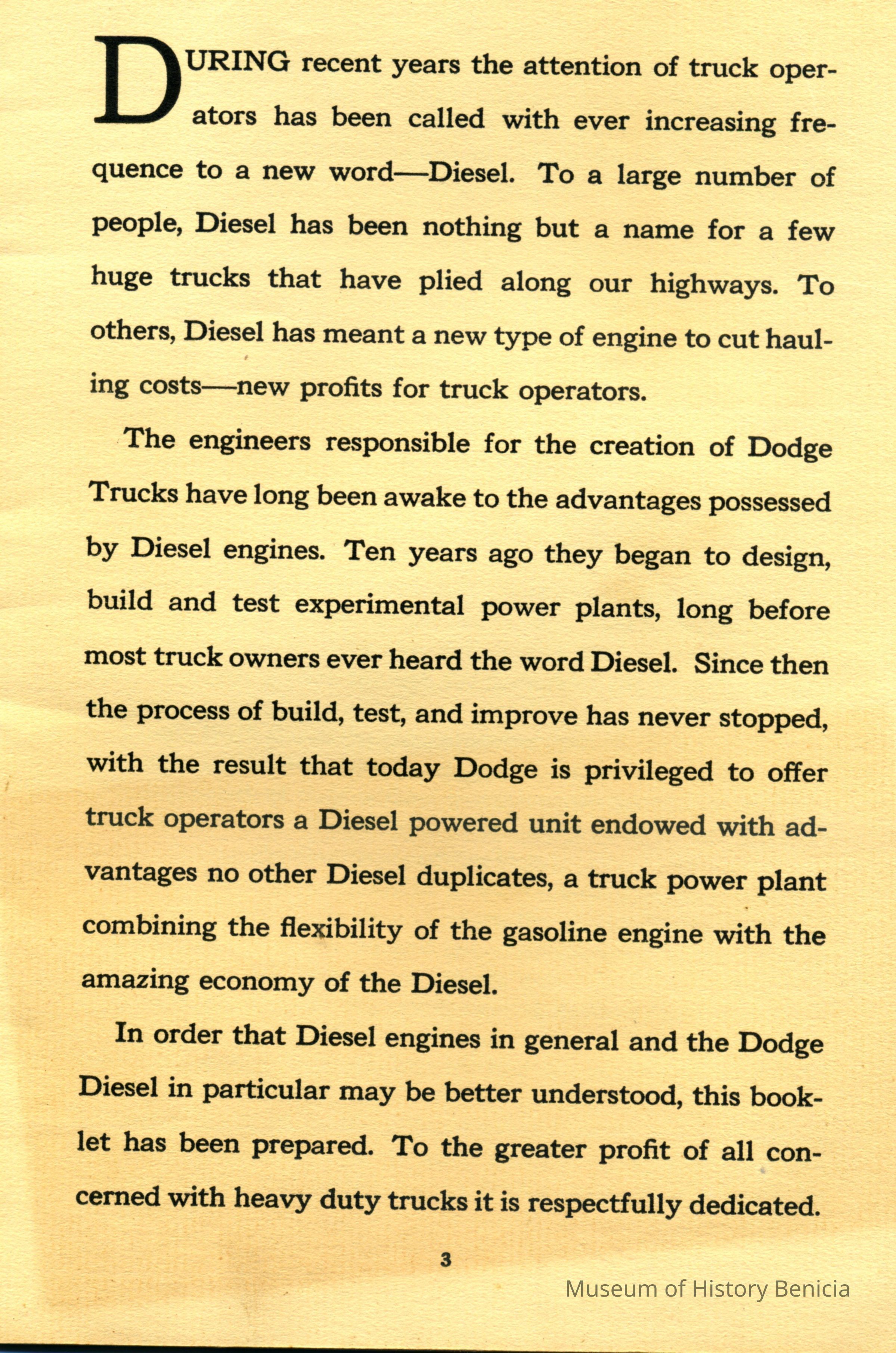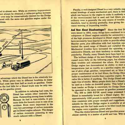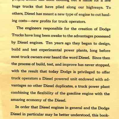 This is an early manual for the Dodge diesel truck engine. It explains what a diesel engine is and the advantages of this engine. The manual is 23 pages long and very detailed. This was obviously a new concept for many truck owners.Collection