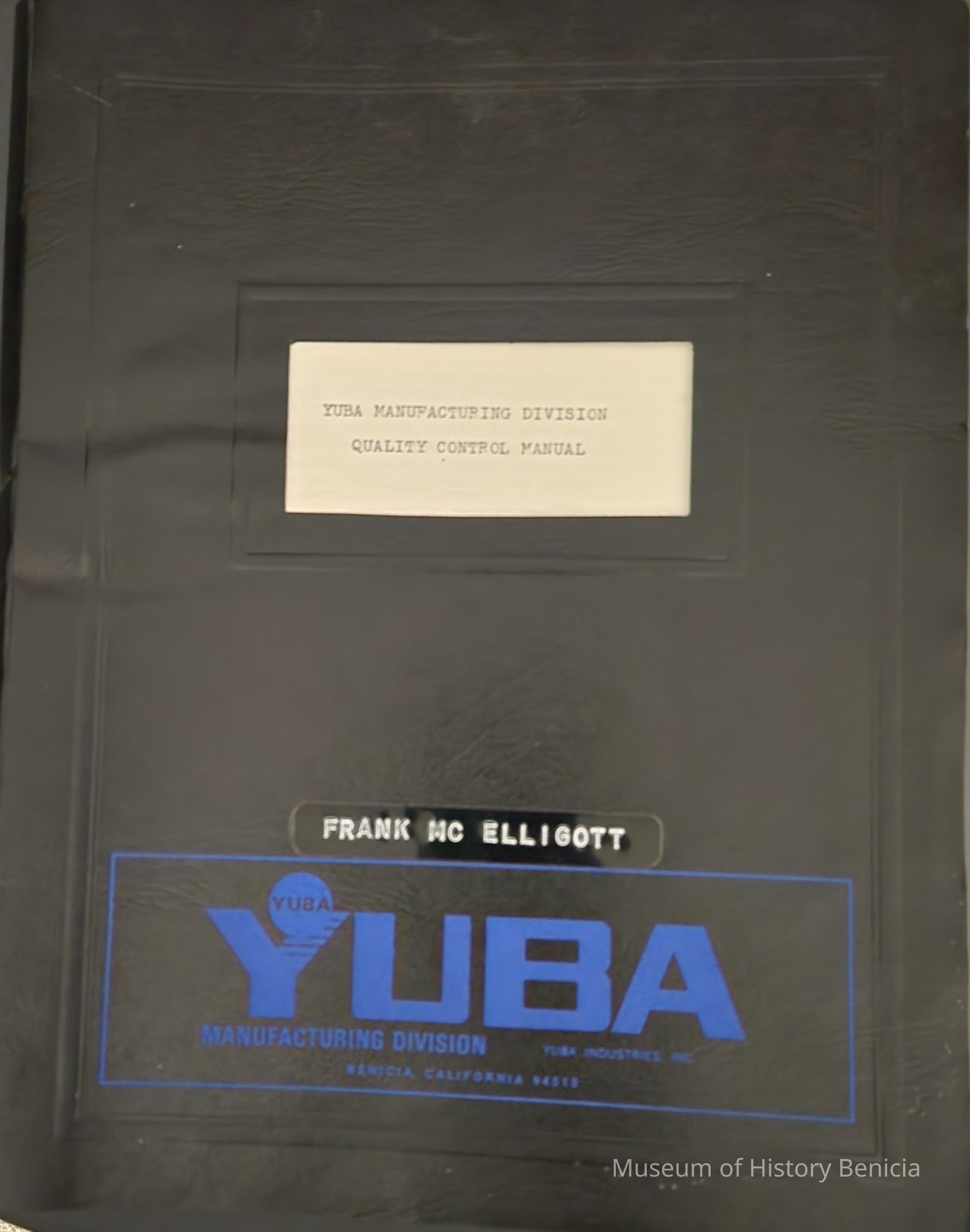 stick on label: Frank McElligott; printed in blue ink on lower portion of cover: Yuba Manufacturing Division Yuba Industries Inc. / Benicia, California 94510Collection