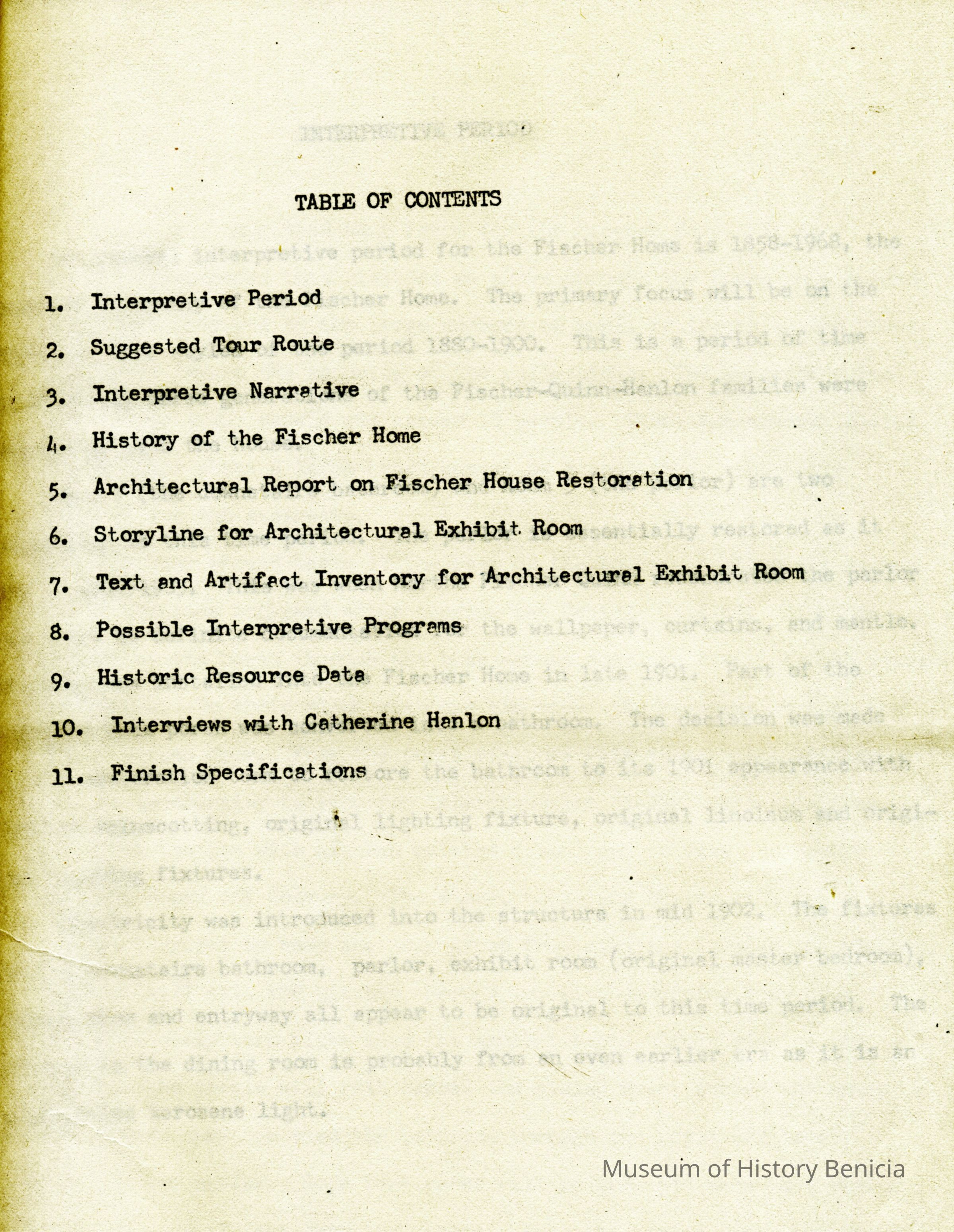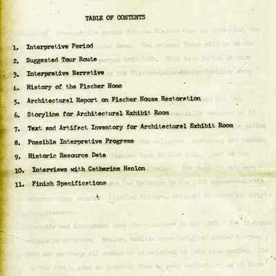 This is an instructional manual for tour guides at the Fischer/Hanlon house. It covers in detail the history of the house, ownership, architecture, artifacts, interviews with Catherine Hanlon, and much more. It contains drawings of the floor plans of the house as well as drawings showing beam construction, background material for historic research, as well as detail specifications on things such as the curtains.Collection