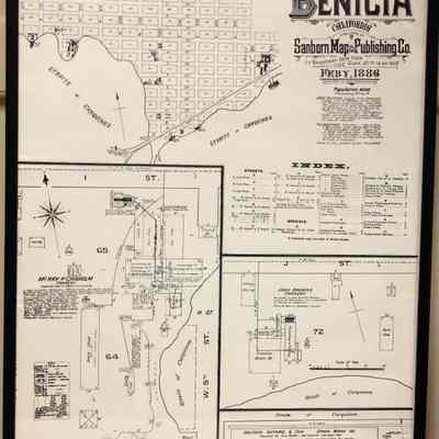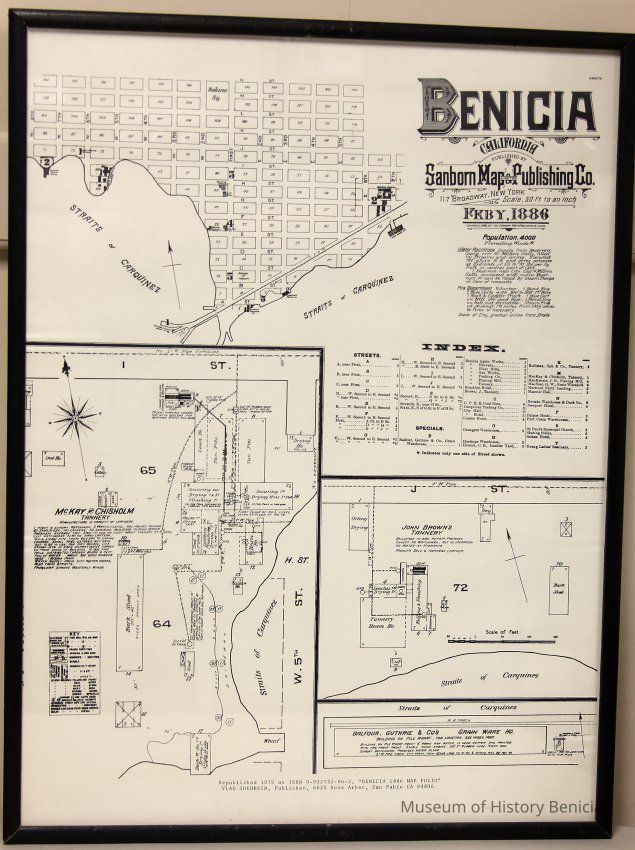 1979 reproduction of Plate 1 of 1886 Sanborn map of Benicia, in black wood frame. This plate shows McKay & Brown Tanneries and overall map of Benicia, with description of town in upper right corner. In black wood frame.Collection