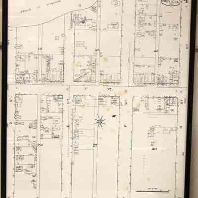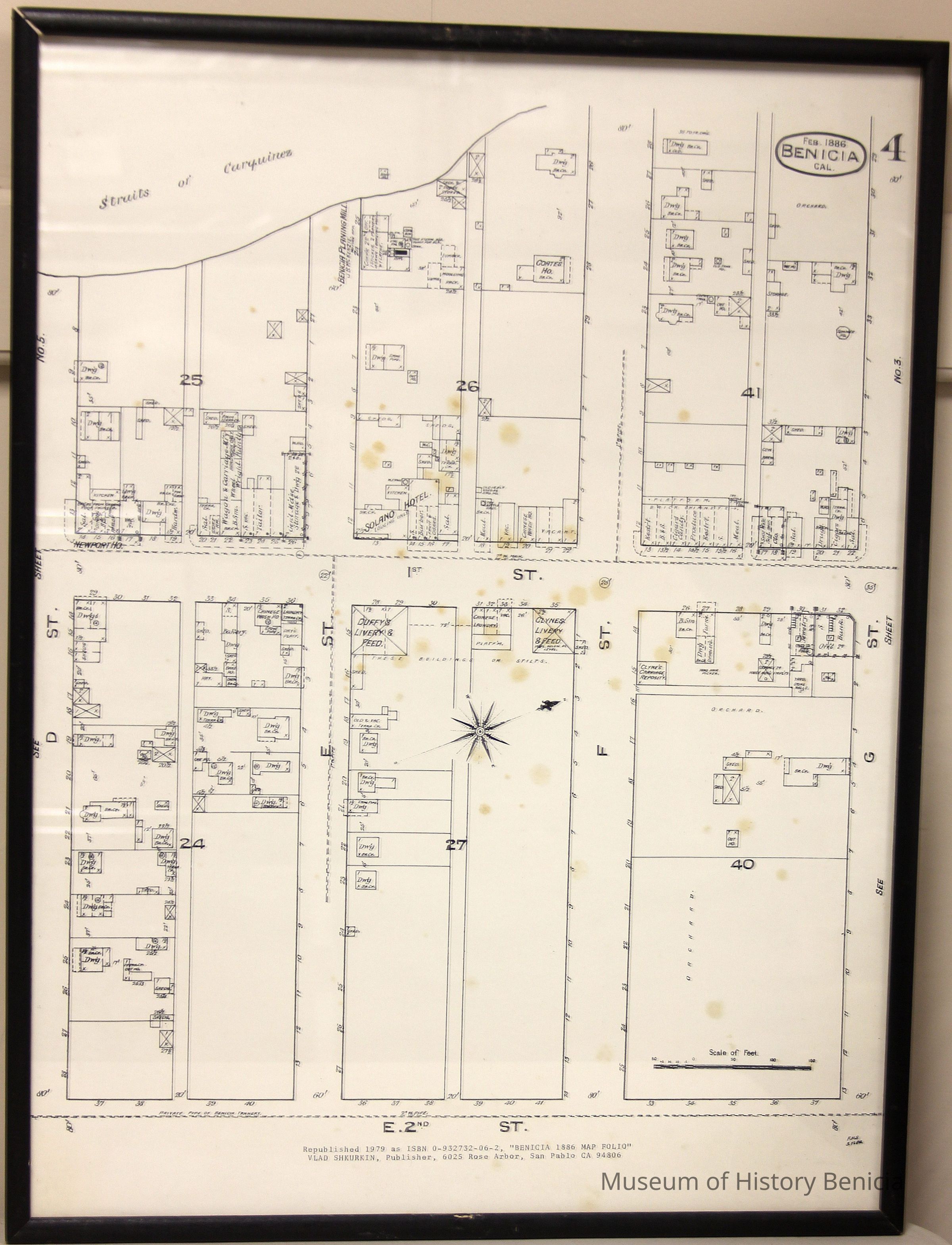 1979 reproduction of Plate 4 of 1886 Sanborn Map of Benicia. Shows First Street between D and G Streets. In black wood frame.