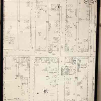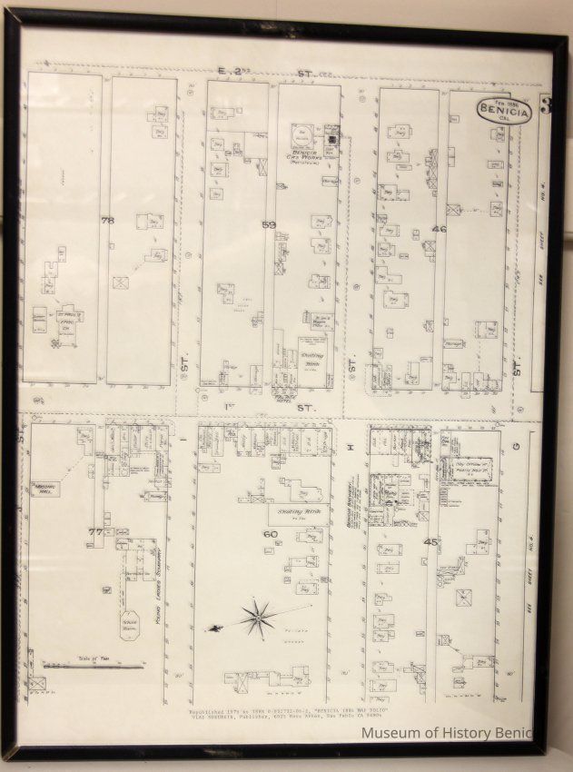 1979 reproduction of Plate 3 of 1886 Sanborn Map of Benicia. Shows First Street between G and J Streets. In black wood frame.