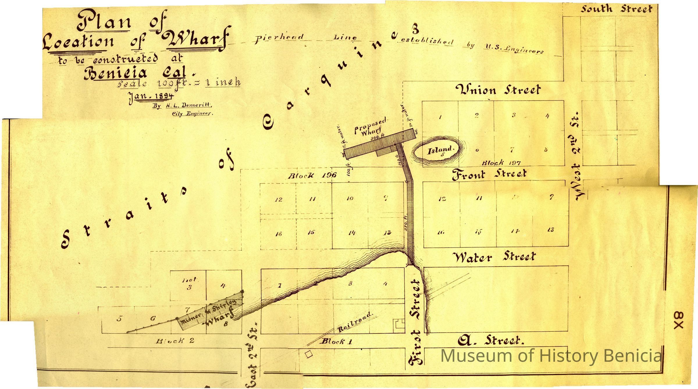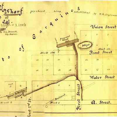 This is a map of a proposed wharf to be constructed at the foot of First Street in Benicia. The date of 01/1894 is shown on the map but this is obviously a copy of that map. It shows the blocks and lots that extend into the water past "A" street. The "streets" shown after A street are Water, Front, Union and South. The blocks that are partially in the water are blocks 1 and 2. The blocks totally in the water are 196 and 197. The island off the end of First street is in block 197 lot 5.Collection
