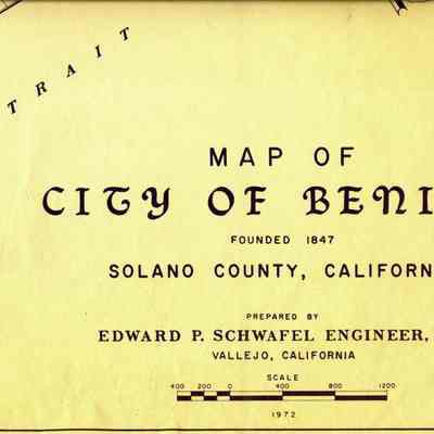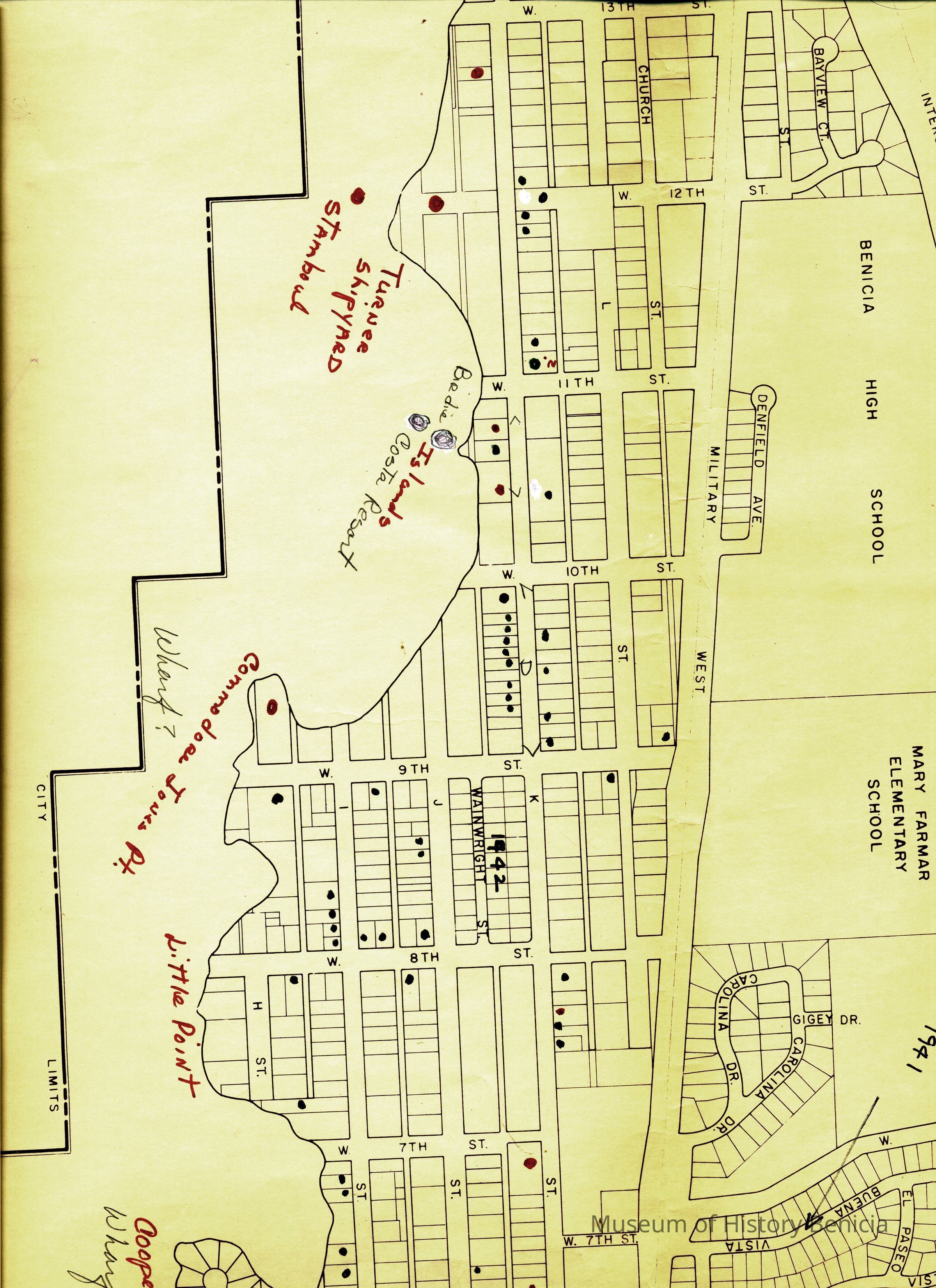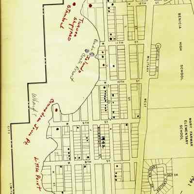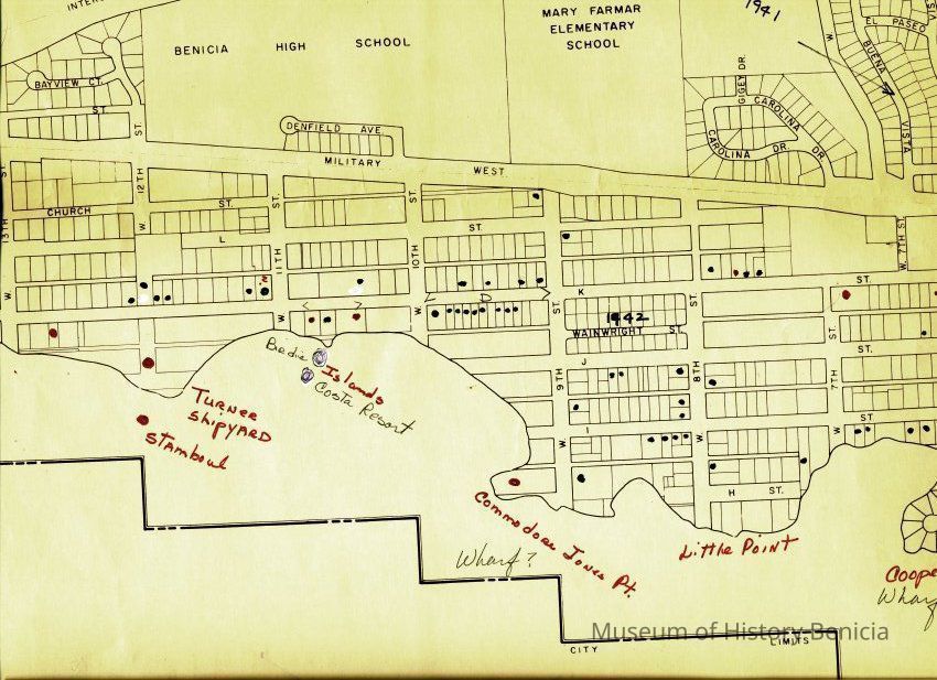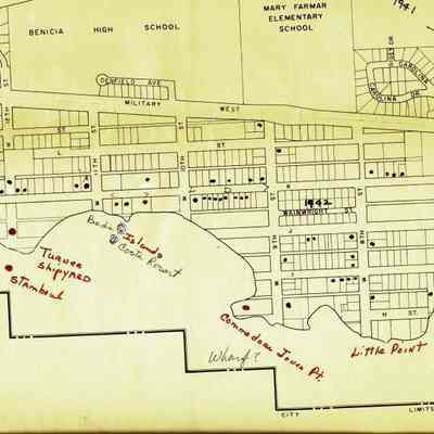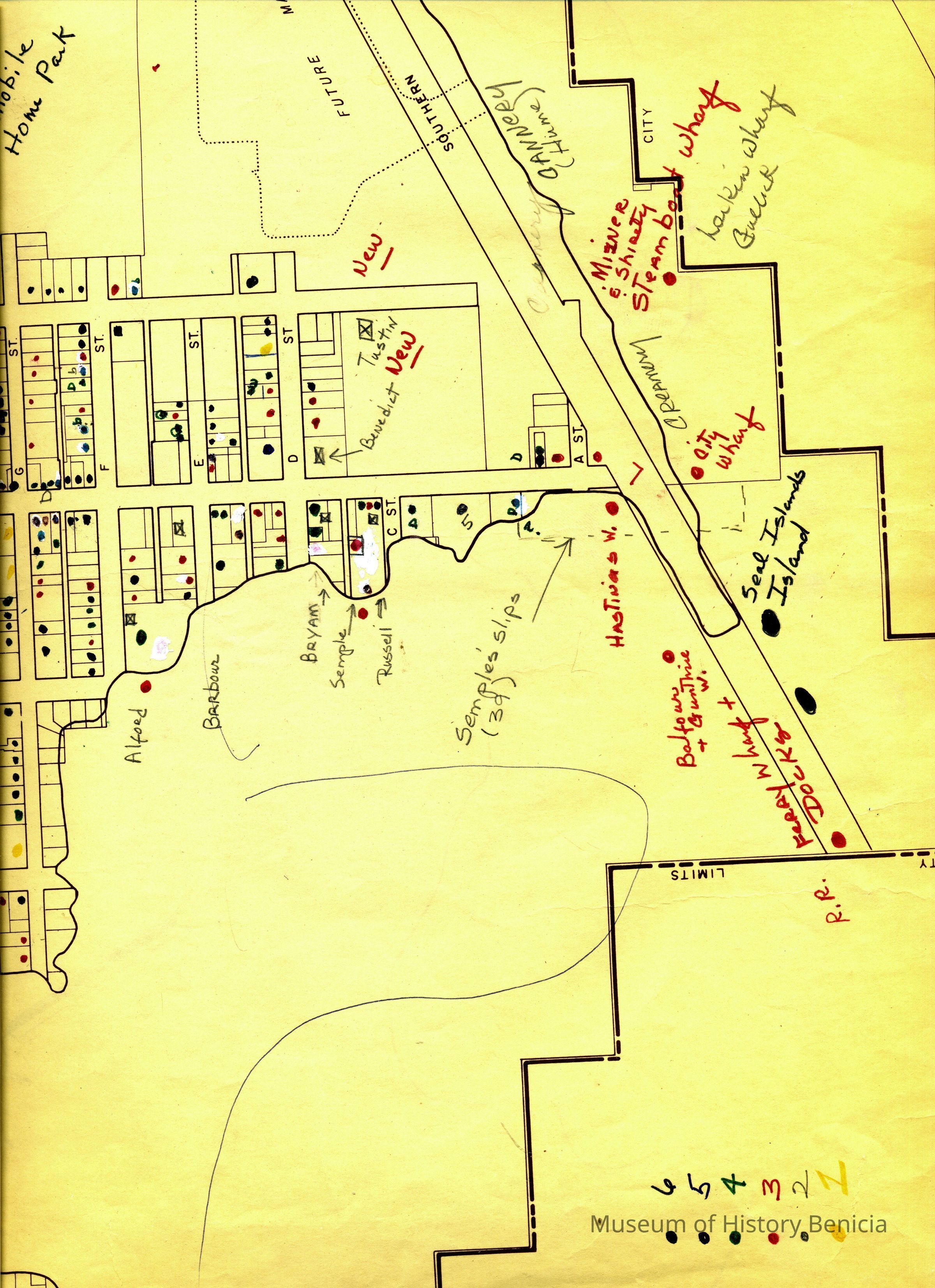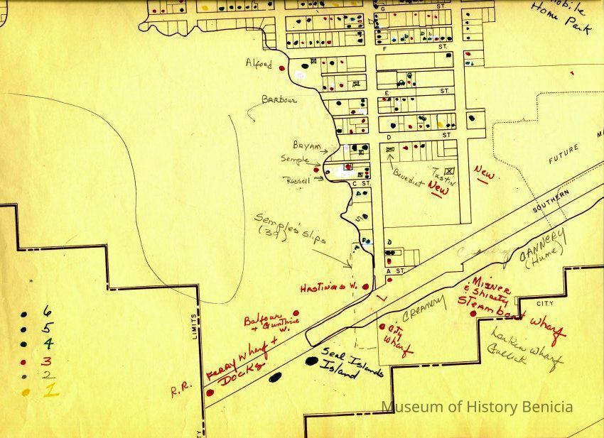 This is a map of the entire city limits of Benicia. It extends from the Carquinez Straits North to Lake Herman and from the State Park to the far side of the Arsenal. It has been hand marked with various historical locations and is color coded for six different types of structures. Not sure what the color codes indicate.