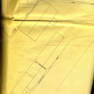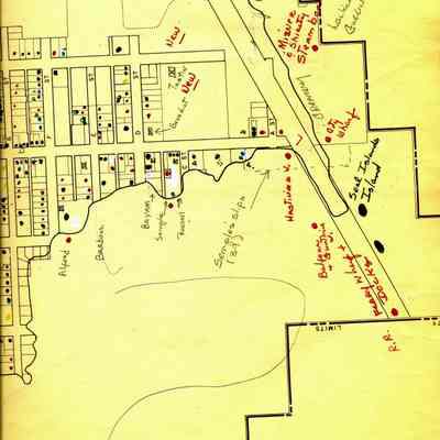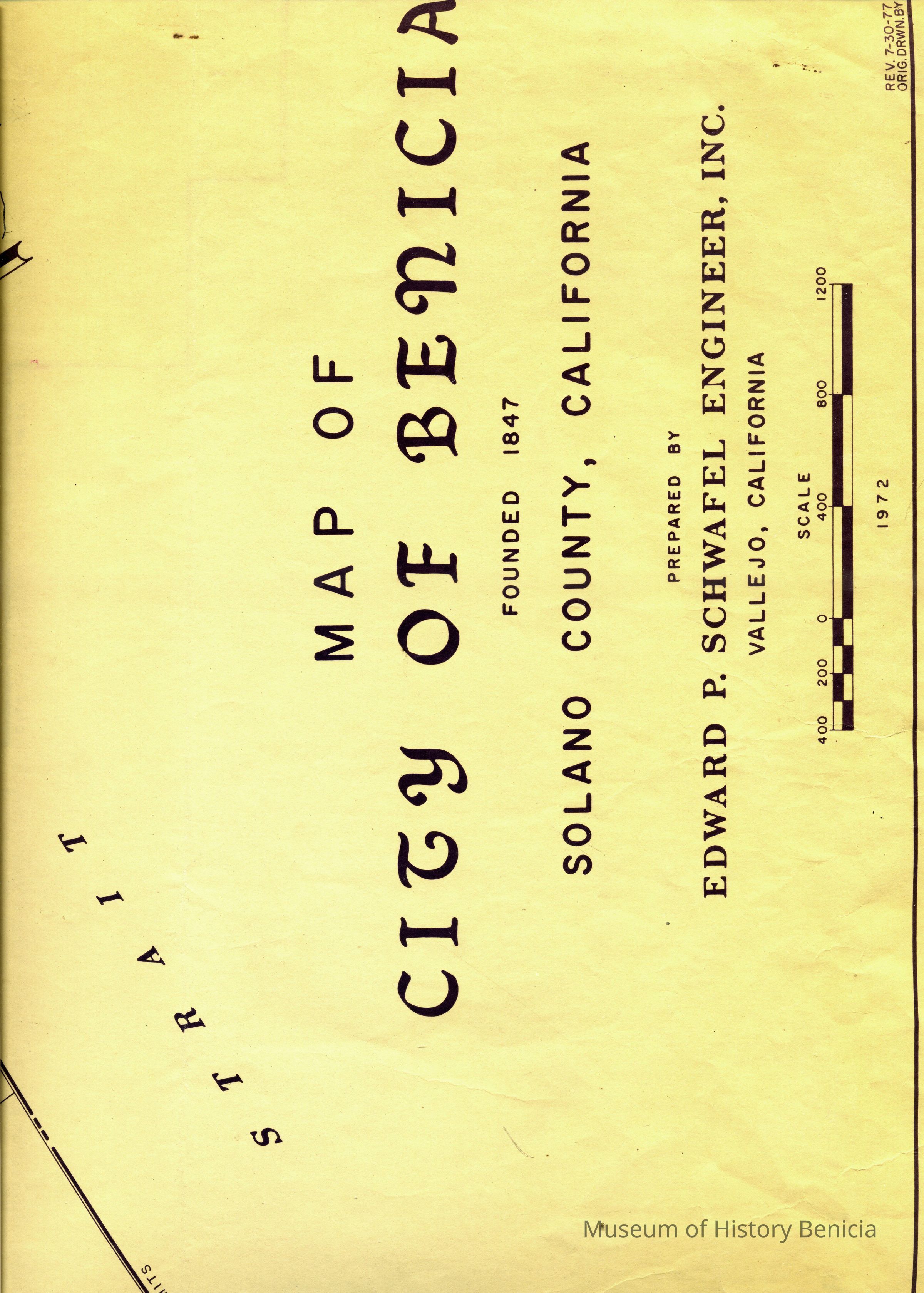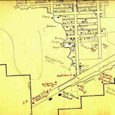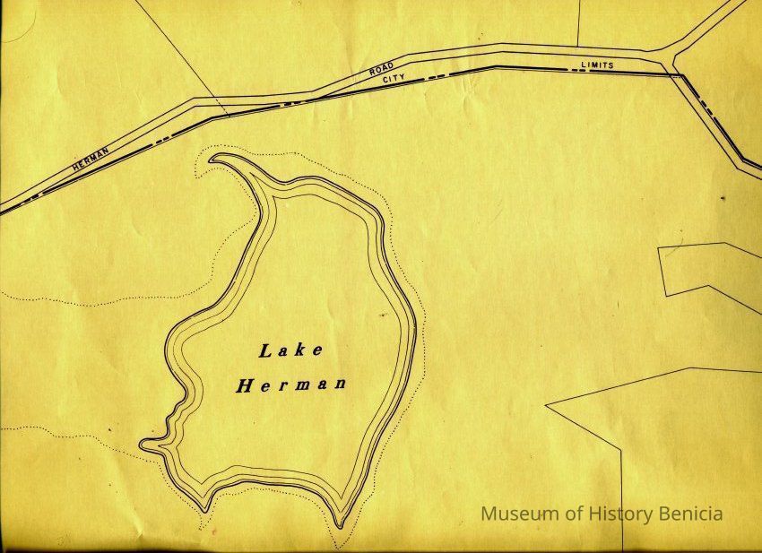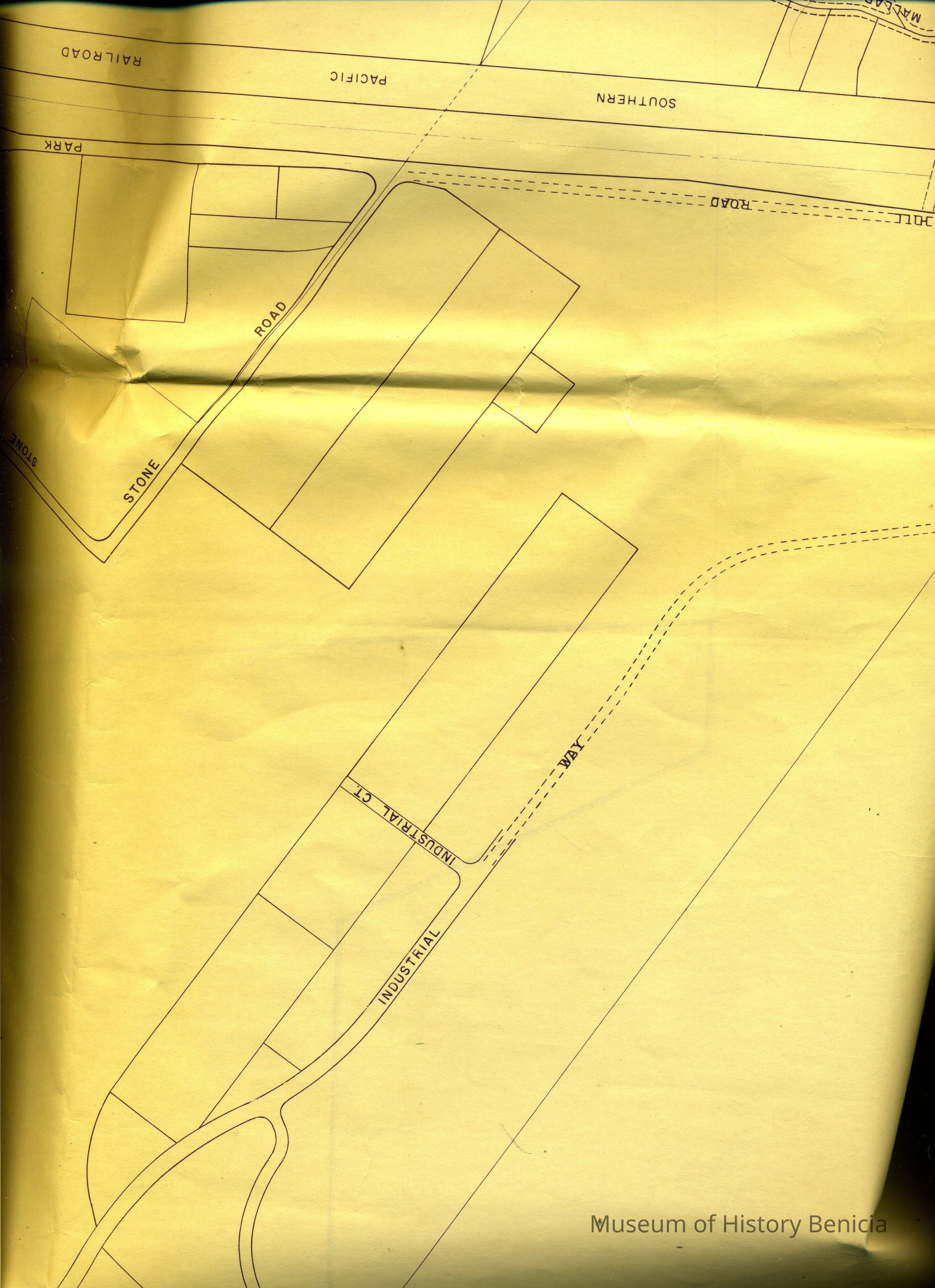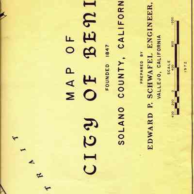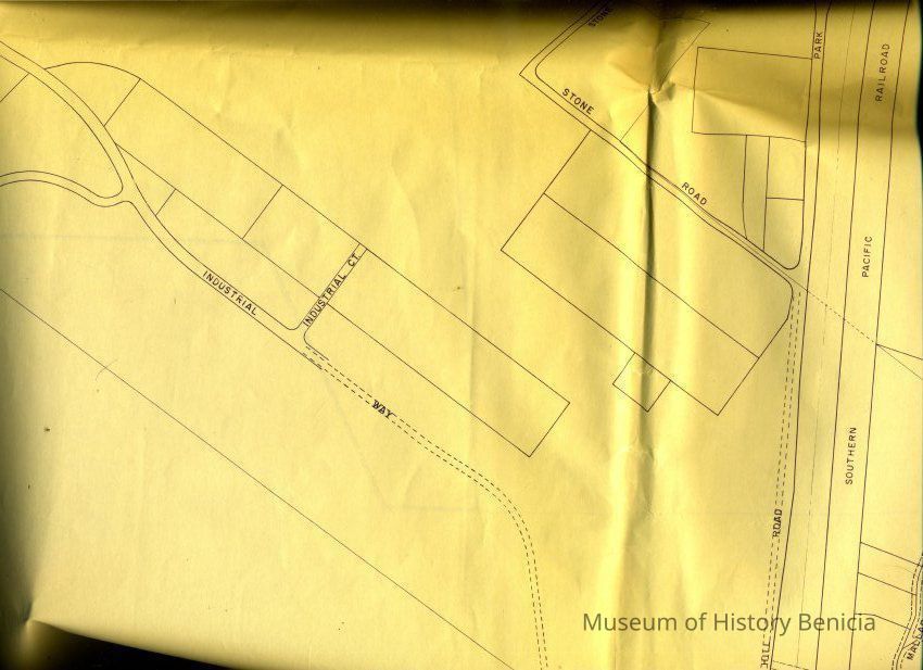 This is a map of the entire city limits of Benicia. It extends from the Carquinez Straits North to Lake Herman and from the State Park to the far side of the Arsenal. It has been hand marked with various historical locations and is color coded for six different types of structures. Not sure what the color codes indicate.