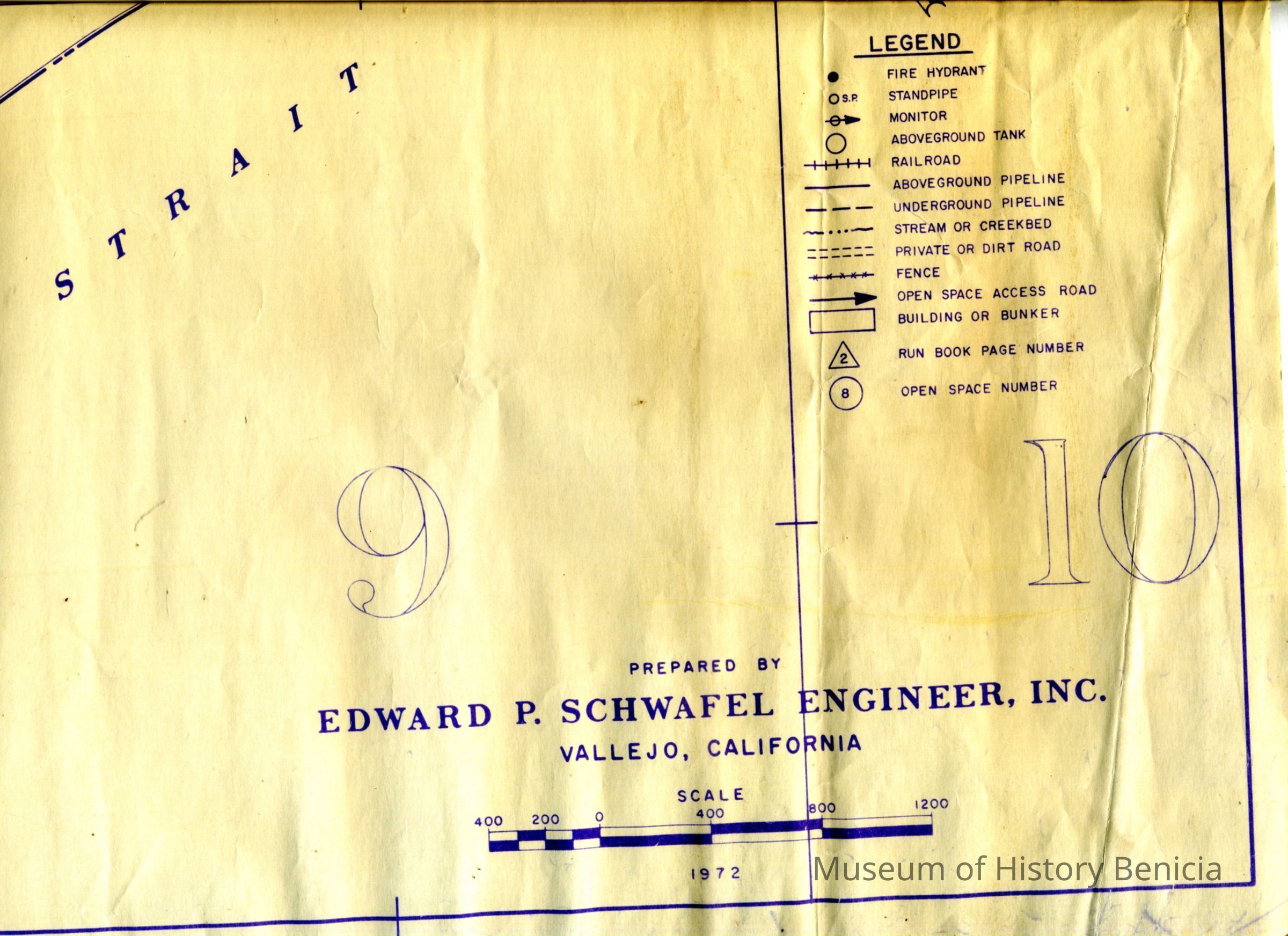 This is a map of Benicia drawn by Edward P. Schwafel, Engineer. The map shows Benicia from Hwy 680 to West 6th street and North to the refinery. Marked on the map are fire hydrants, stand pipes, RR lines, pipelines, creeks, and open space access roads. Not sure of the purpose for this map.Collection