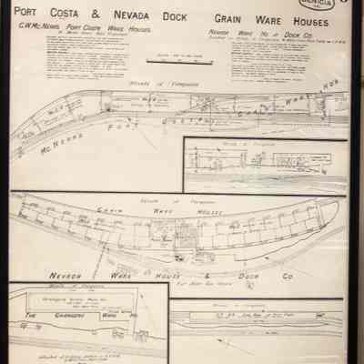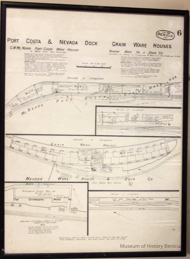 1979 reproduction of Plate 6 of 1886 Sanborn Map of Benicia. Shows plans of grain warehouses and dockside facilities at Port Costa and Nevada Dock. In black wood frame.Collection