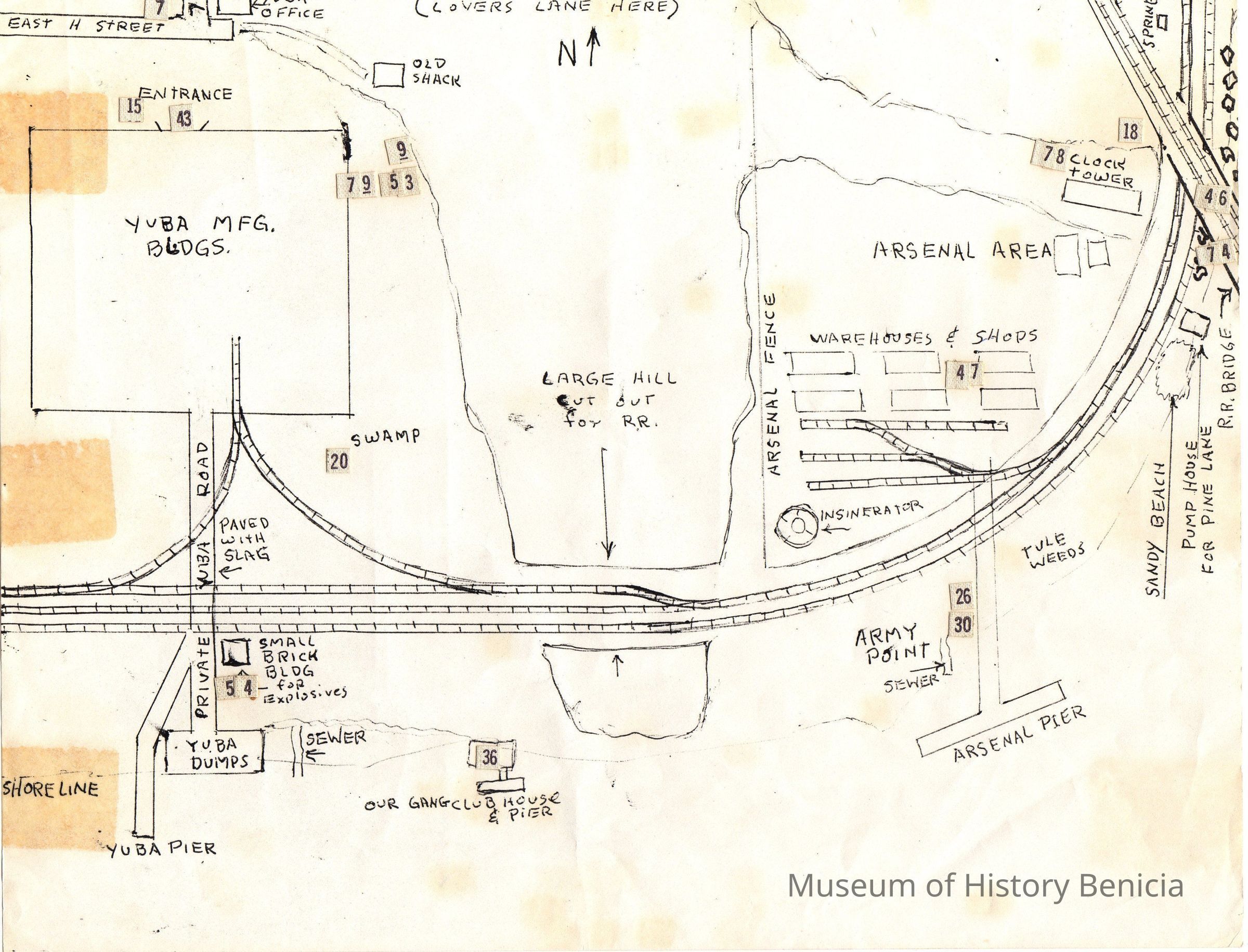 Hand drawn map (not to scale) by Bill Freitas, Benicia Resident, from memory of the 1930's era Benicia