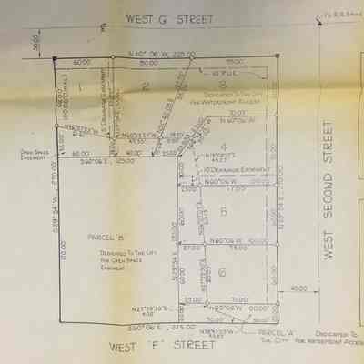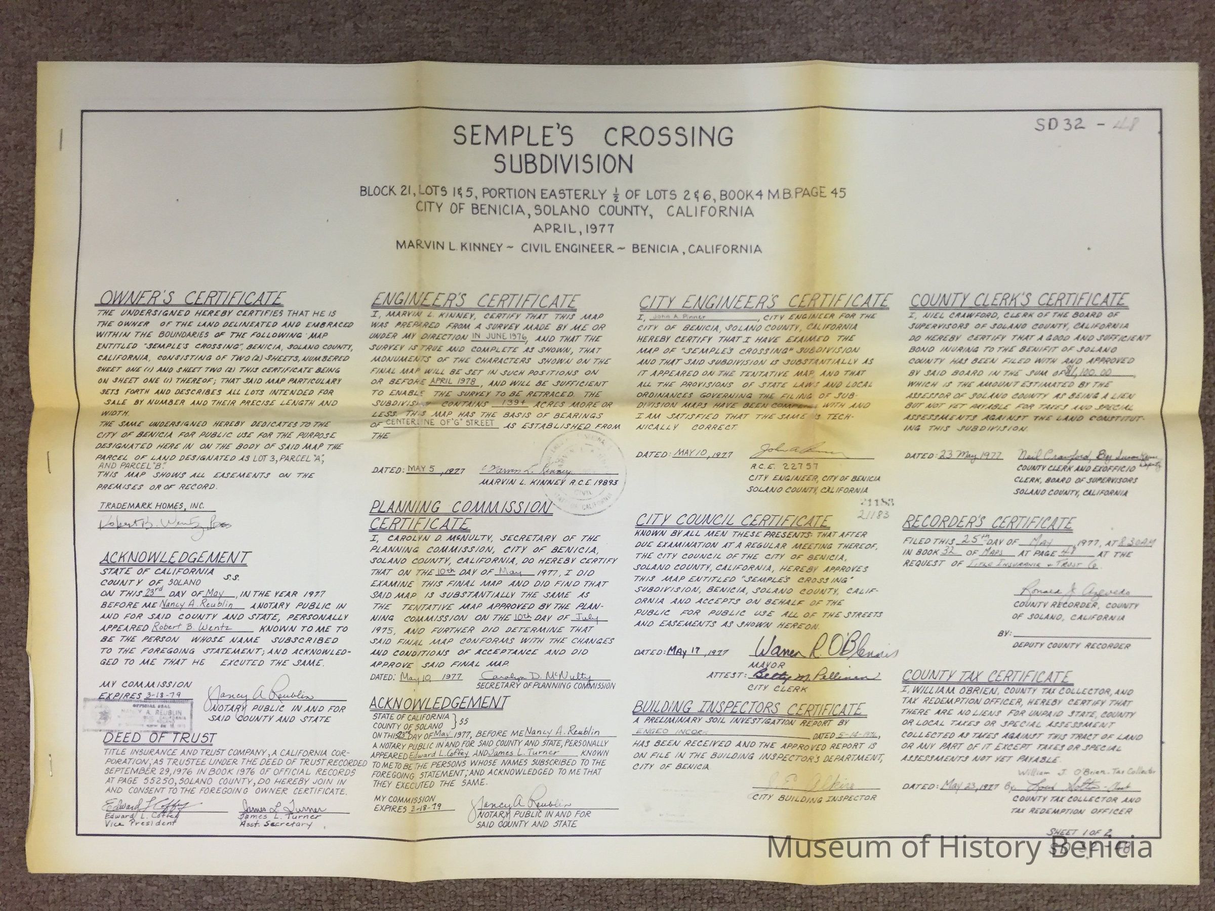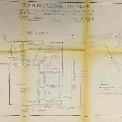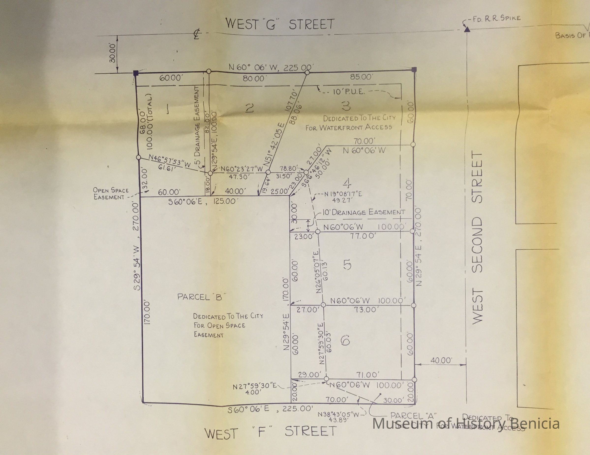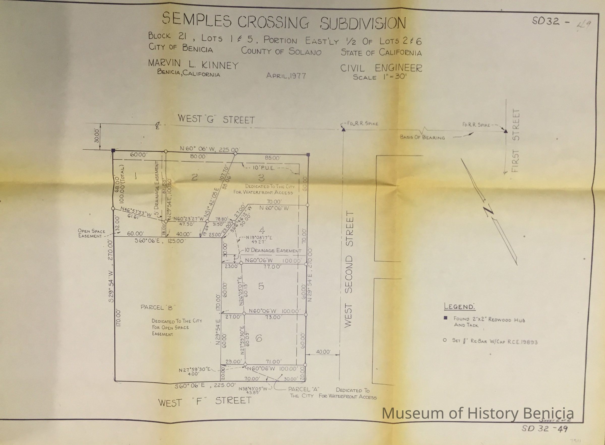 The first is a Property Plot Map of 'Semple's Crossing Subdivision produced in April 1977 and recorded on May 25th, 1977. The map includes the north east one fourth of a block in west Benicia between West Second Street (now Semple Court) and West Third Street and between West F Street and West G Street (now Semple Crossing). The south west corner, which involved over a fourth of the plot, was dedicated to the city for open space easement which is reasonable in that this area is under water. Five buildable lots were created; two on the north and three on the east, all with water frontage.