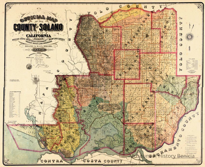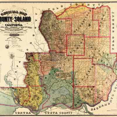 Map of Solano County from 1890. The map shows all of the city regions by name and the names of land holders within the county. It also shows the amount of land owned by each.
