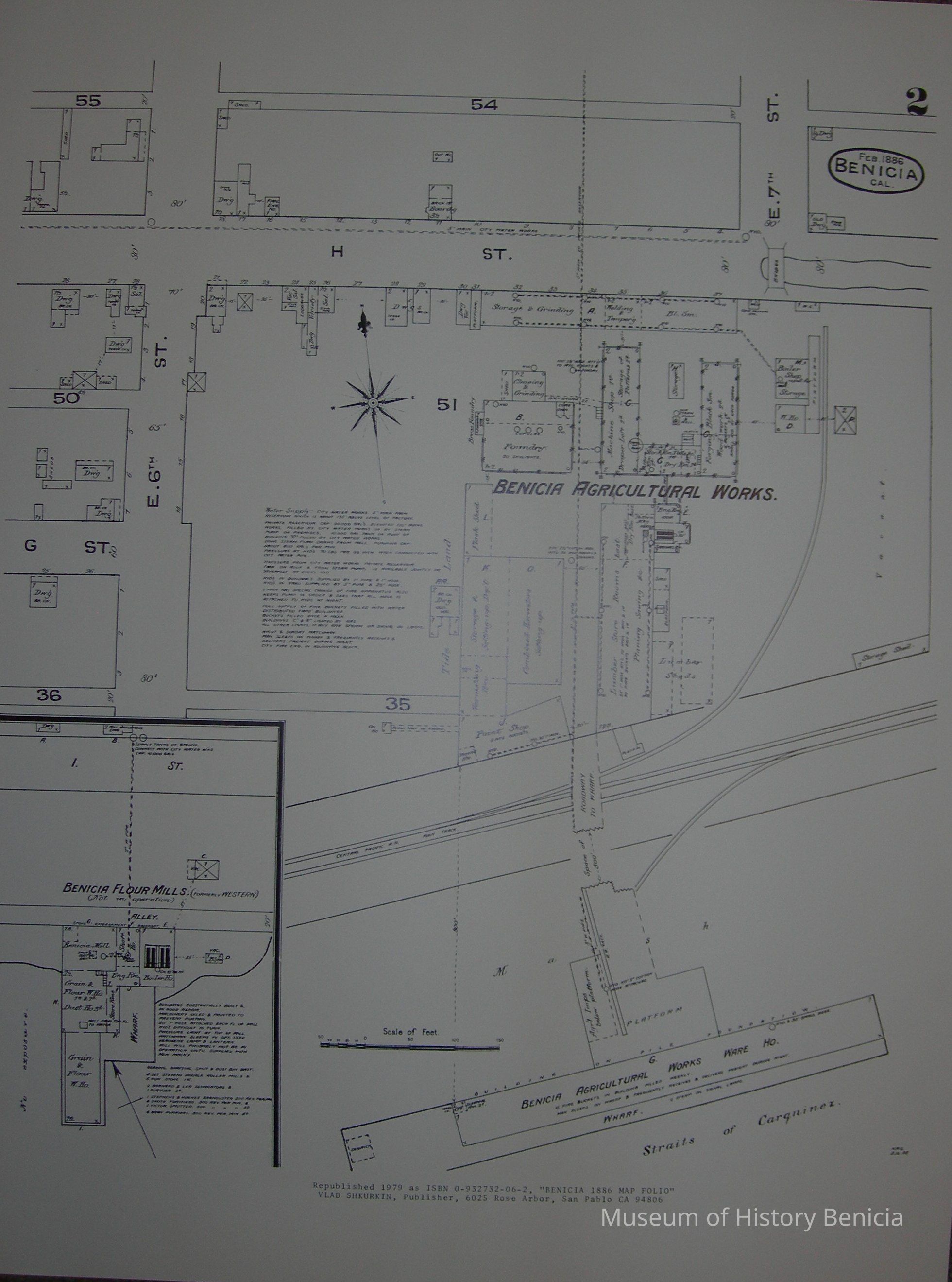 Covers the Benicia Agricultural Works (south and east of H and East 6th Streets) with its wharf and warehouse and an inset of the Benicia Flour Mills.