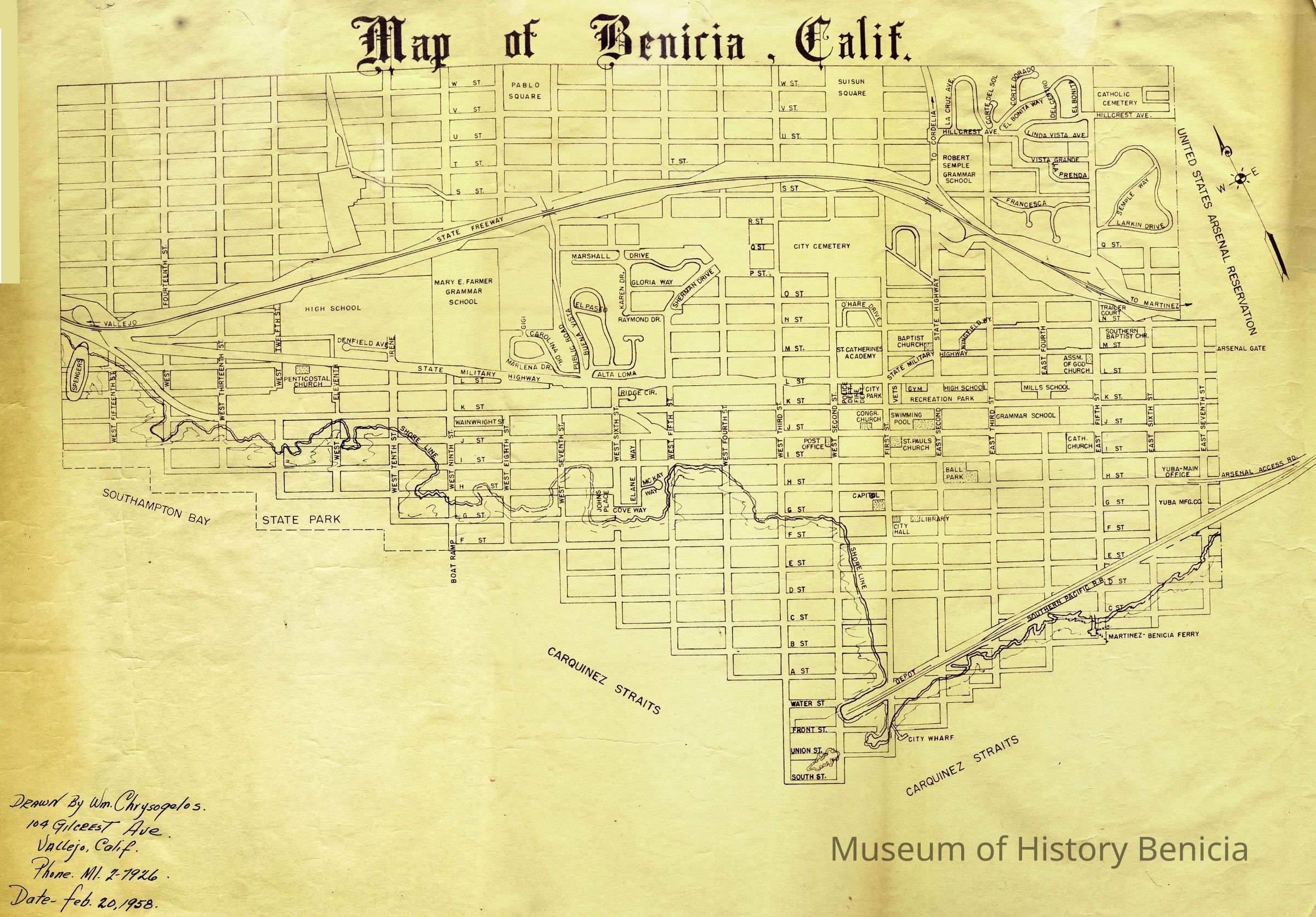 This is a map of Benicia. It says it was drawn by Wm. Chrysogelos from Vallejo. The date on the map is 02/20/1958.