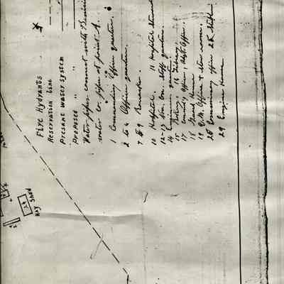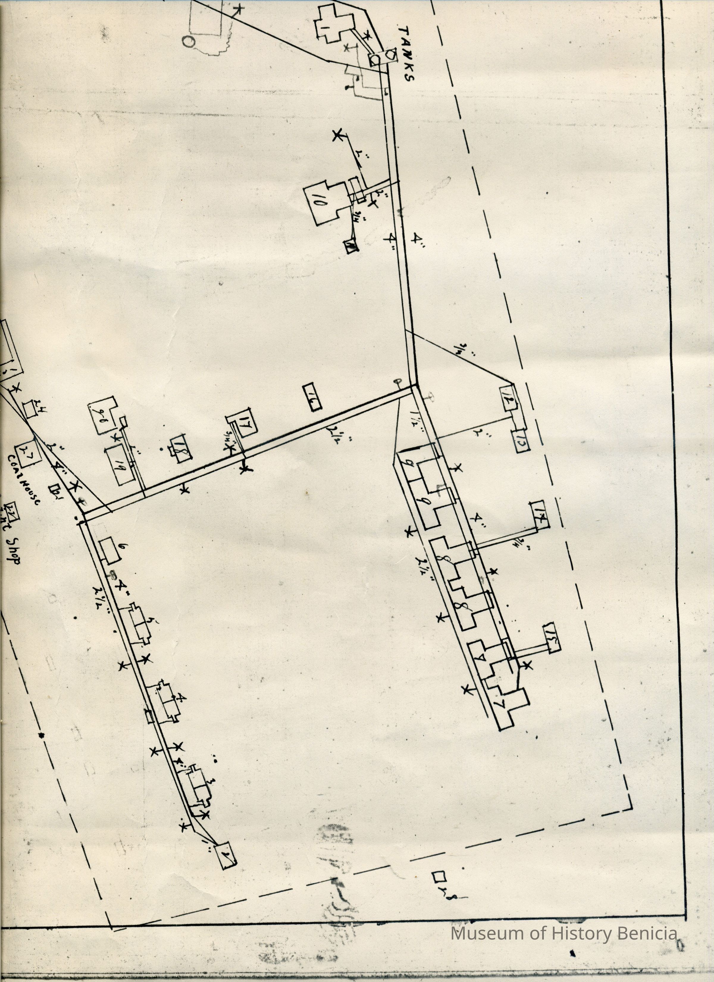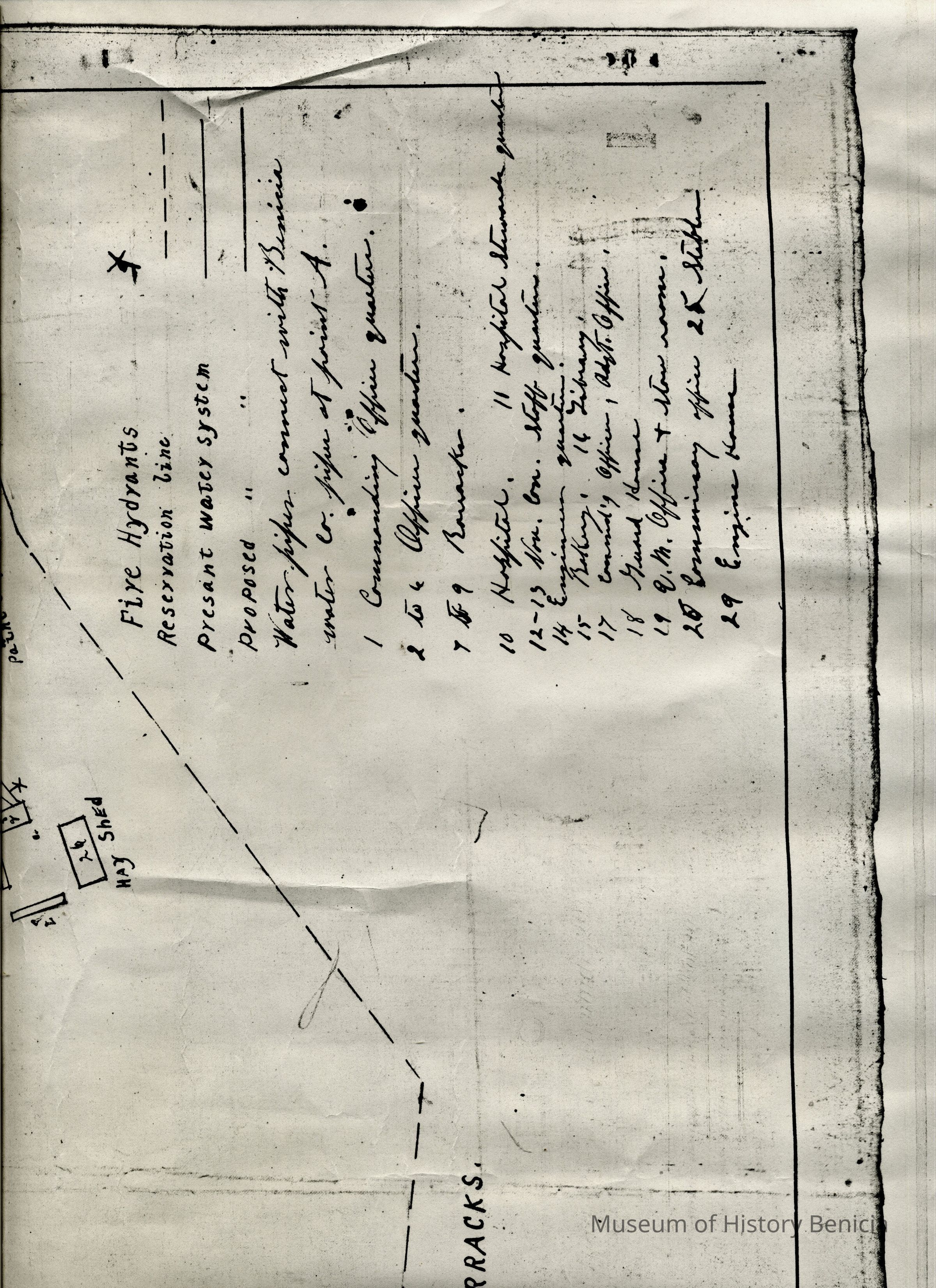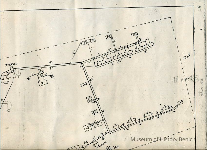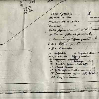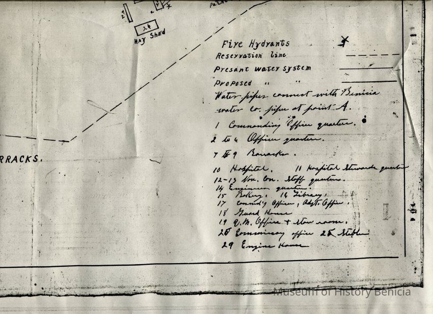 Map of Benicia Barracks date unknown. It is a copy of a map held at the National Archives in Record Group 92. The map shows the water lines and fire hydrants in the Arsenal.Collection