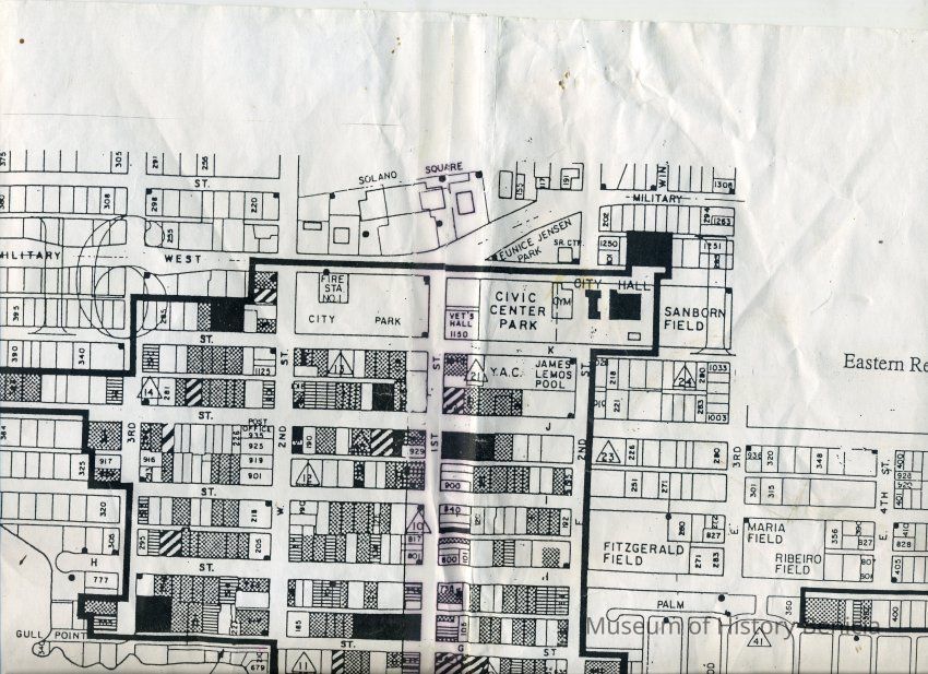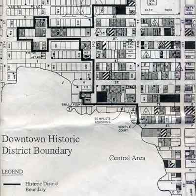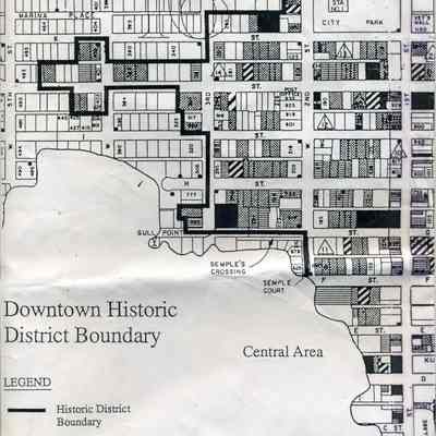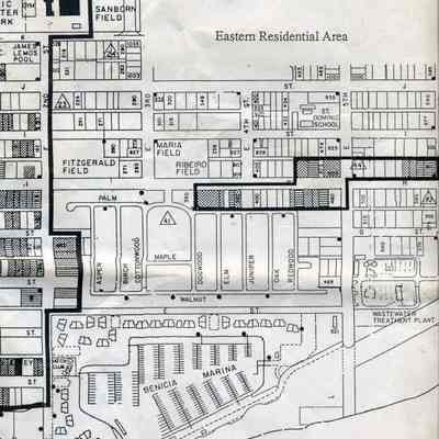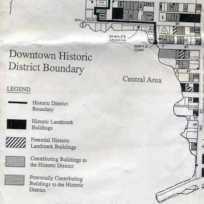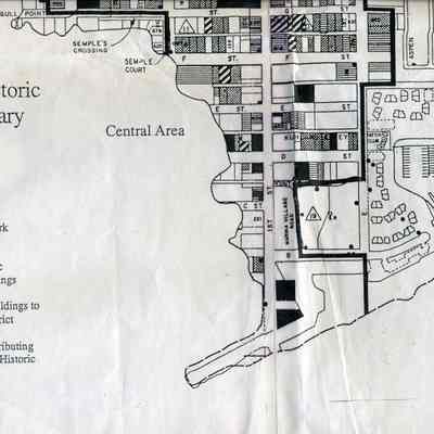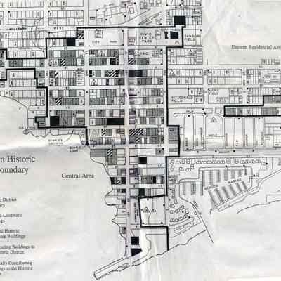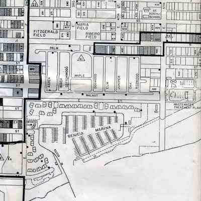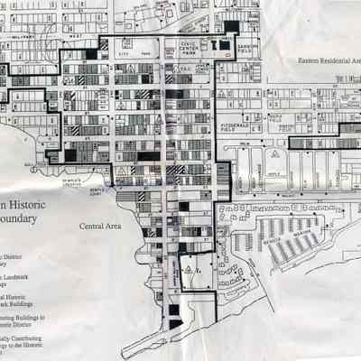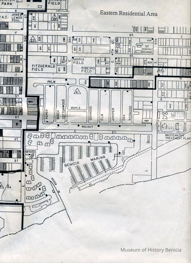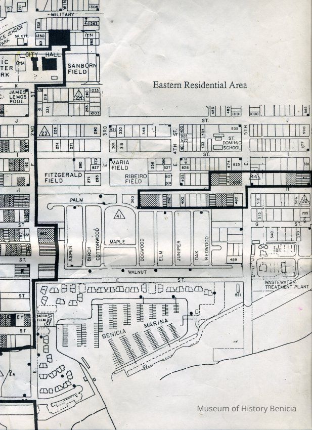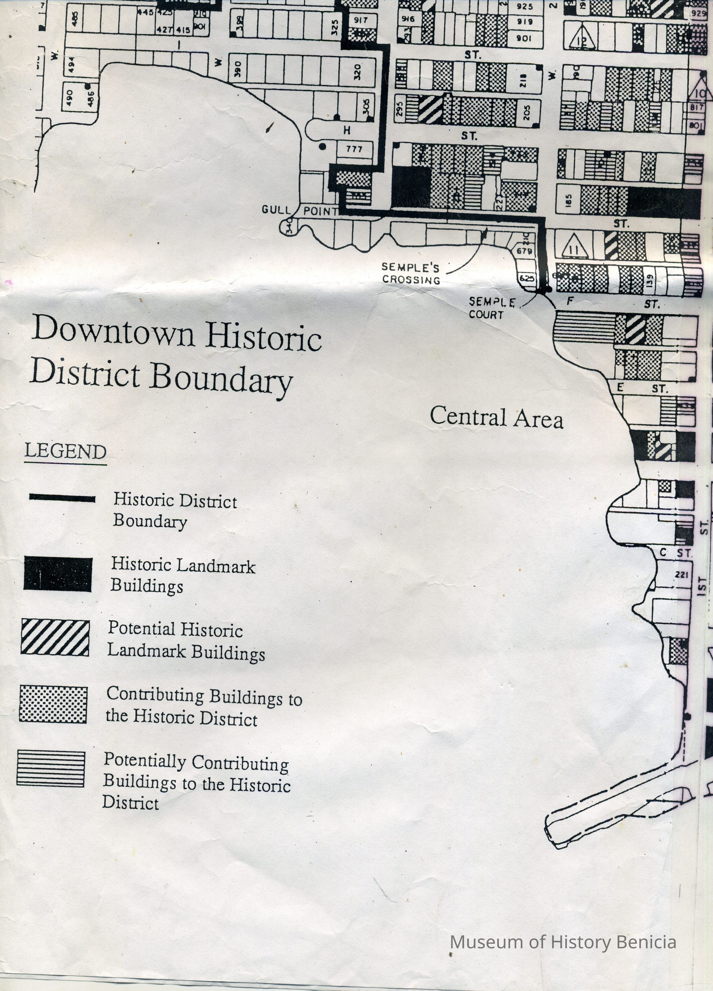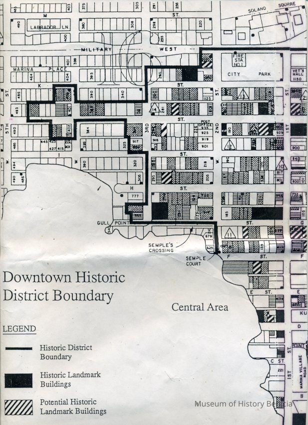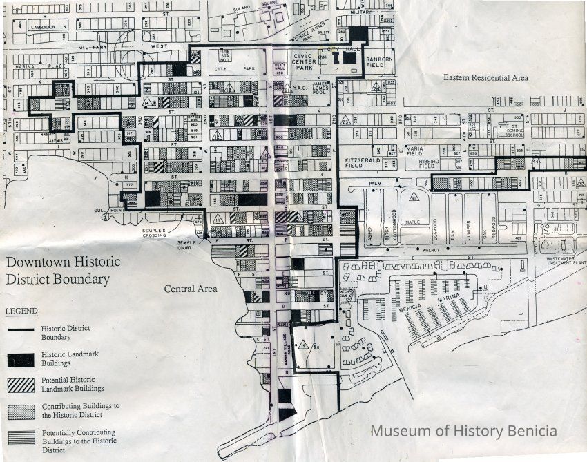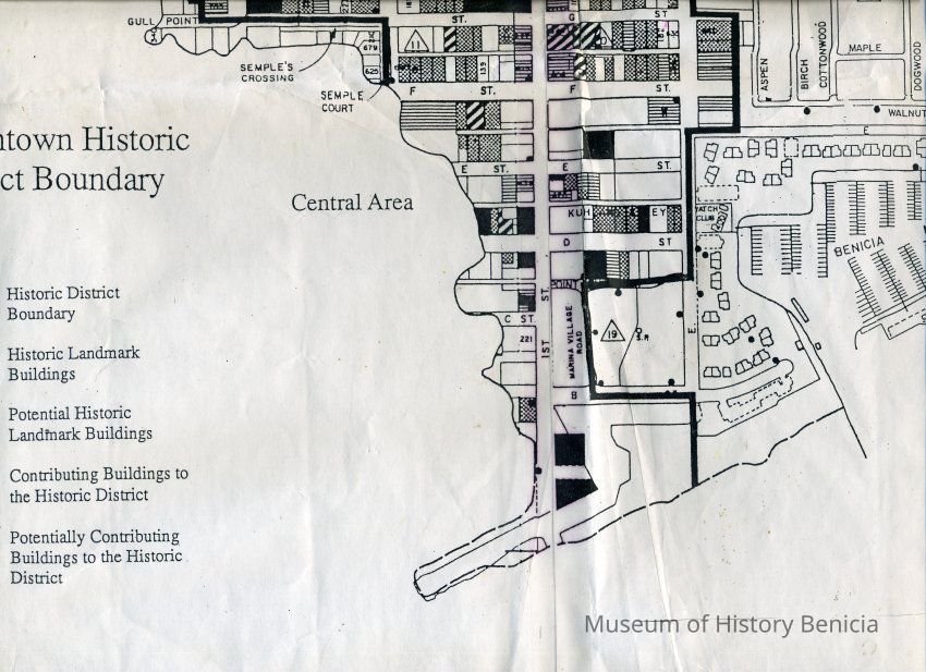 This is a map of the boundaries of the Benicia Historic District. It shows buildings that are historic, potentially historic, contributing, and potentially contributing. There is no date on the map so not sure which historic survey this relates to.Collection
