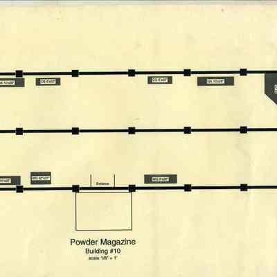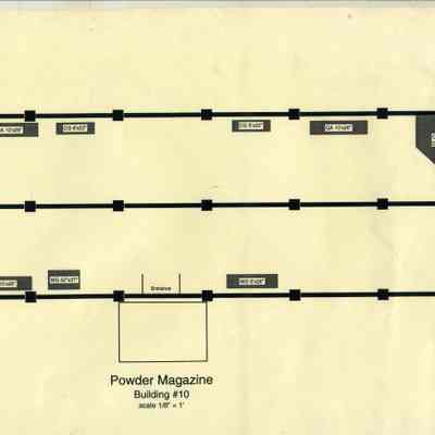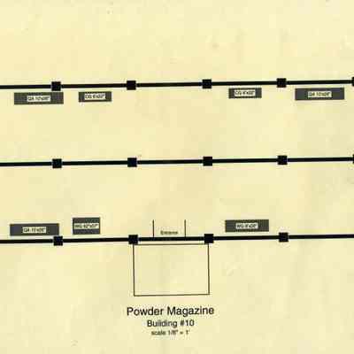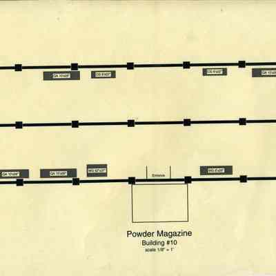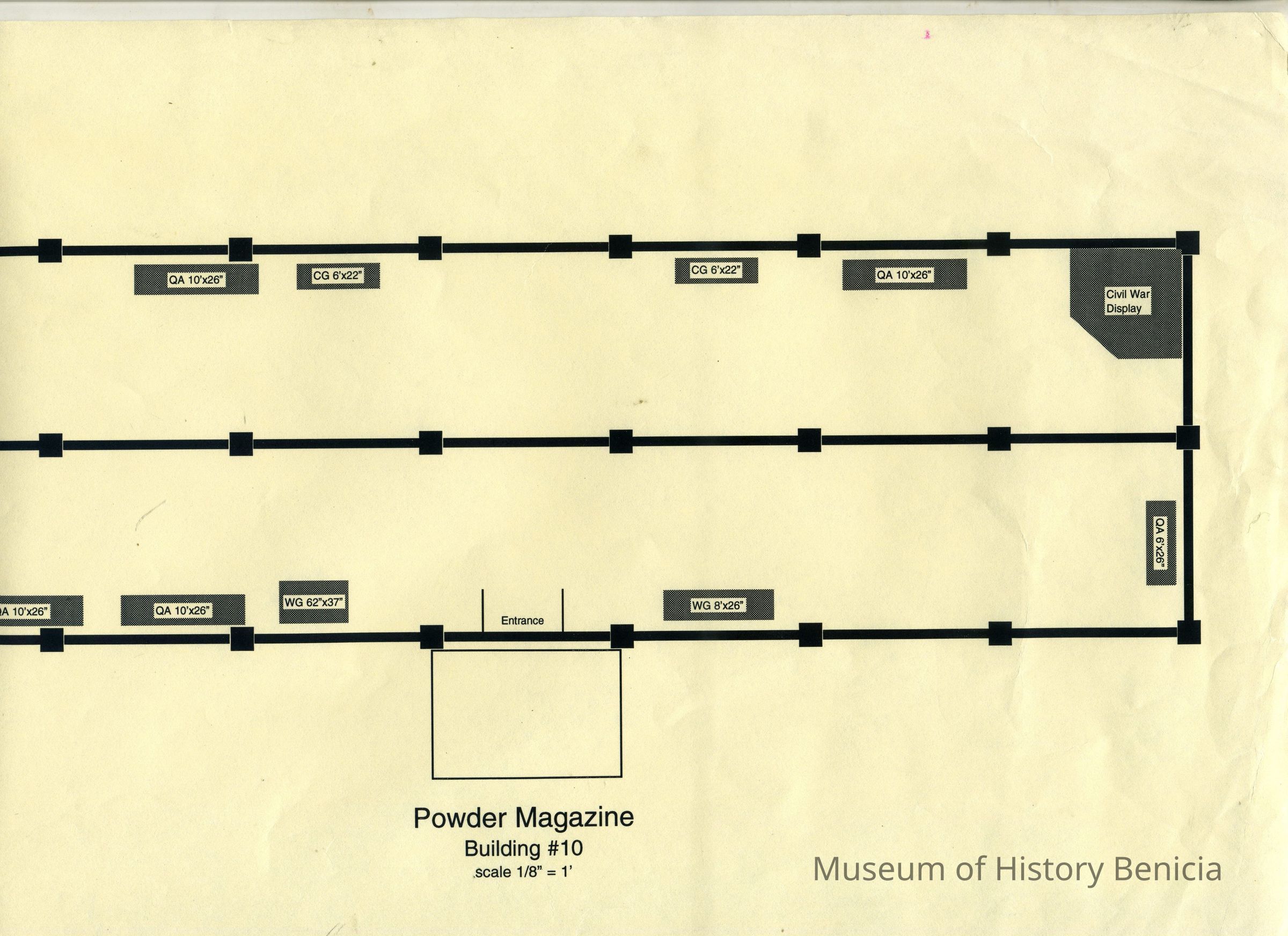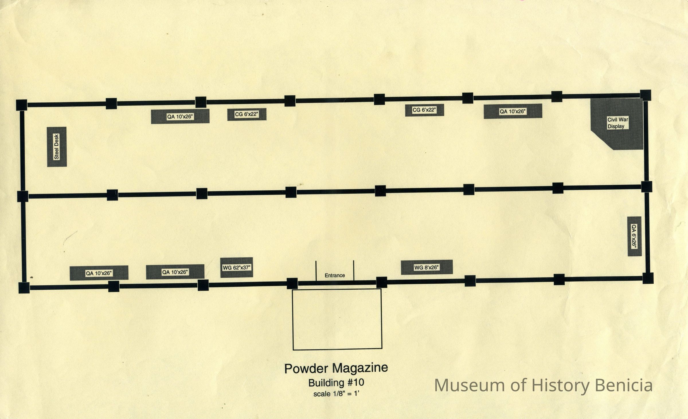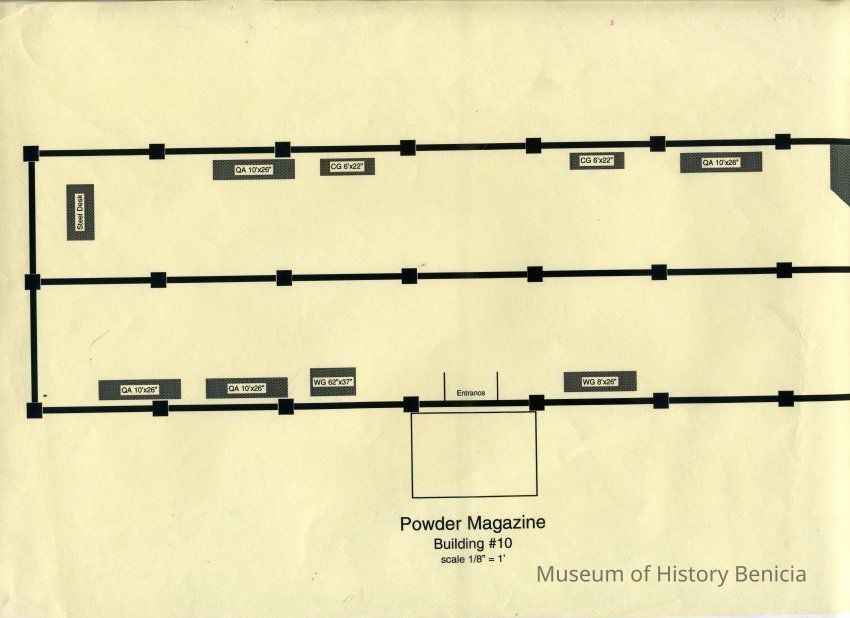 This is a map of the Benicia Historical Museum Powder Magazine. It shows the displays and their size in that building.