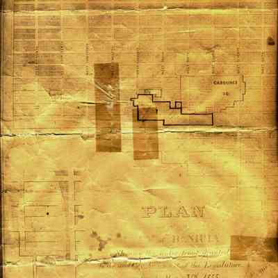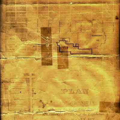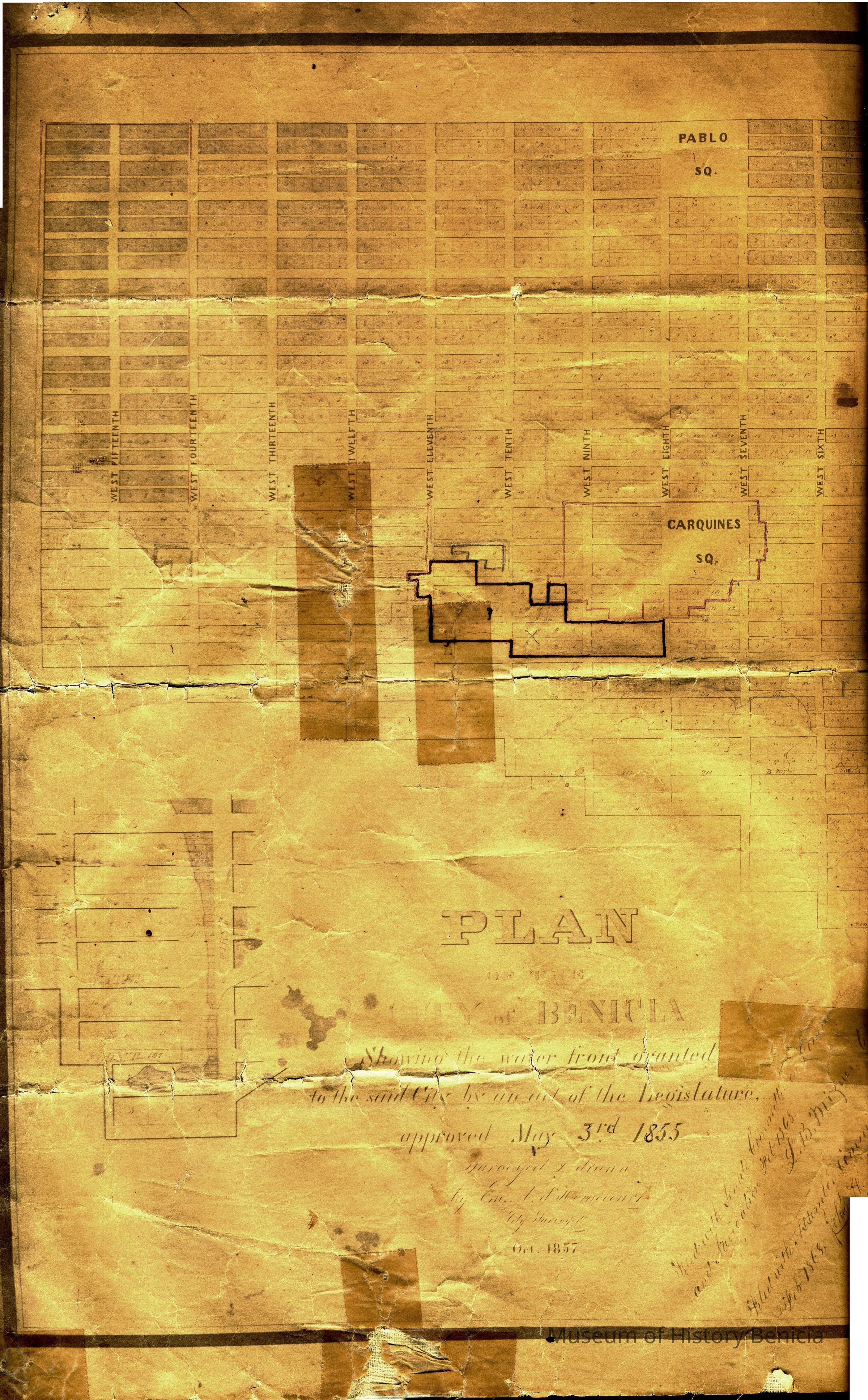 A small map of the City of Benicia dated October, 1857. It is on rag paper and shows the blocks comprising the plan for Benicia as of 1855. "Showing the water front(sic) granted to said city by an act of the Legislature approved May 3rd, 1855". This is written in the legend. Also written on the map is: "Filed with Senate Committee at _____________ Feb, 1868. signed L.B. Mizner Chairman." Also; "Filed with __________ in C______ Feb, 1868. John H. Moore".