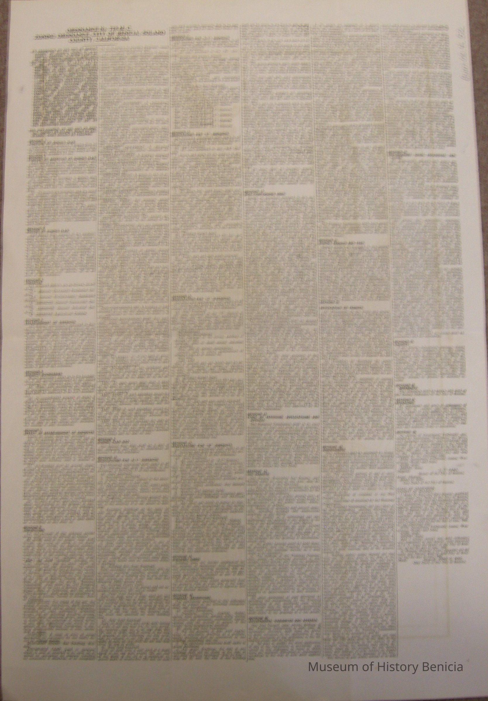 On the back is the Ordinance No. 775MC Zoning Ordinance City of Benicia, Solano County, California. It has a total of 28 sections with the map being section 9