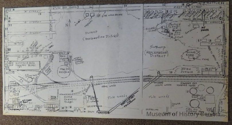 A copy of parts of two hand drawn maps (not to scale) by Bill Freitas, Benicia Resident, from memory of the 1930's era Benicia
