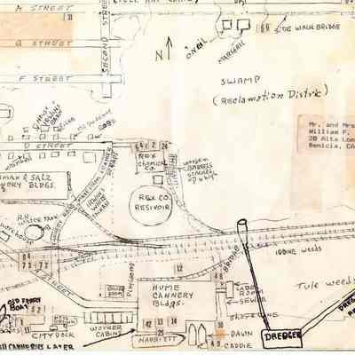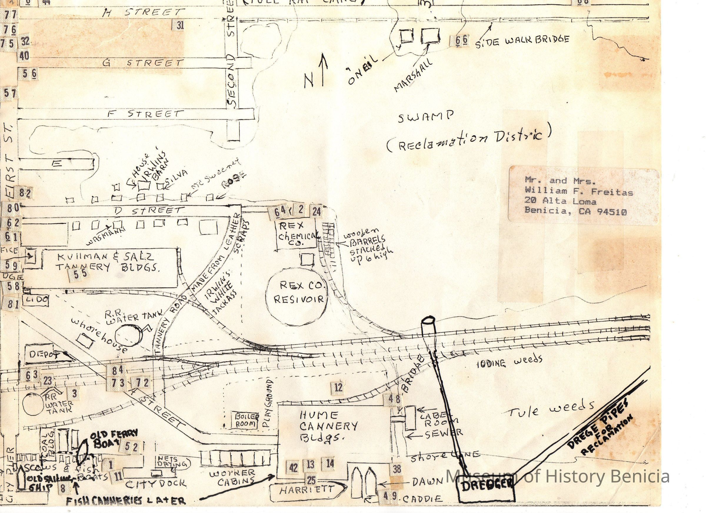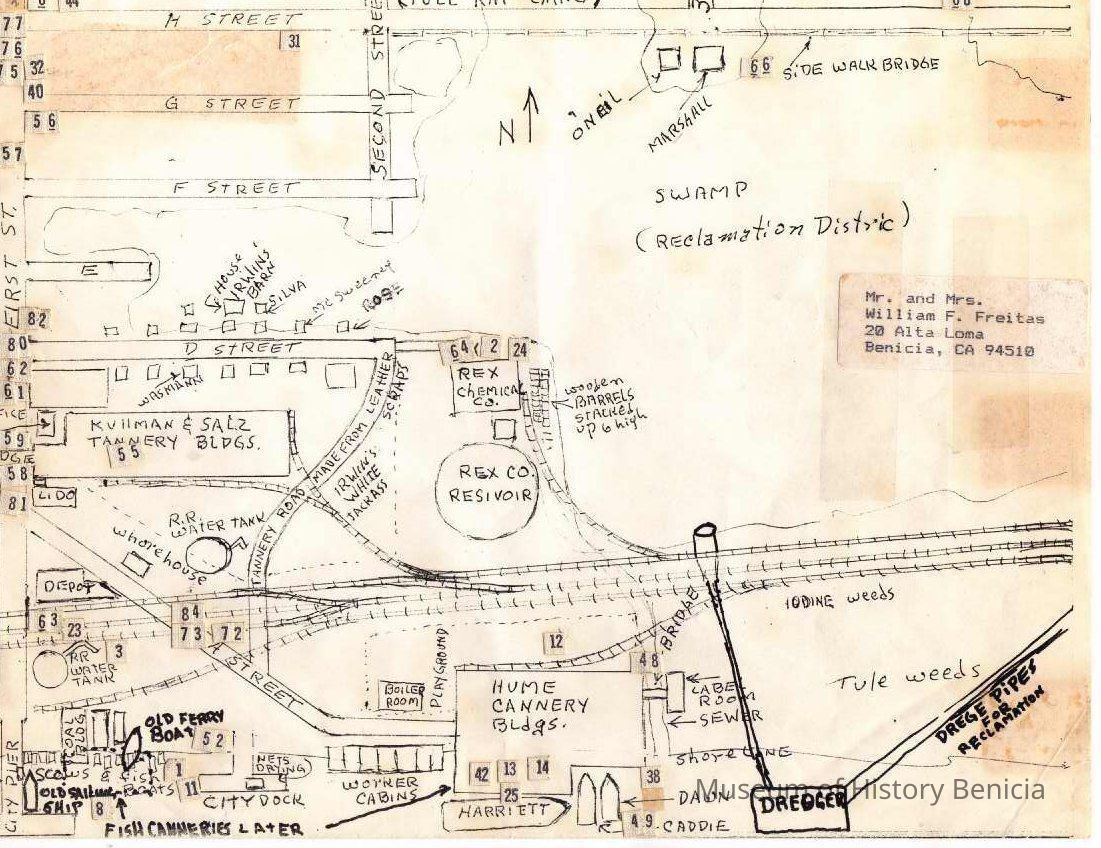 Hand drawn map (not to scale) by Bill Freitas, Benicia Resident, from memory of the 1930's era Benicia